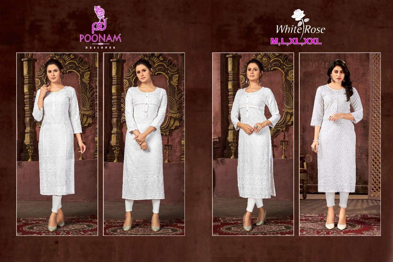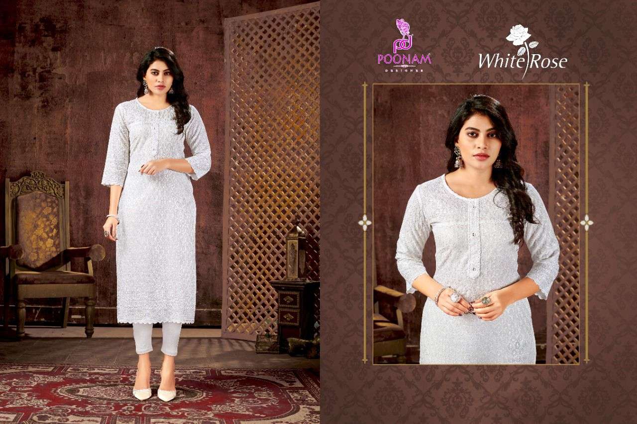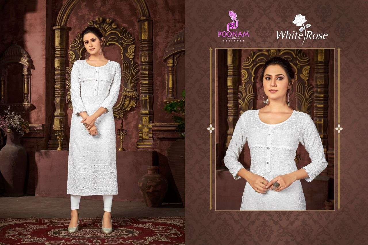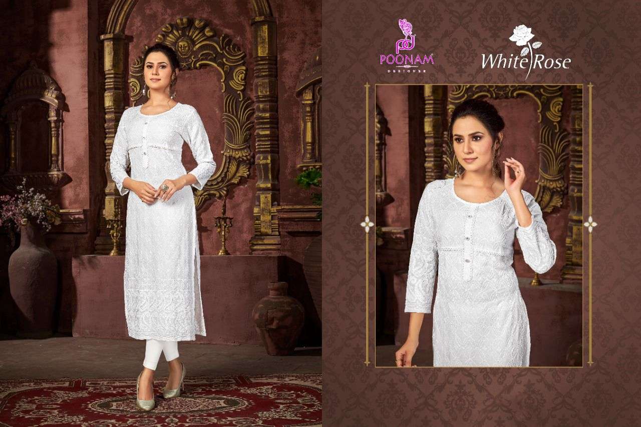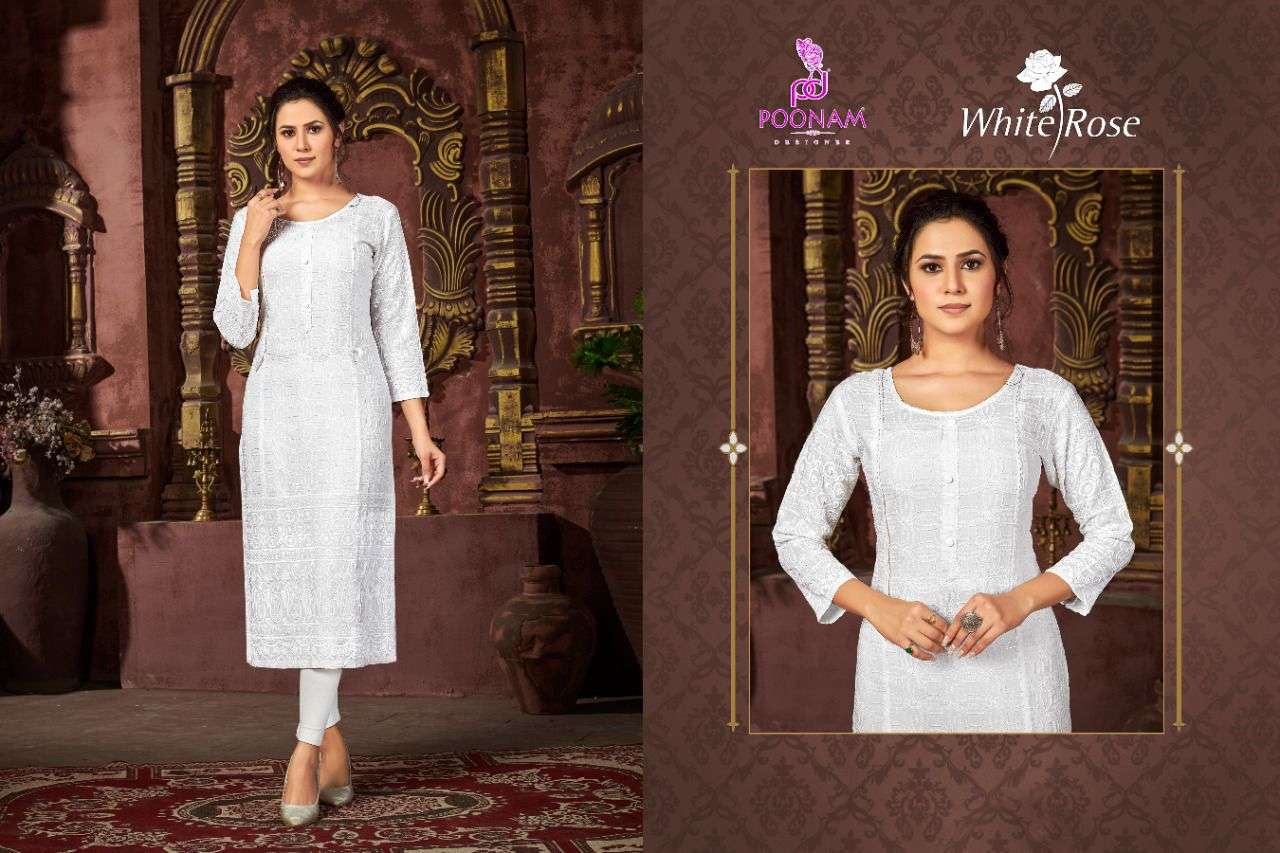 poonam white rose rayon chikan work simple wear fancy kurti