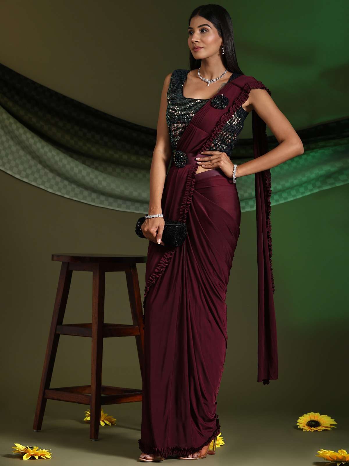 READYMADE SAREES DESIGN NO 101007 SAREE IMPORTED FABRIC (LYCRA) WITH SEQUIN WORK BELT + PALLU ON SEQUIN WORK BROOCH SIZE 36(READY) 3 COLOURS AVAILABLE RATE 1045+5%(GST) |