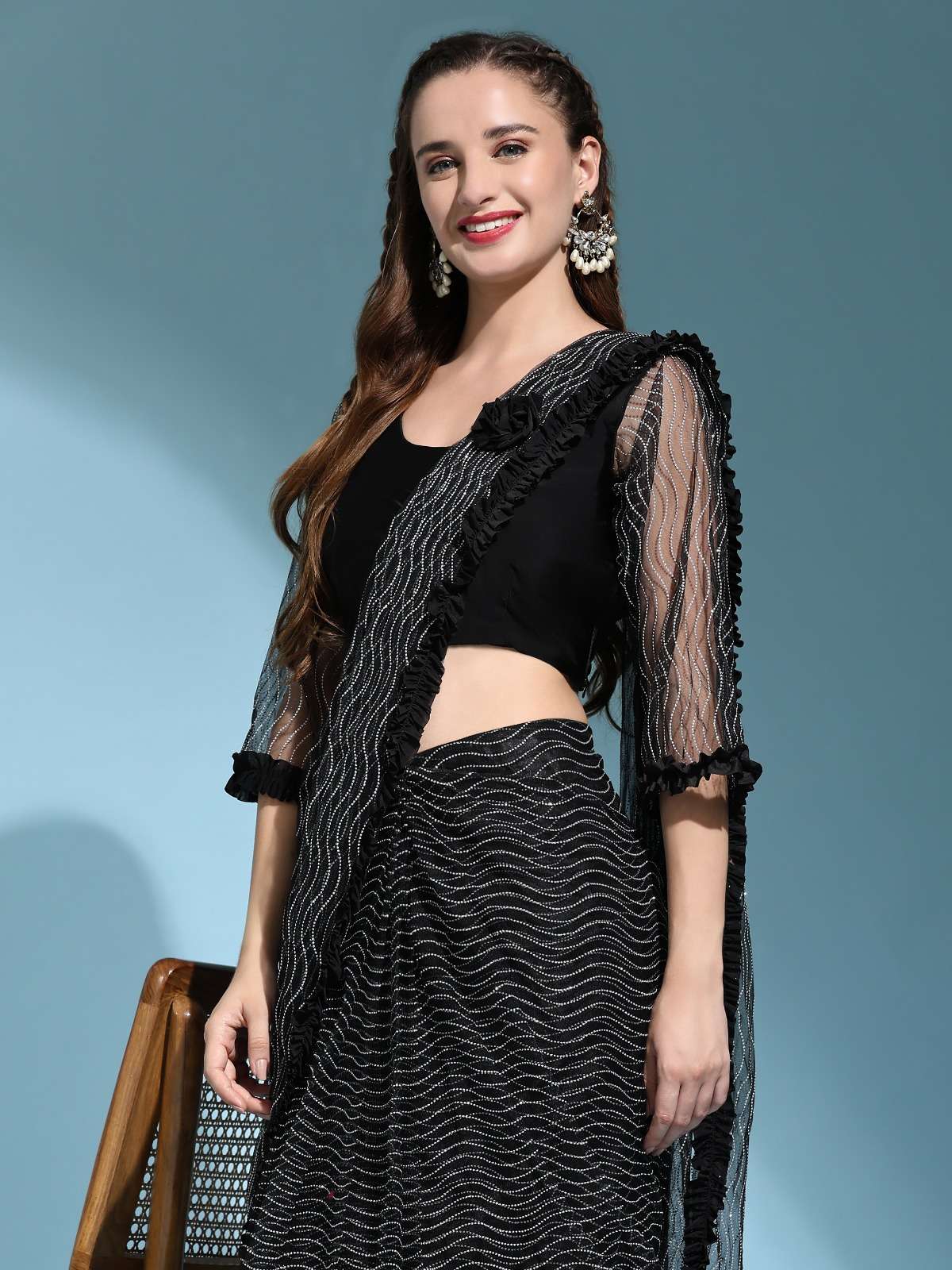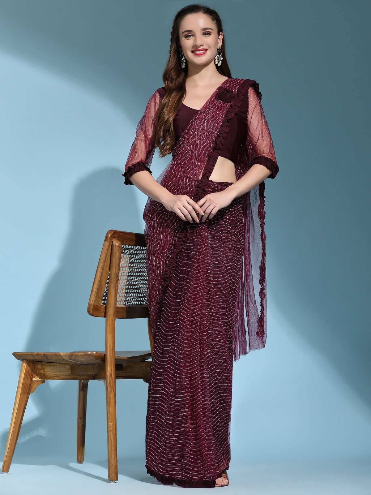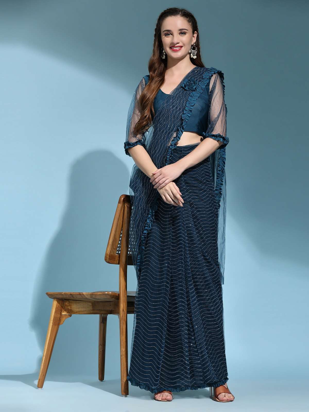 NEW DESIGN READY TO WEAR SAREE DESIGN NO 101013 BLOUSE PLAIN BLOUSE WITH DUE DROP NET SLEEVES IN LITTLE FRIL SAREE DUE DROP NET FABRIC WITH BORDER IN LITTLE FRIL SIZE 36(READY) 5 COLOURS AVAILBLE RATE 995+5% (GST) |