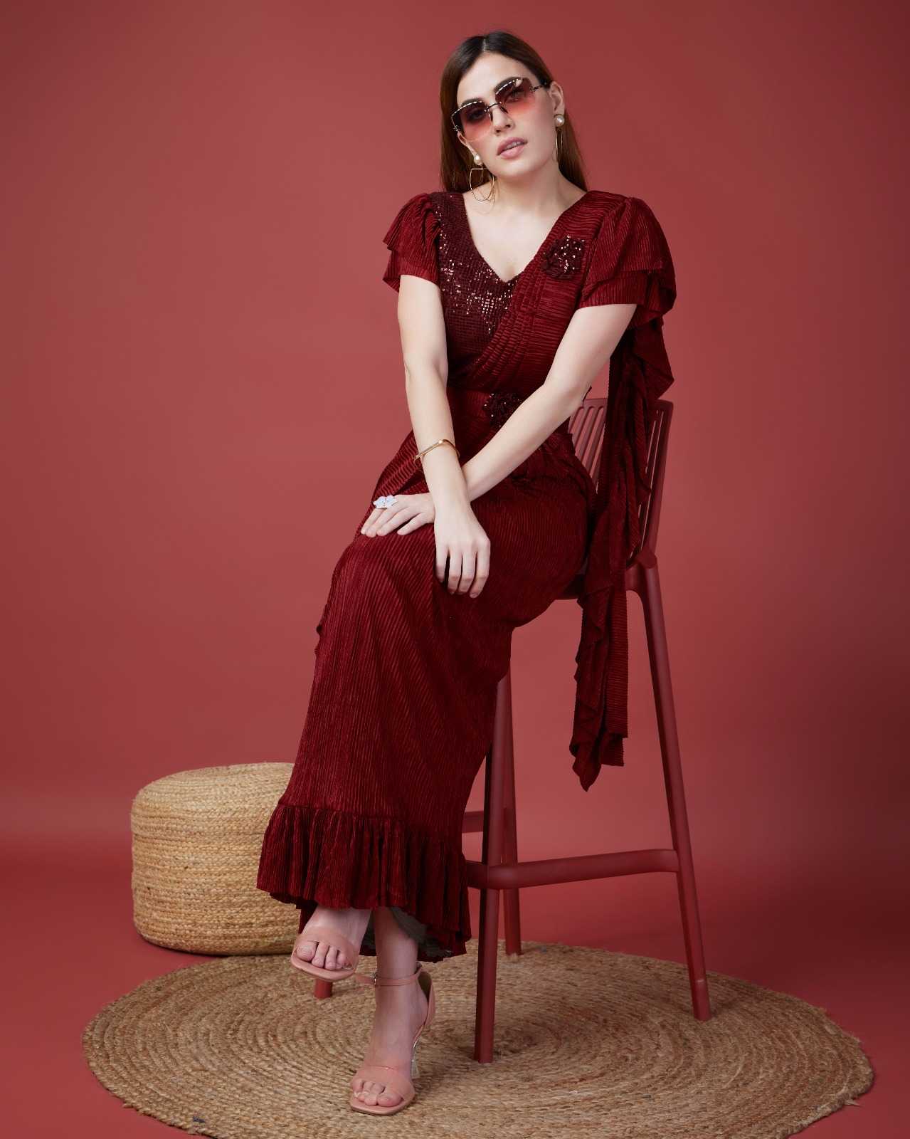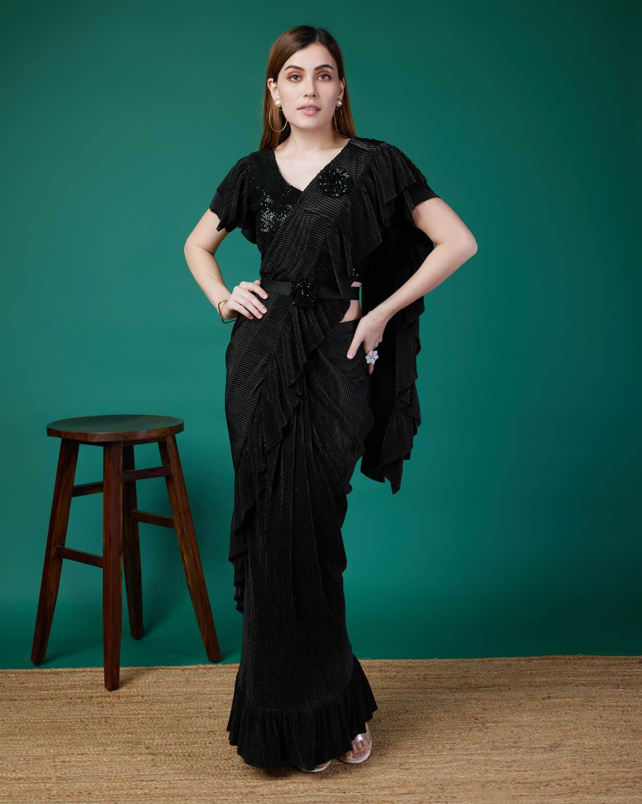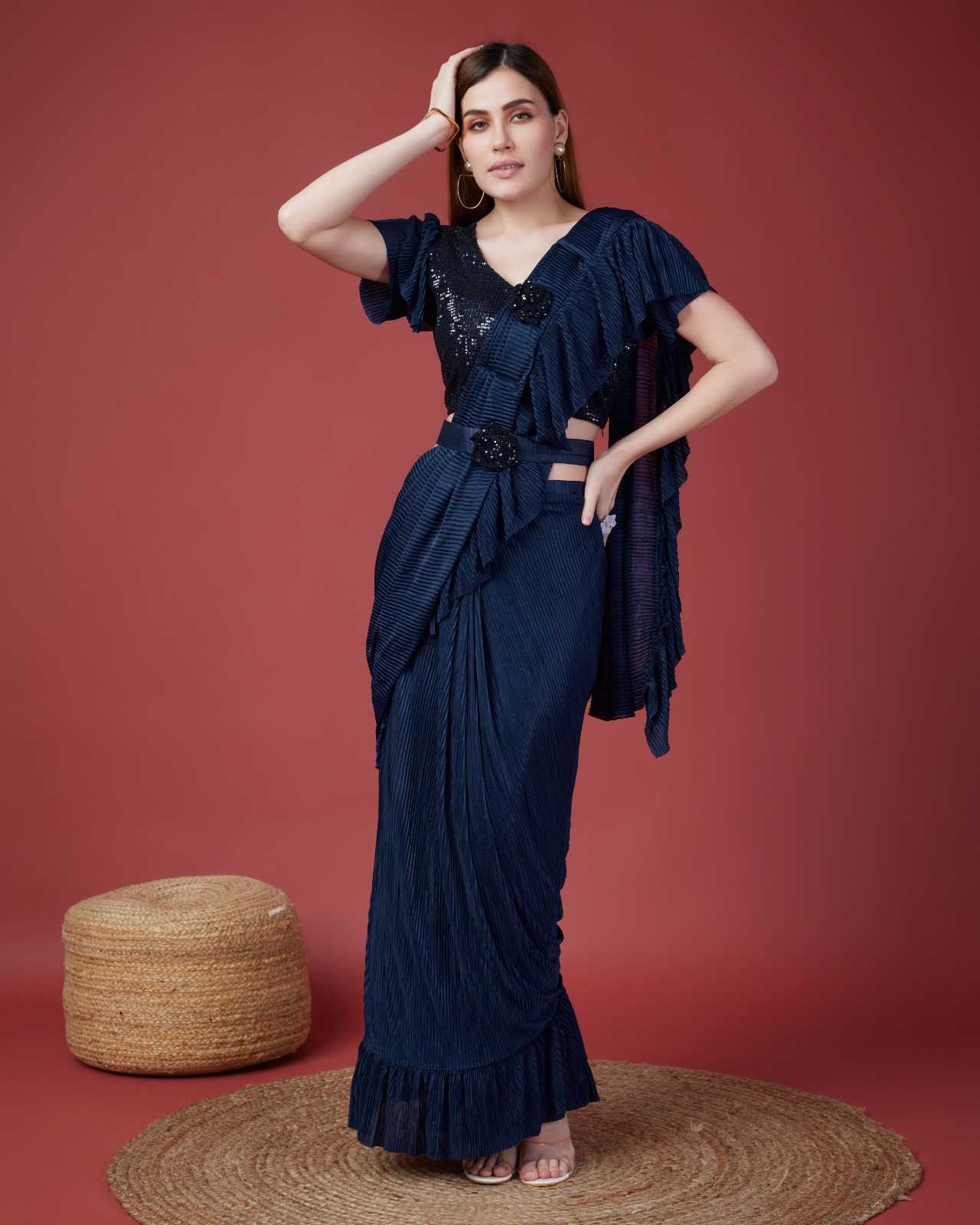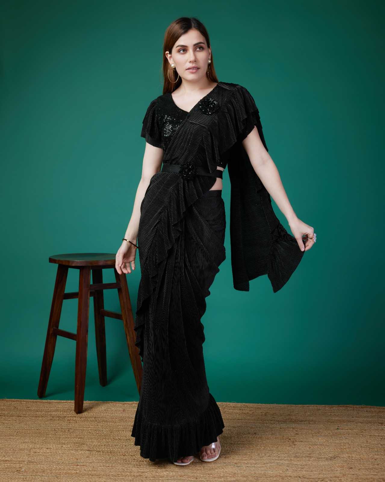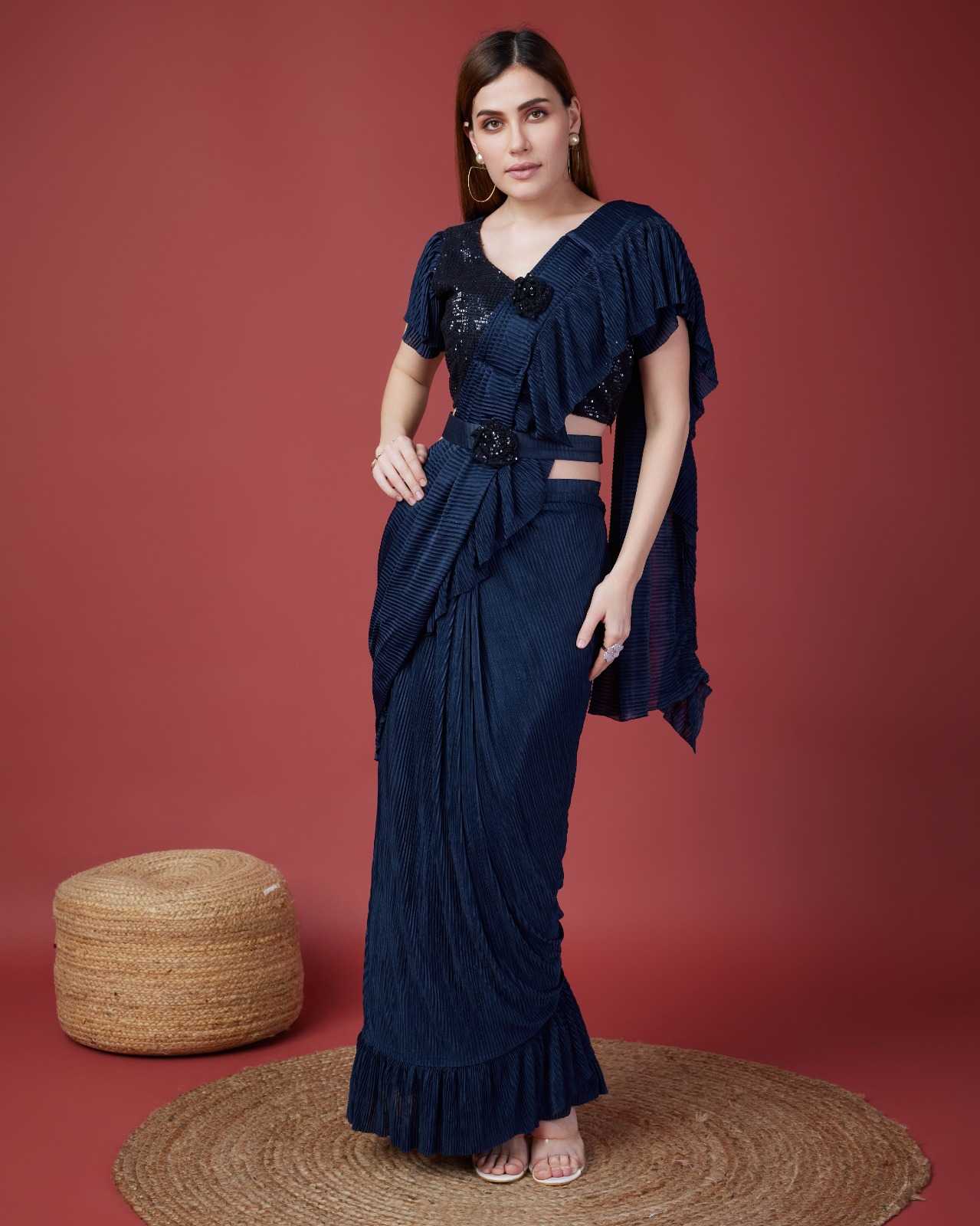 READY TO WEAR SAREE DESIGN NO 101128 BLOUSE IMPORTED CRUSH WITH SEQUIN WORK SAREE IMPORTED CRUSH FABRIC WITH BELT AND ON PALLU BROUCH SIZE 36 (READY) 4 COLOURS AVAIALBLE RATE 1195+5%(GST) |