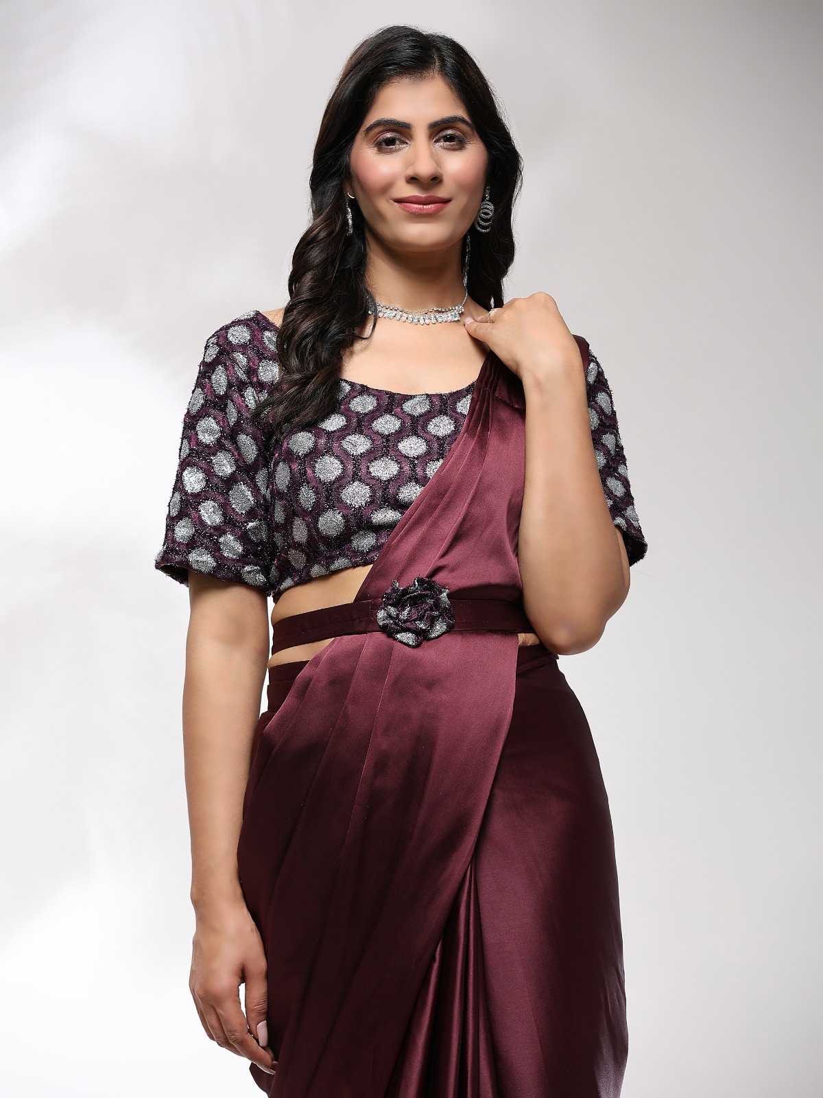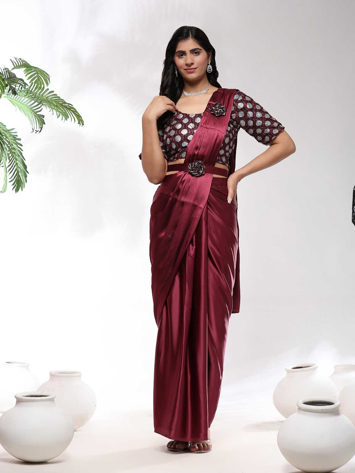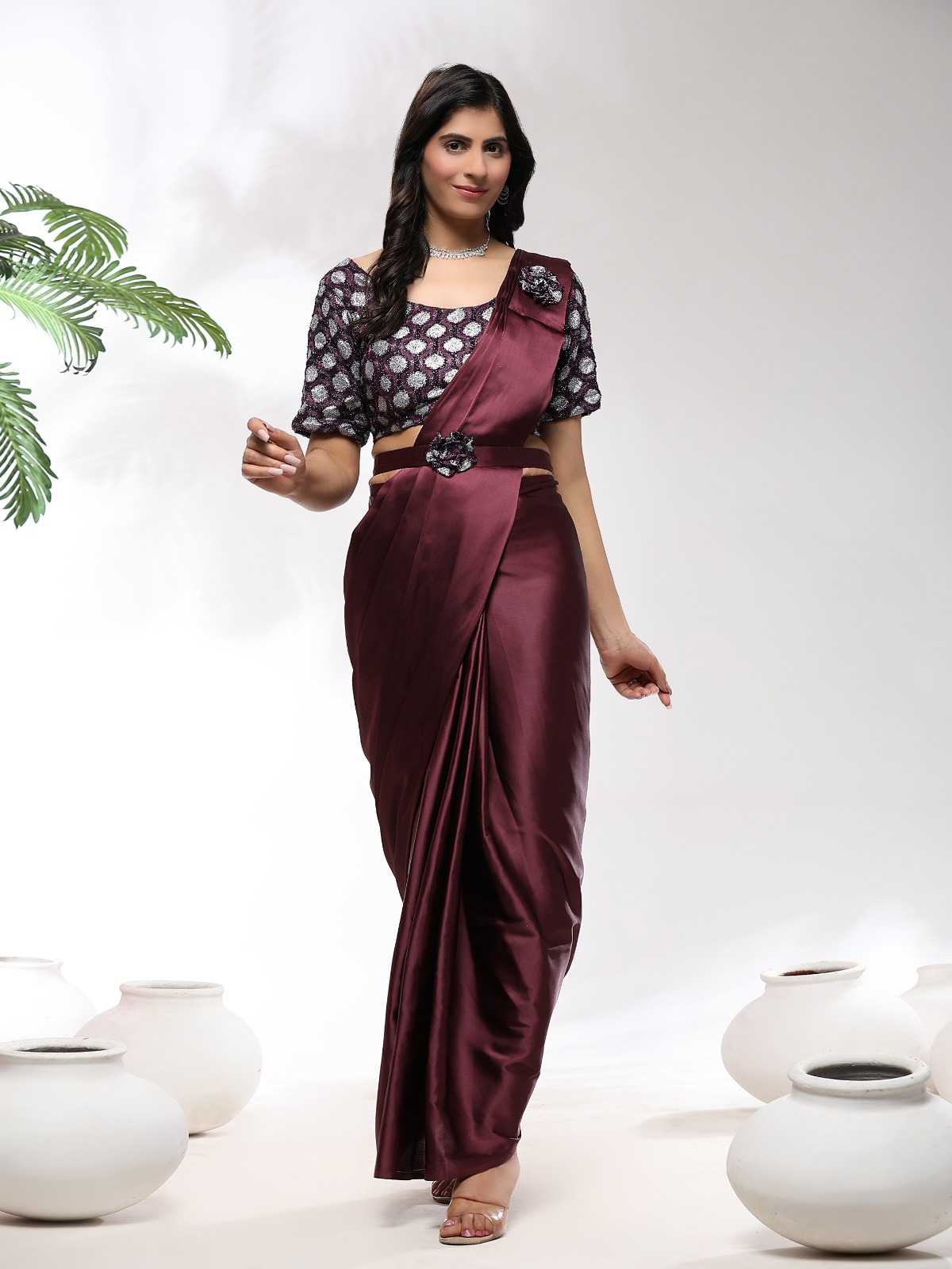 READY TO WEAR SAREES DESIGN NO 101202 SAREE IMPORTED SATIN FABRIC AND BELT SIZE 36(READY) 4 COLOURS AVAILABLE RATE 1275+5%(GST) |