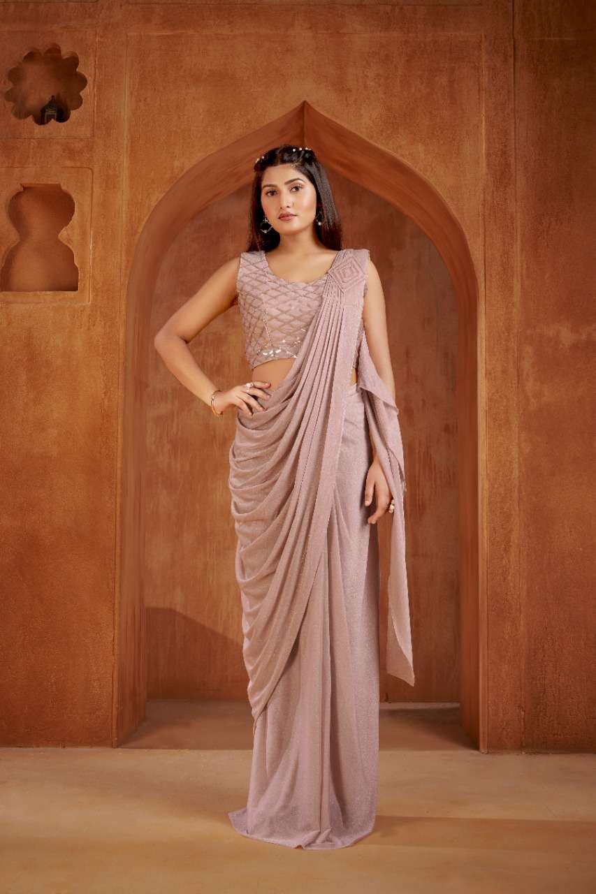 Ready to wear Saree Design No.1015951 Fabric- Imported Metallic shimmer Fully Stiched sarees with designer work Blouse with half sleeve inside 5 colors available Rate-1695+5% gst extra |