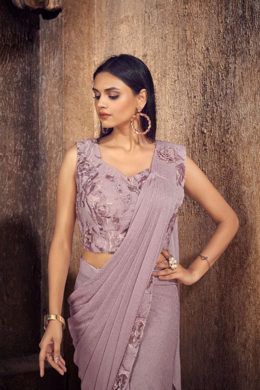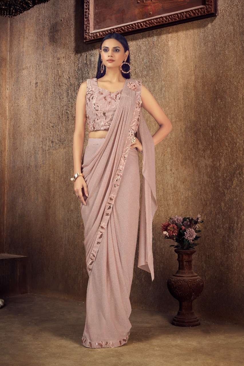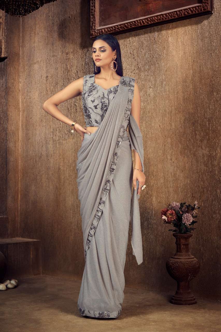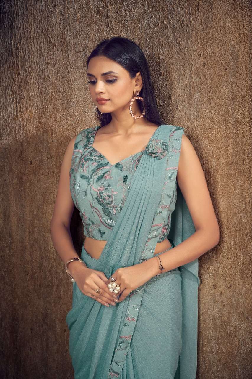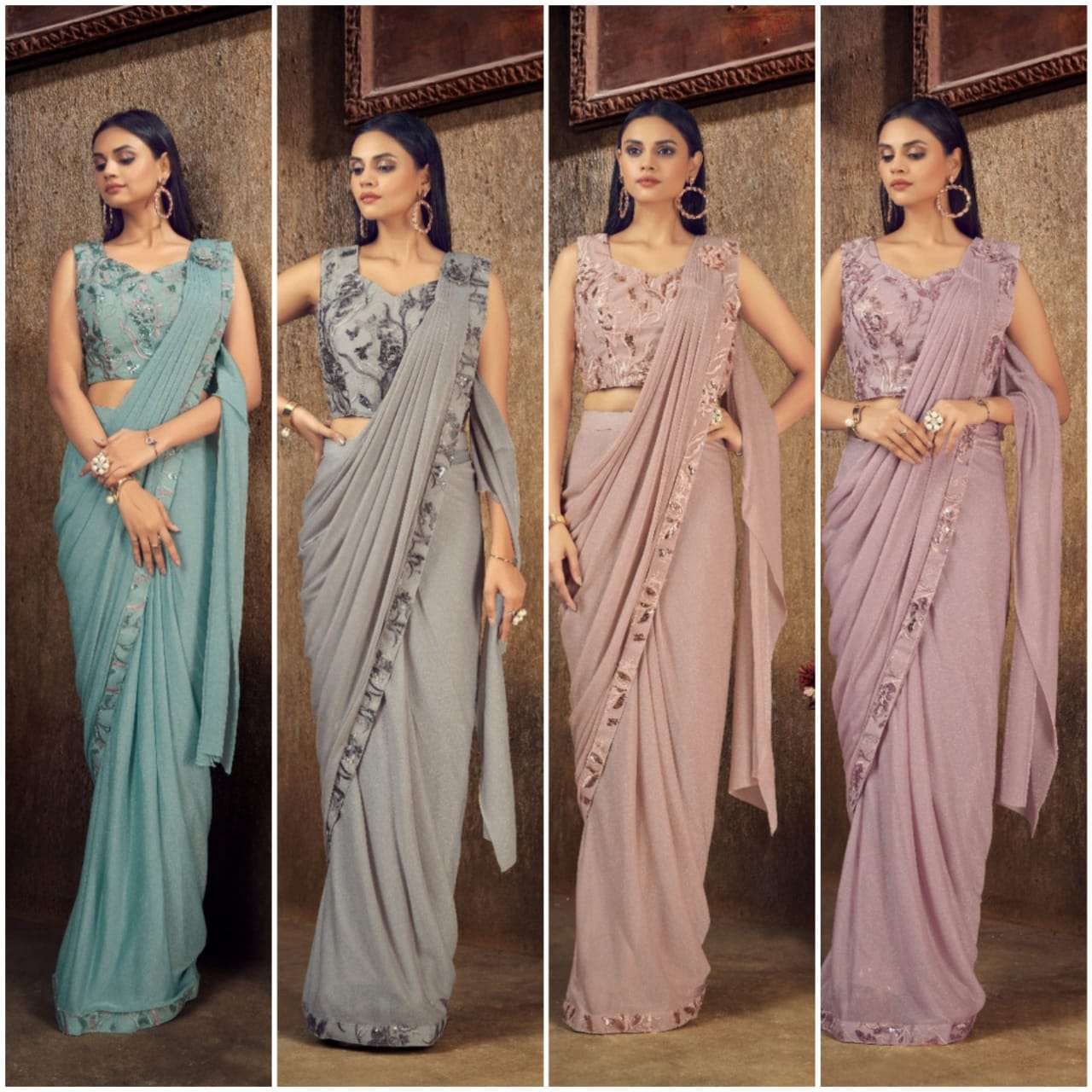 Ready to wear Saree Design No.1015987 Fabric-Imported Metallic shimmer Fully Stitched saree and Stitched Embroidery design Blouse 4 colors Half sleeves Inside Rate-2195+5% gst extra |