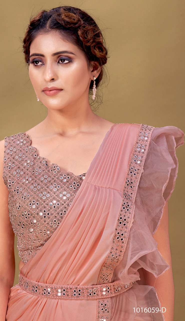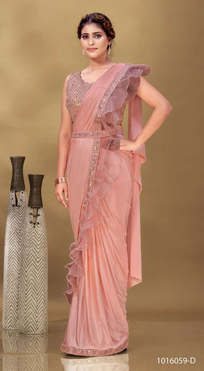 Ready to wear Saree Design No.1016059 Fabric- Imported Lycra With Organza Frills Fully Stiched saree and Stiched mirror Blouse With designer belt Rate-2495+5% gst extra |