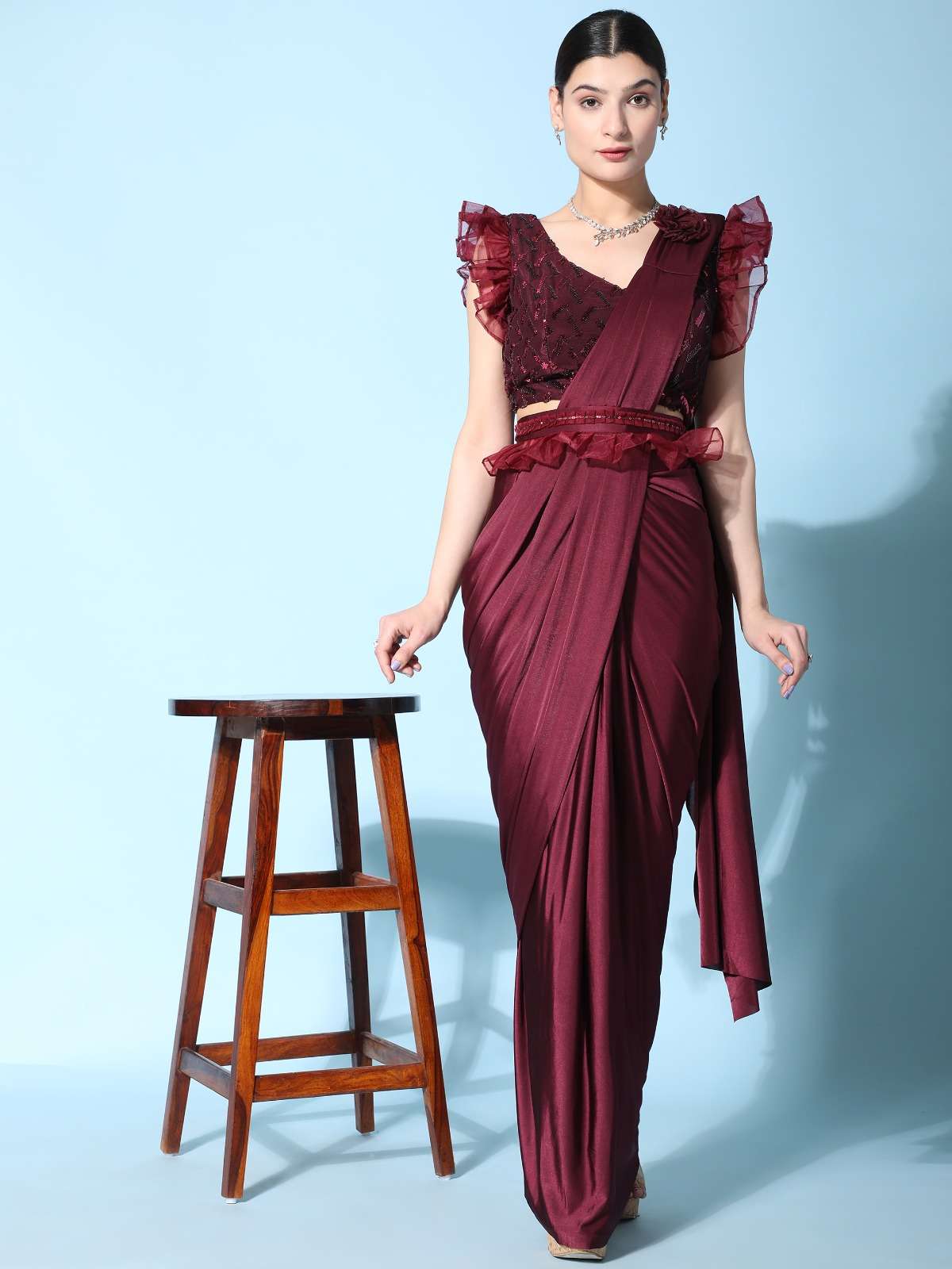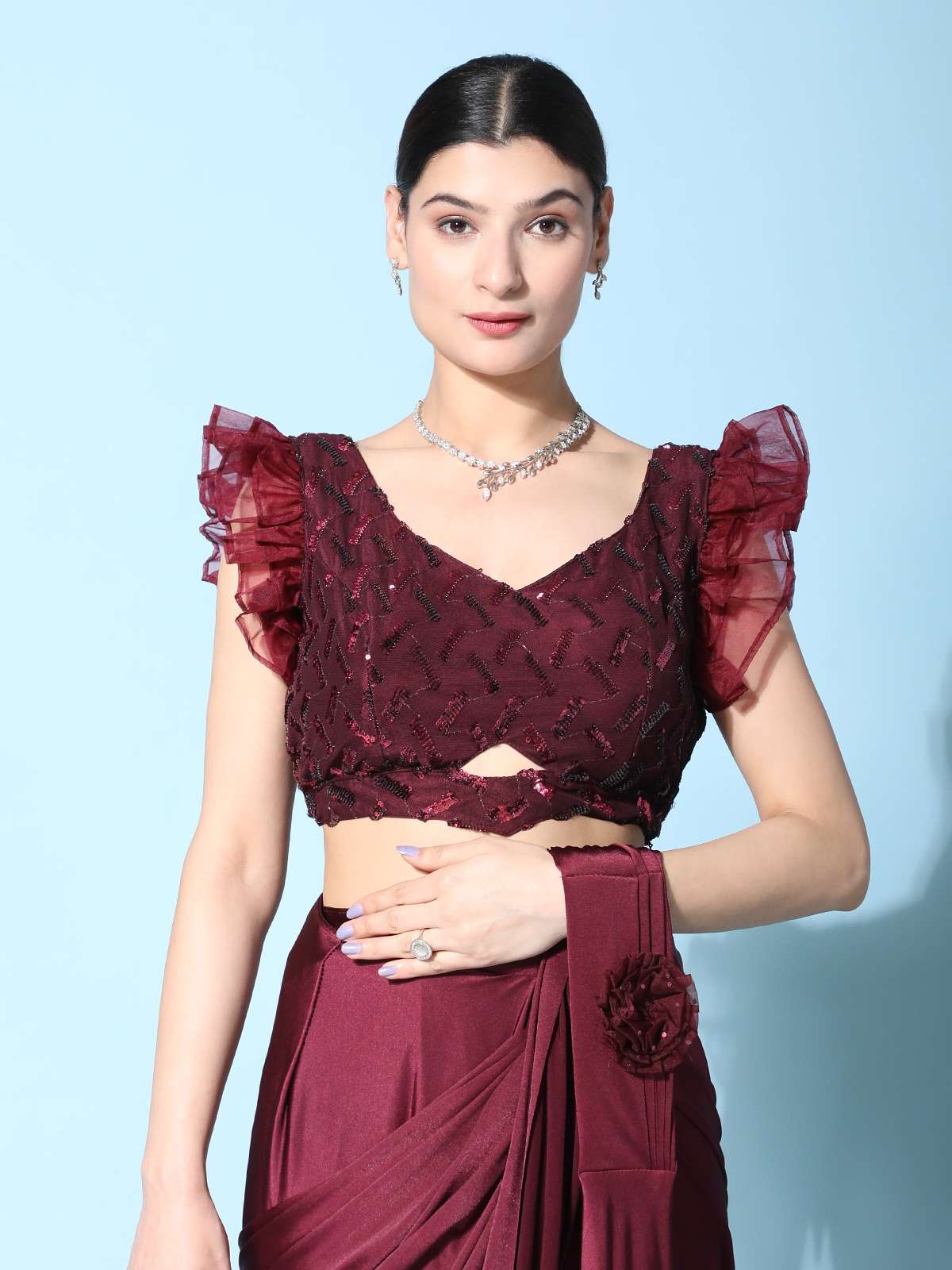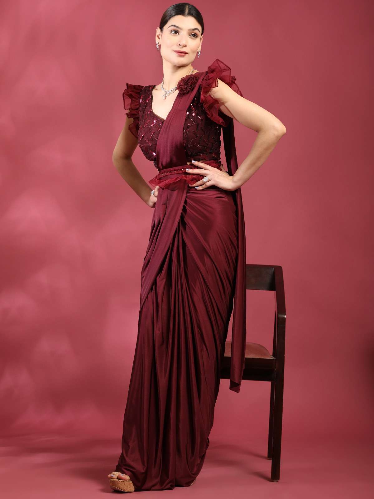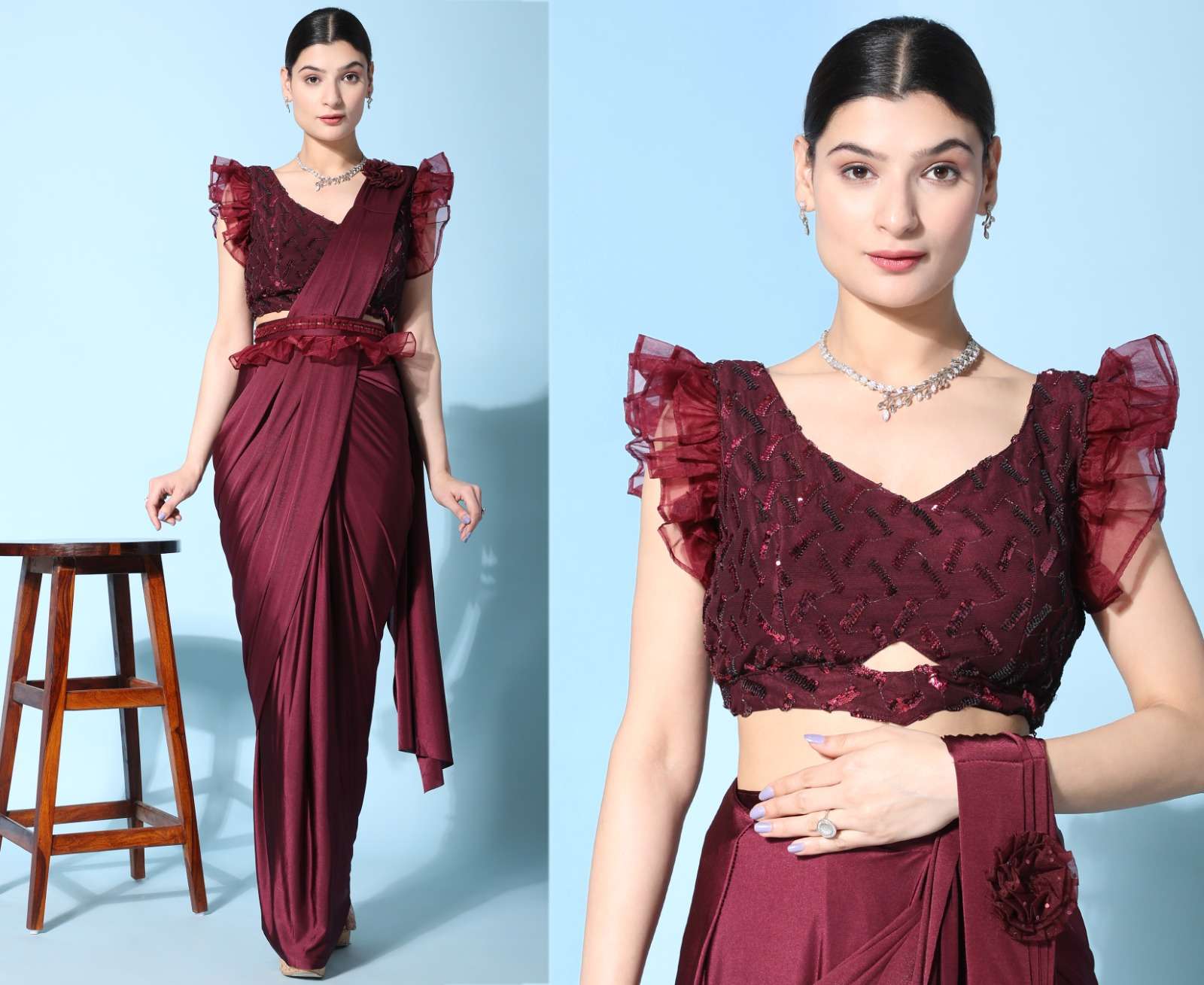 pr 1016403 ready to wear fancy saree with ruffle sleeve blouse and sequin work belt supplier