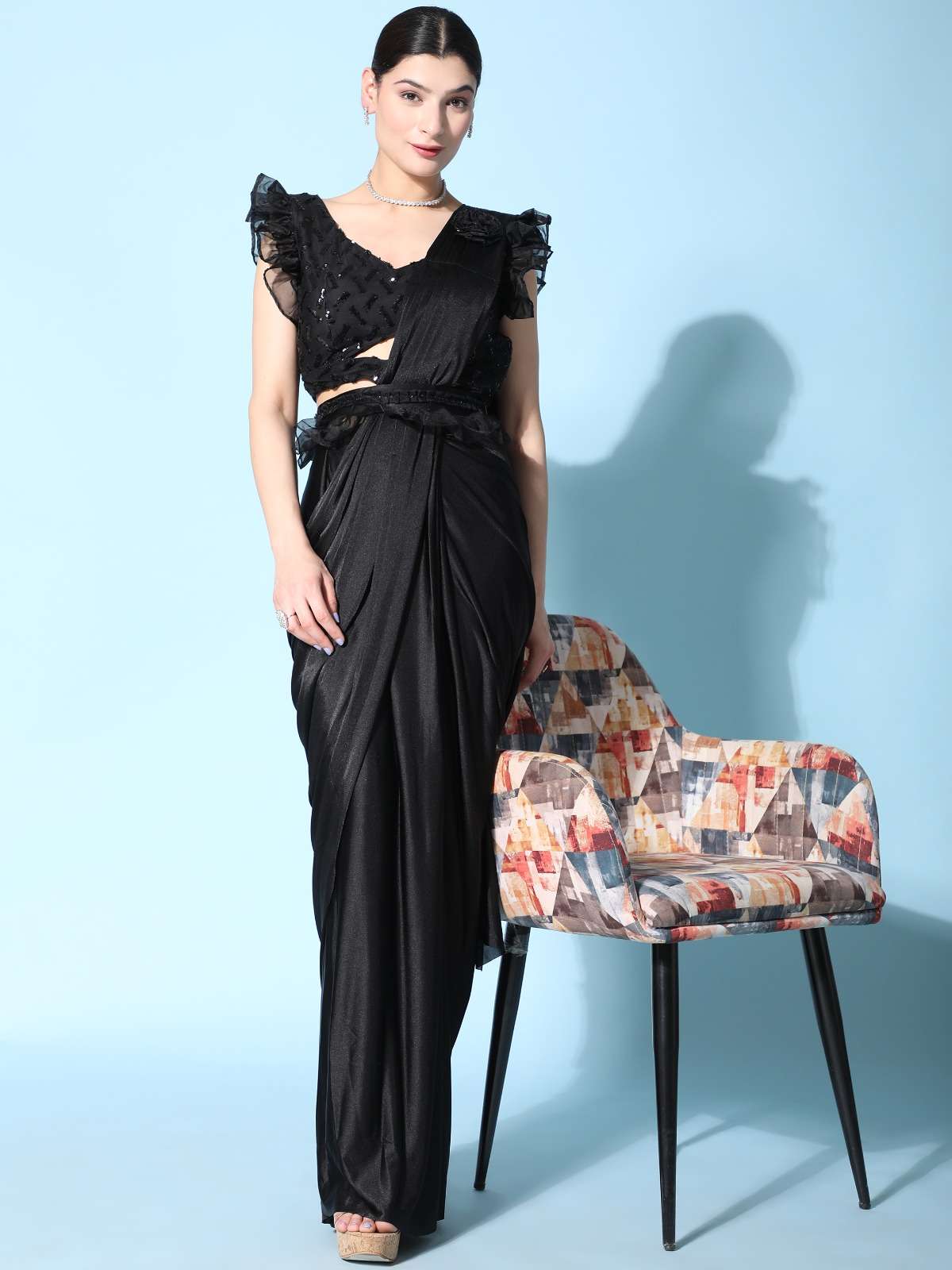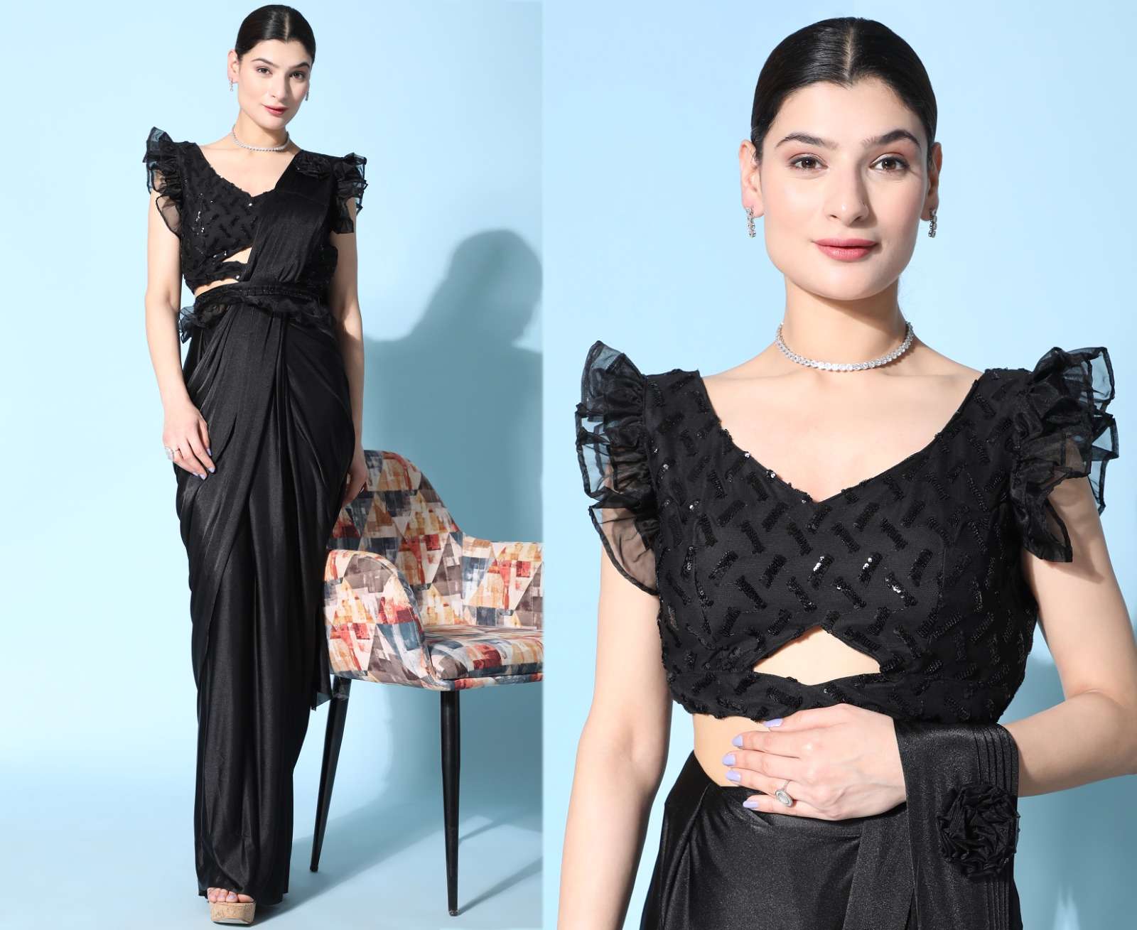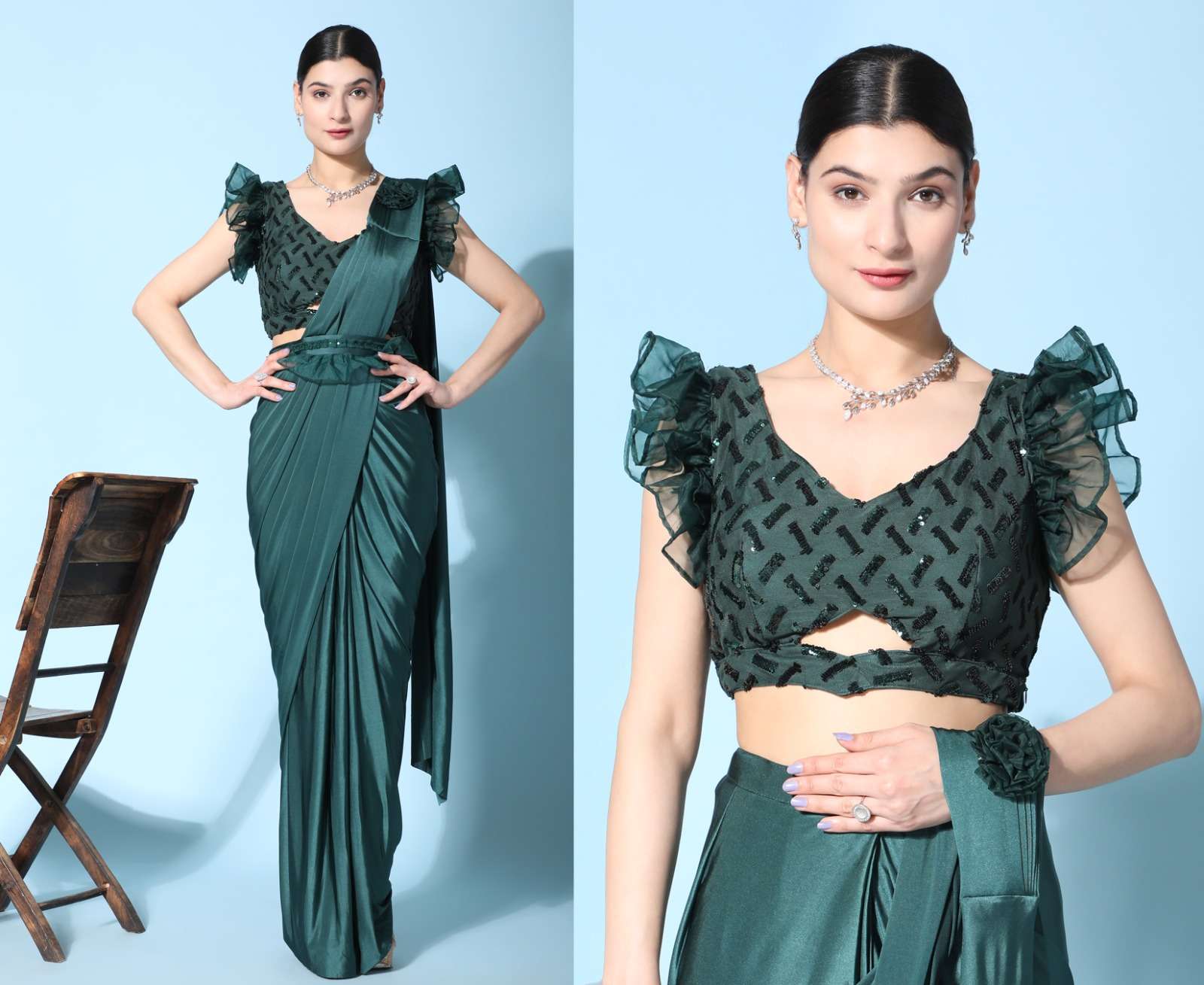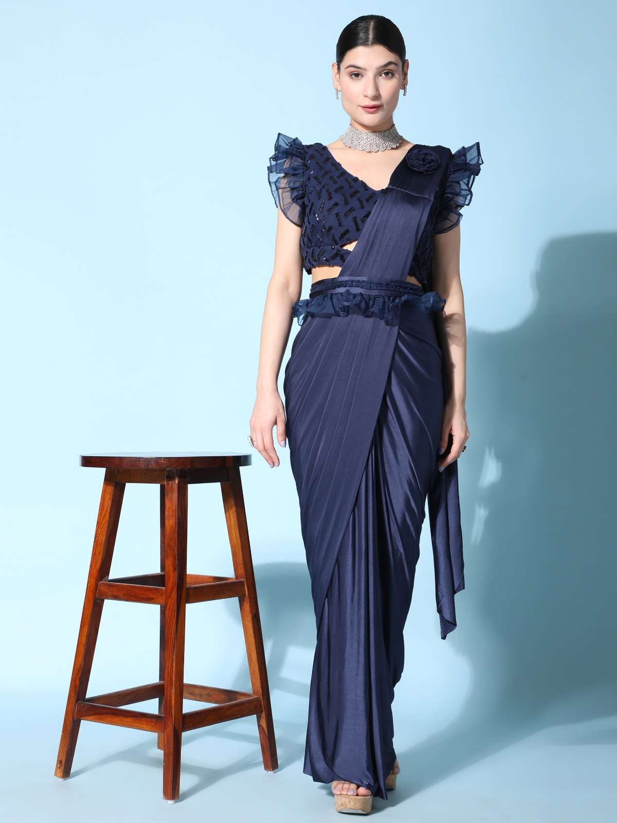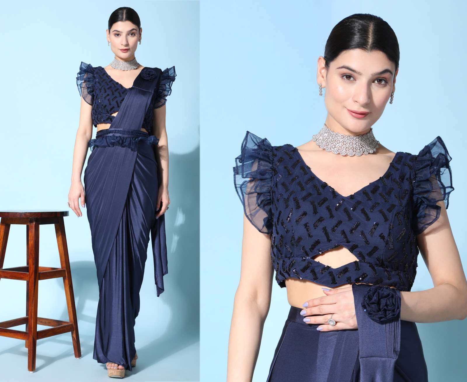 pr 1016403 ready to wear fancy saree with ruffle sleeve blouse and sequin work belt supplier