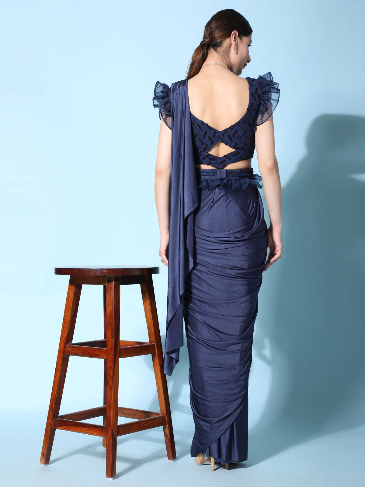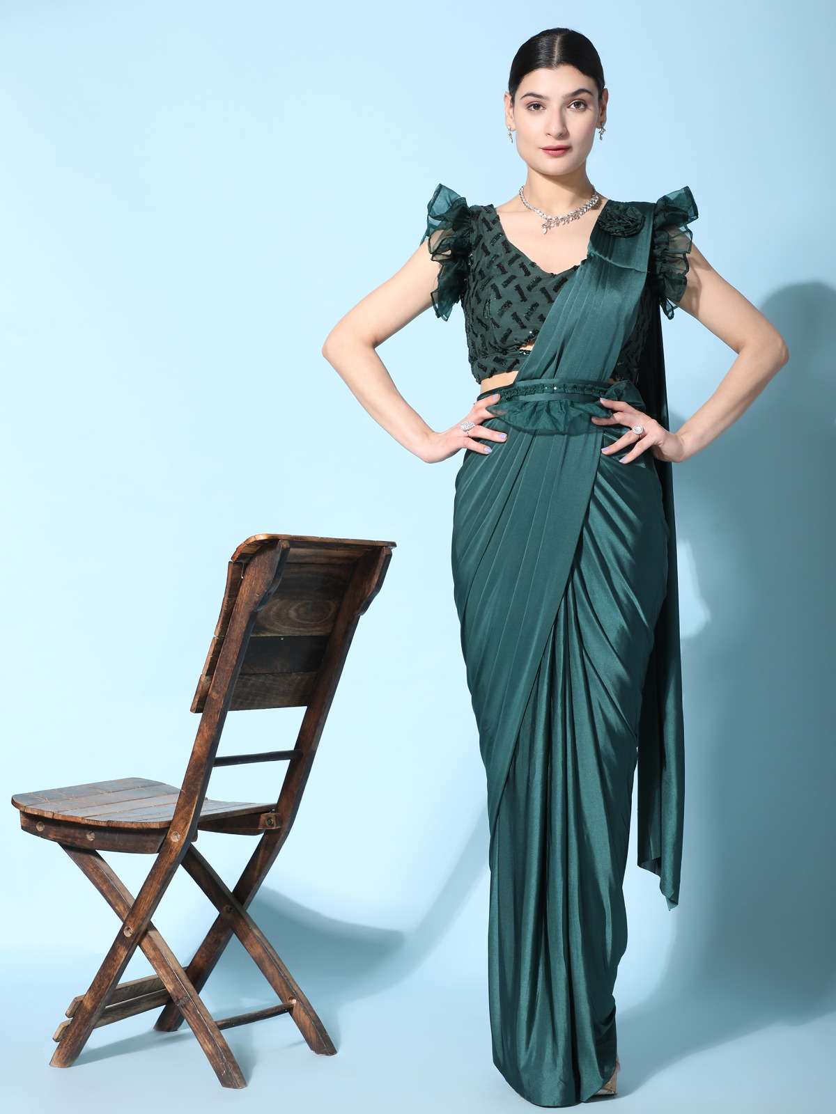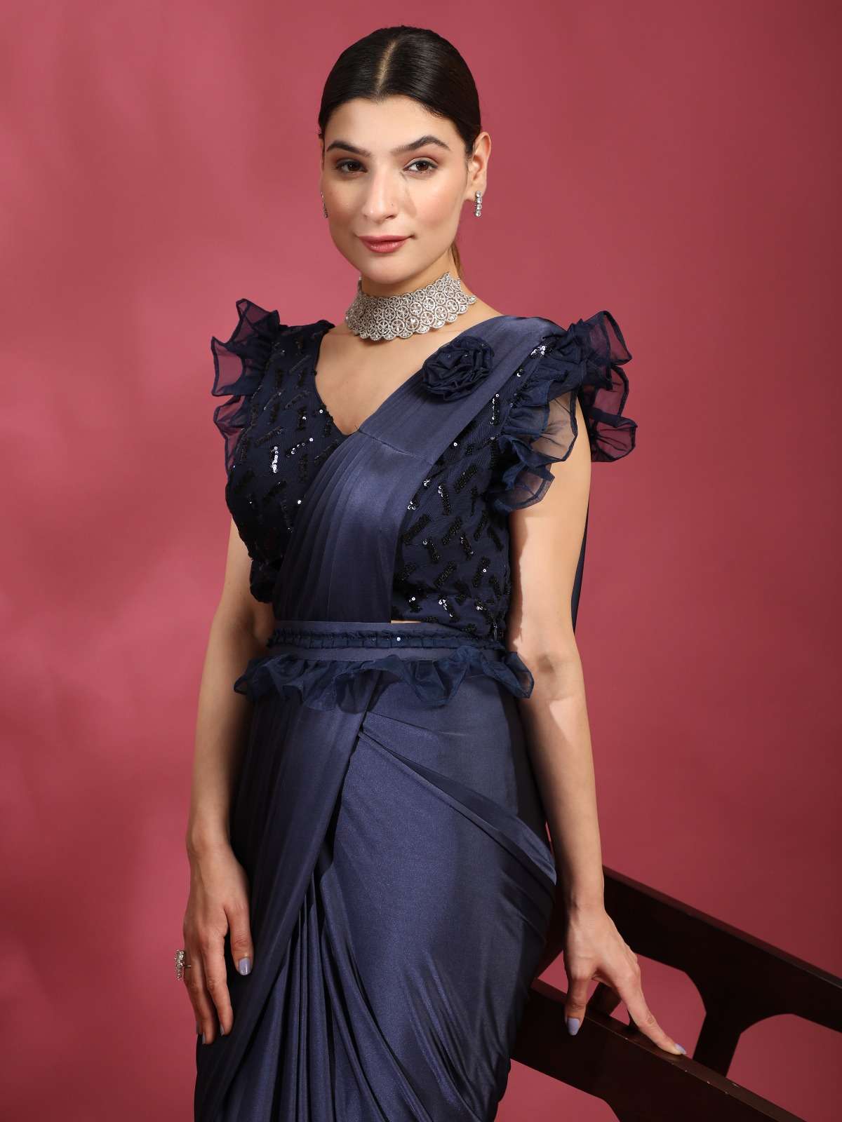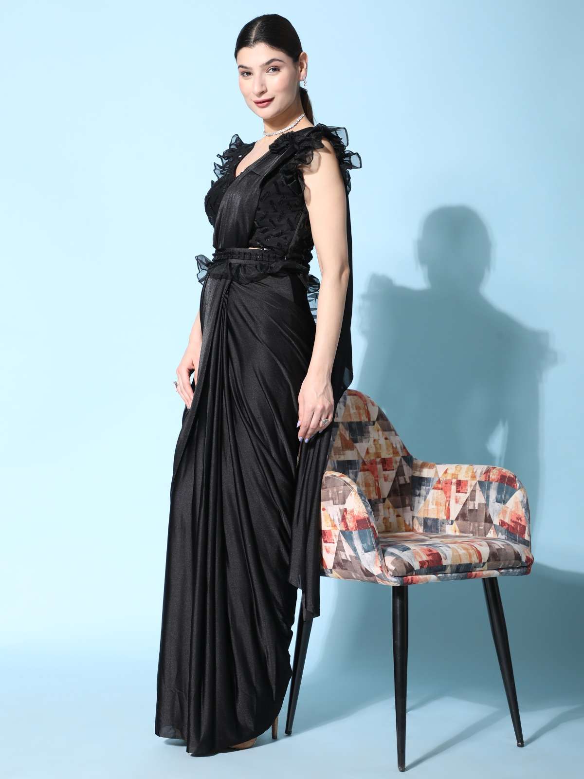pr 1016403 ready to wear fancy saree with ruffle sleeve blouse and sequin work belt supplier
