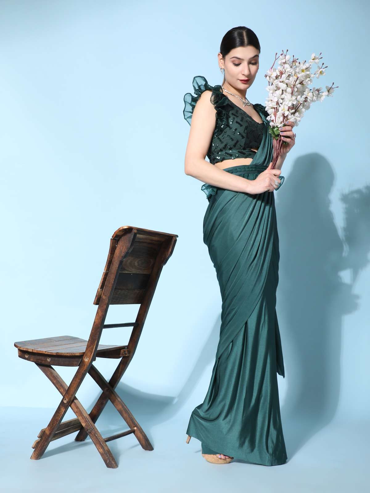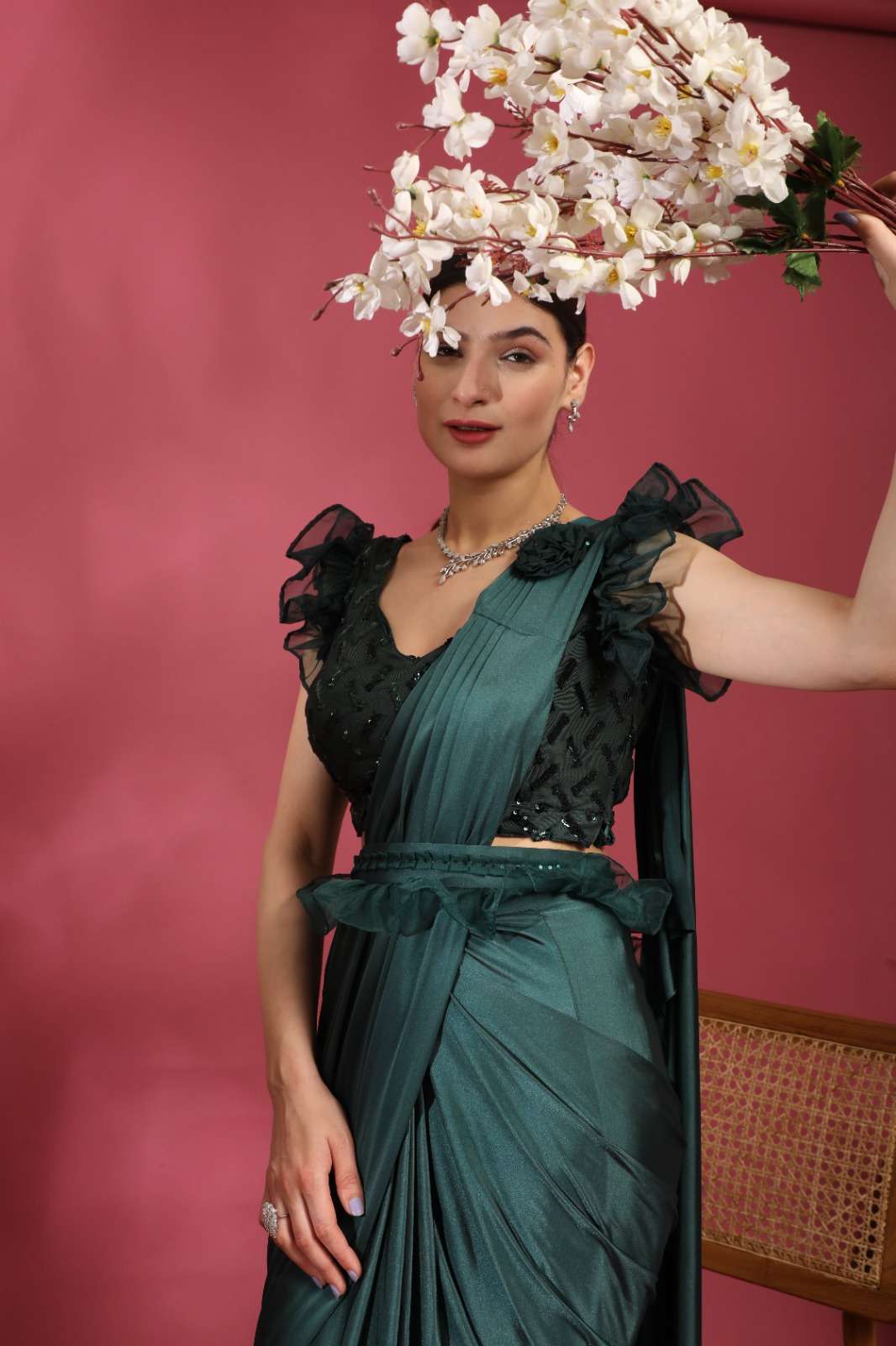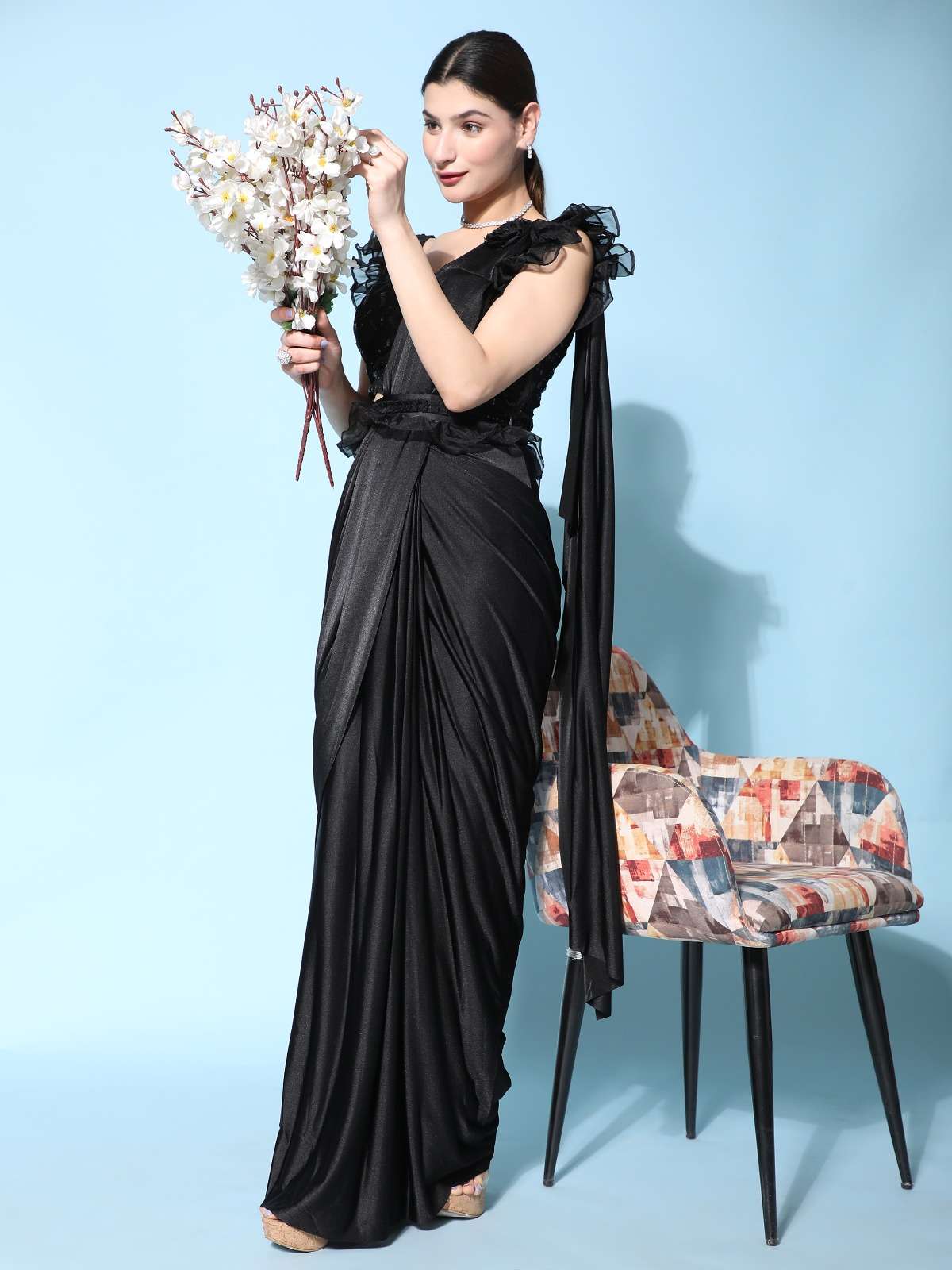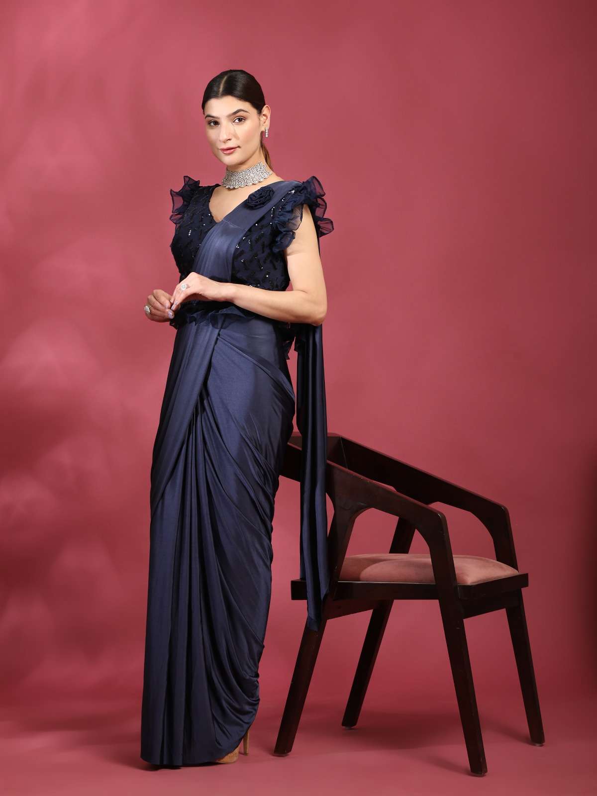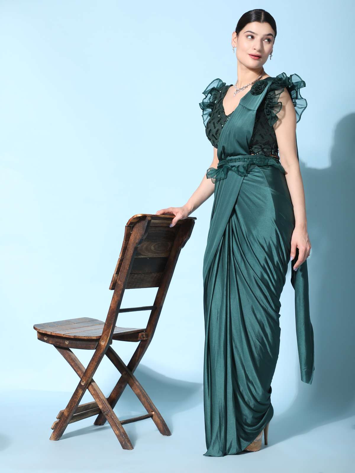 pr 1016403 ready to wear fancy saree with ruffle sleeve blouse and sequin work belt supplier