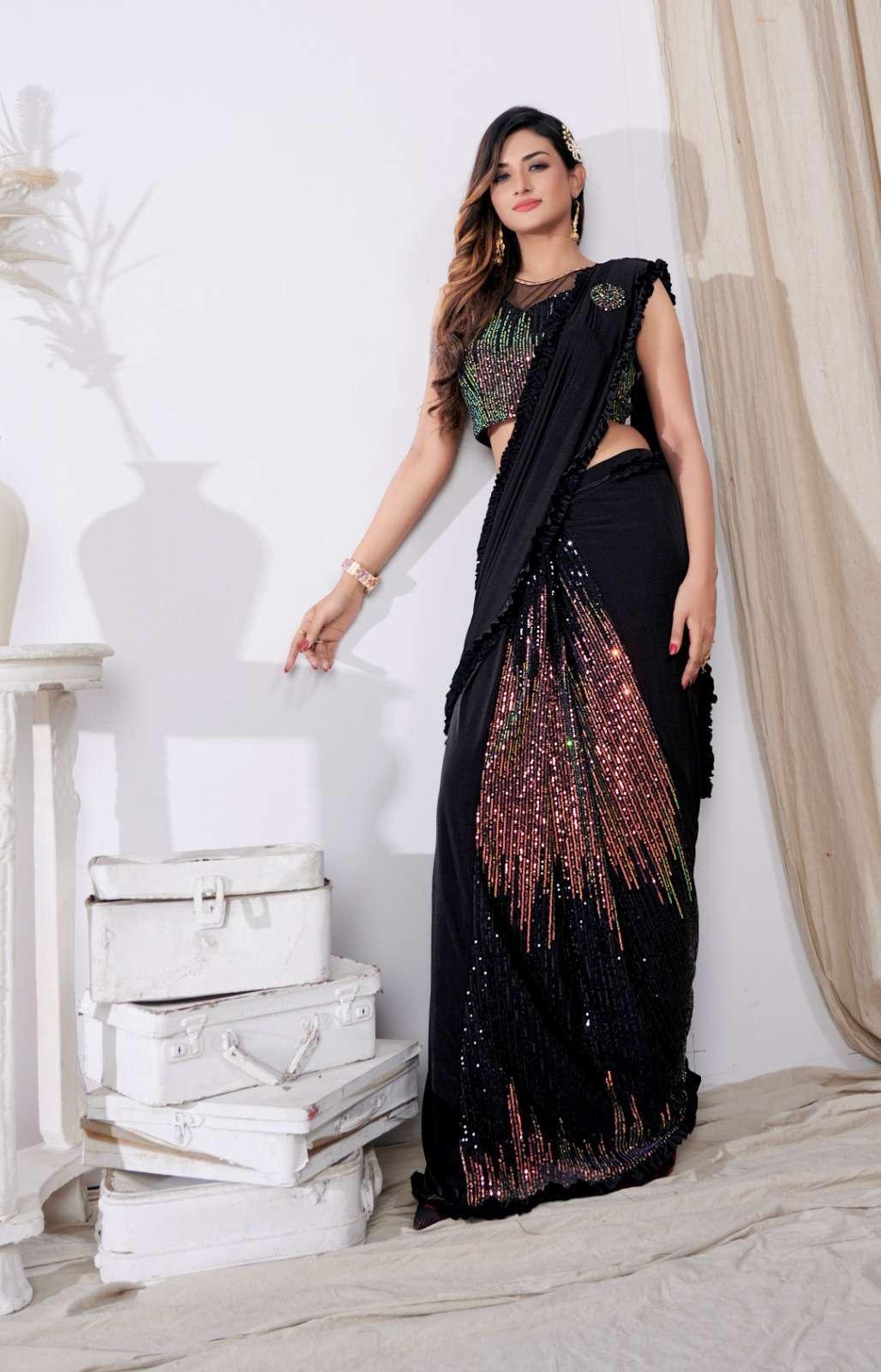 READY TO WEAR SAREE DESIGN NO 101790 BLOUSE EXQUSITE SEQUIN WORK SAREE IMPORTED(LYCRA) FABRIC WITH PLAIT IN SEQUIN WORK WITH ON PALLU BROOCH +LITTLE FRILL SIZE 36 (READY) 3 COLOURS AVAILABLE RATE 1225+5% (GST) |