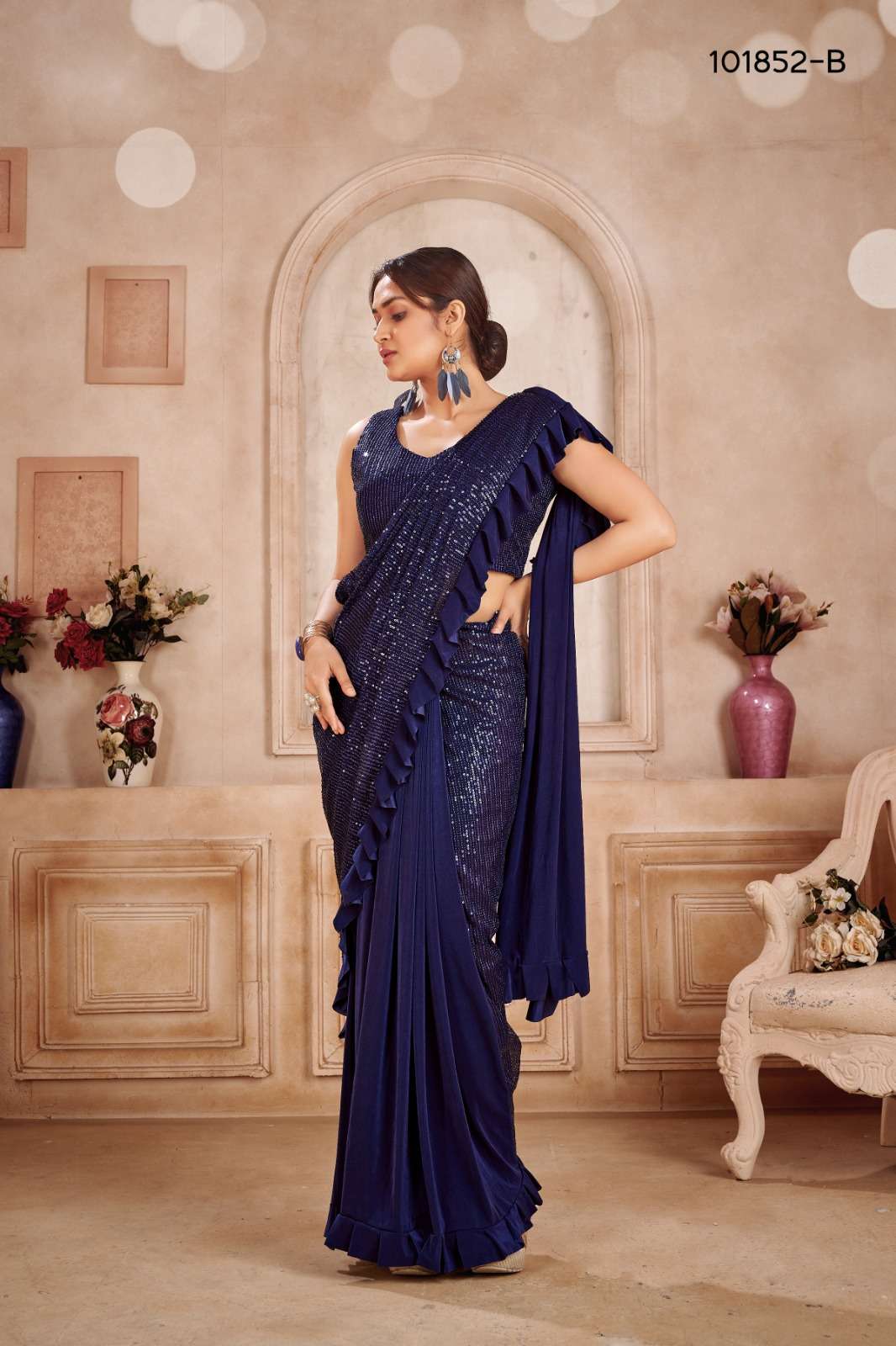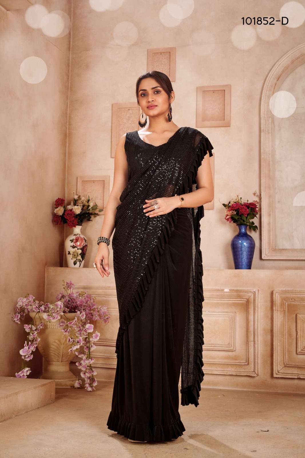 READY TO WEAR SAREE DESIGN 101852 BLOUSE EXQUISITE SEQUIN WORK SAREE IMPORTED FABRIC WITH SEQUIN WORK SIZE 36 (READY) 4 COLOURS AVAILABLE RATE 1325 +5% (GST) |