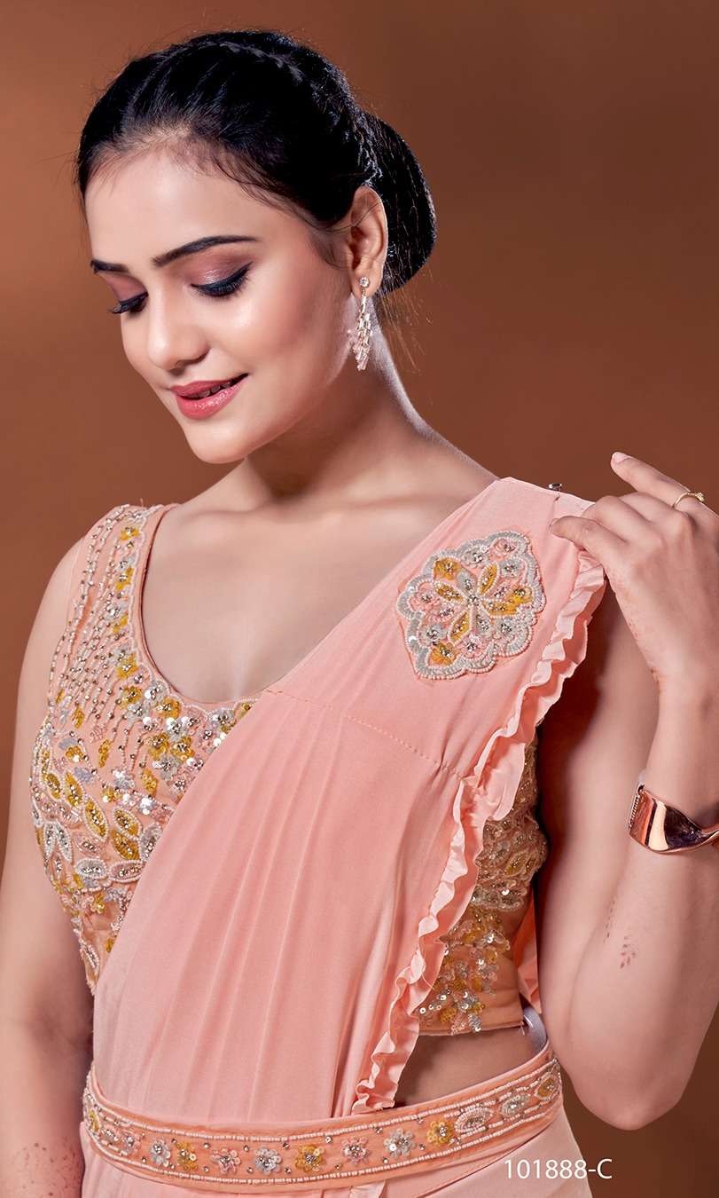 READY TO WEAR SAREES DESIGN NO 101888 BLOUSE EXQUISITE HANDWORK SAREES IMPORTED FABRIC WITH HANDWORK BELT SIZE 36 (READY) 3 COLOURS AVAILABLE RATE 1995+5%GST |