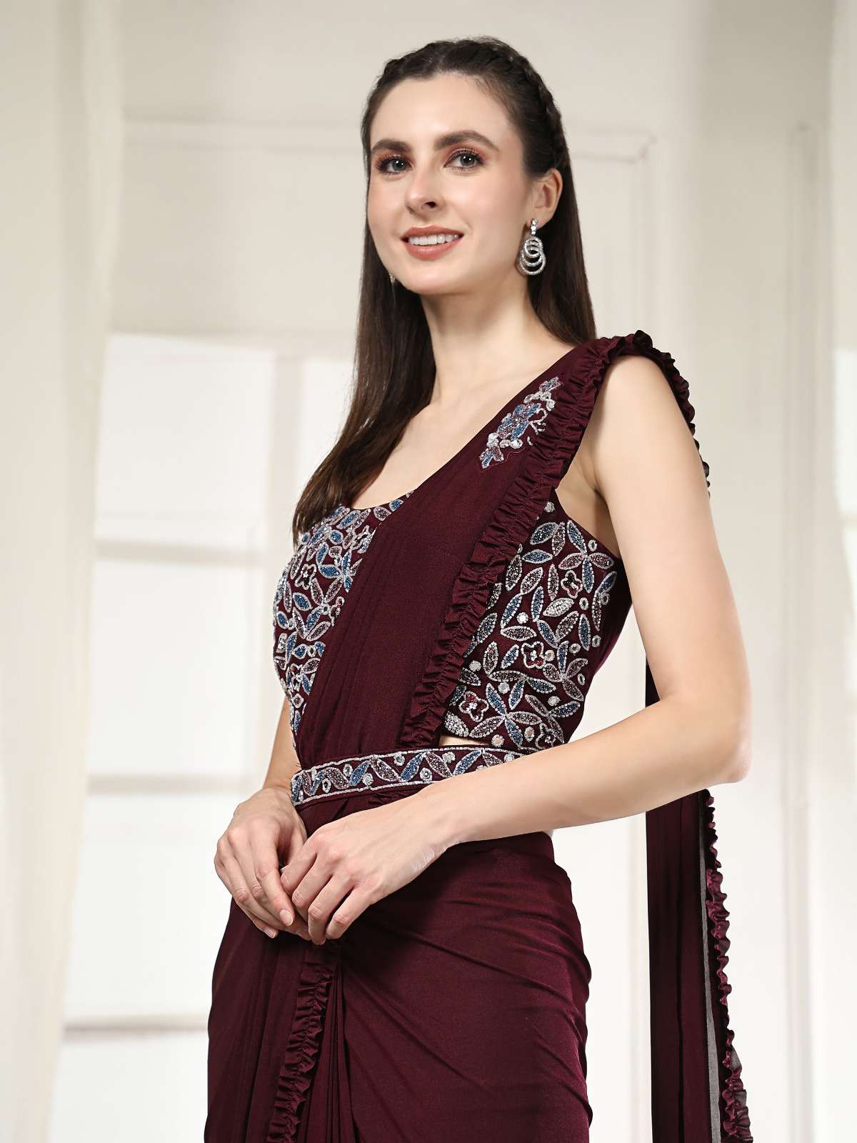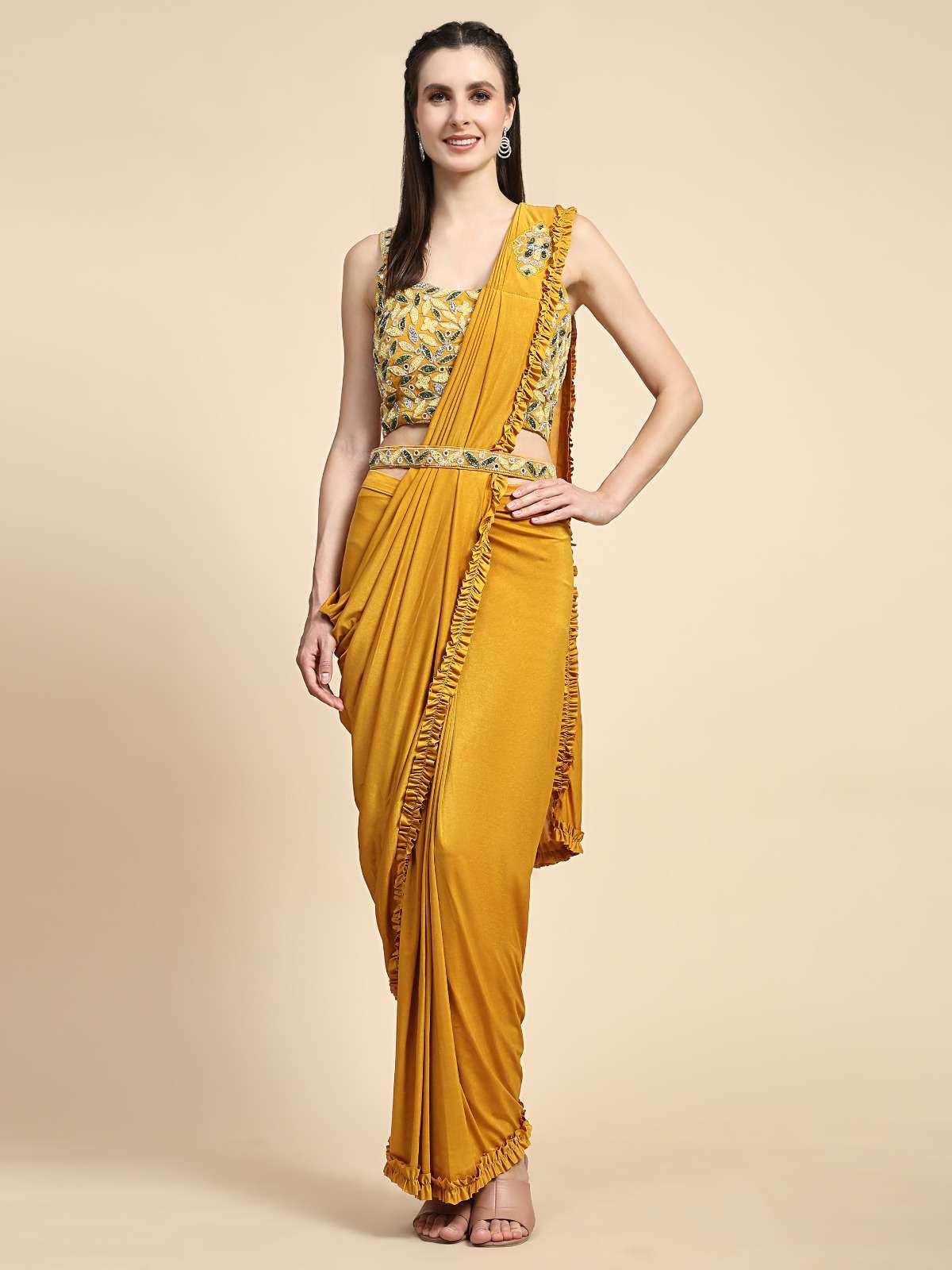 READY TO WEAR SAREES DESIGN NO 101995 BLOUSE EXQUISITE HAND EMBROIDERED WORK SAREES IMPORTED FABRIC AND FRILLED BORDER WITH HANDWORK BELT SIZE 36 (READY) RATE 1775+5%GST |