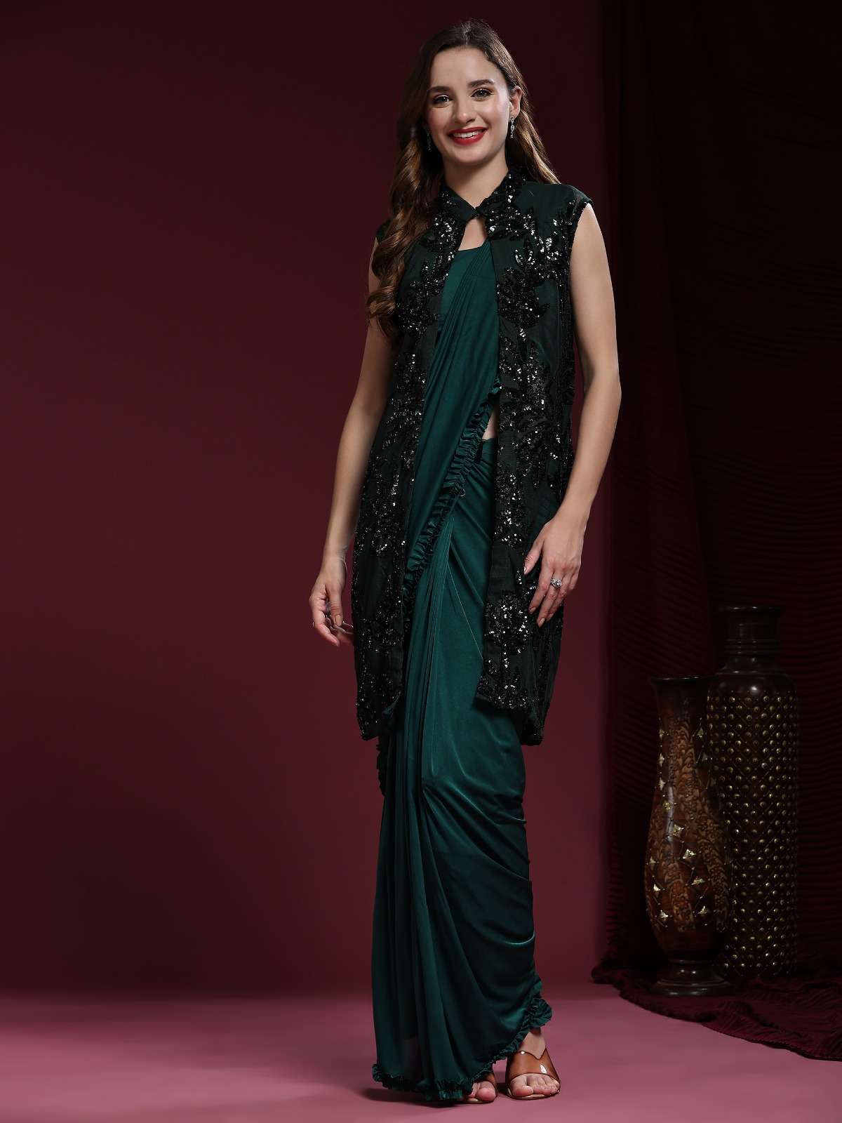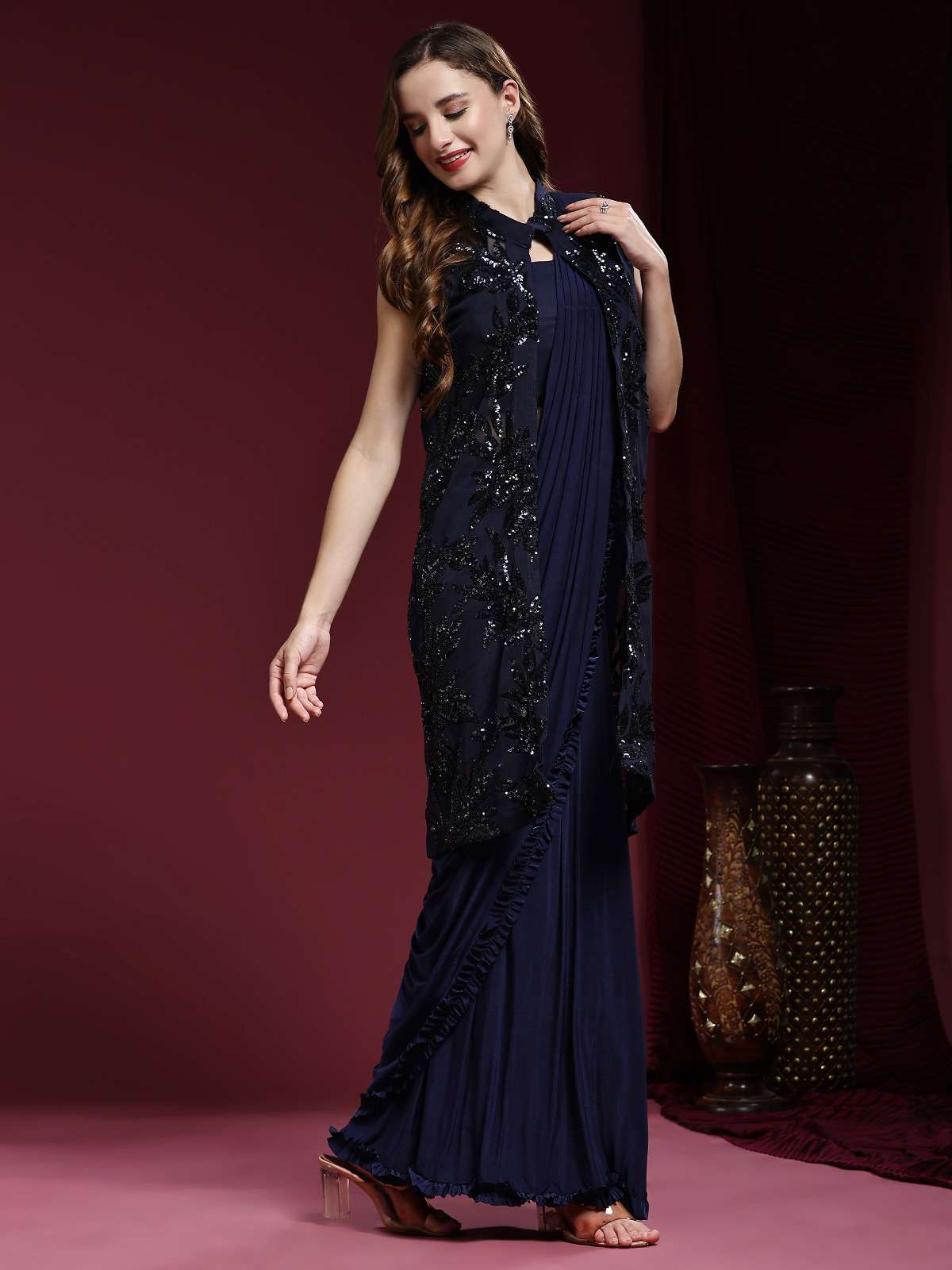 READY TO WEAR SAREE DESIGN NO. : 10522 BLOUSE PLAIN BLOUSE : SHRUG POWER NET FARIC WITH EXQUSITE SEQUIN EMBROIDERY WORK SAREE IMPORTED FABRIC WITH LITTLE FRILL IN ORDER SIZE 36 (READY) 5 COLOURS AVAILABLE RATE 3195+5% GST |