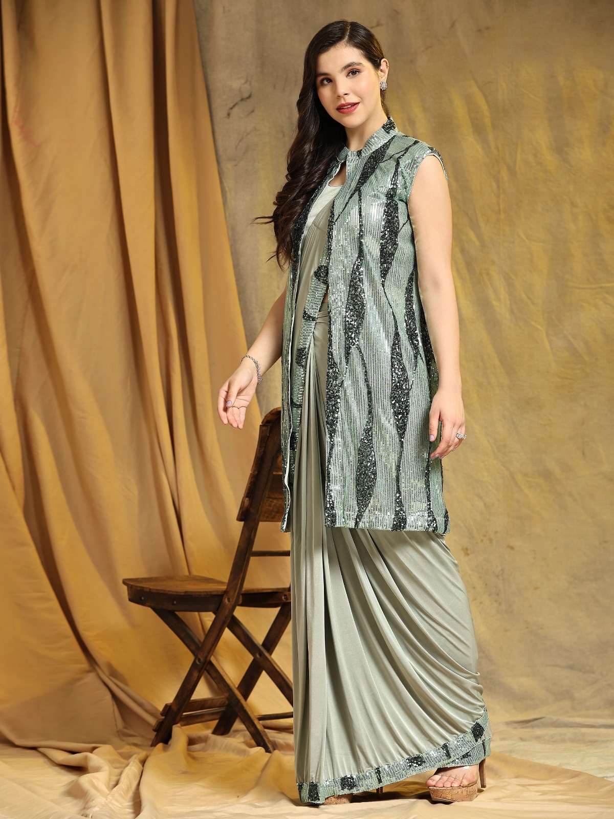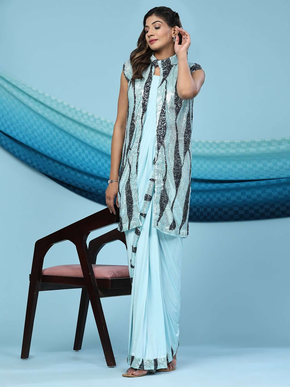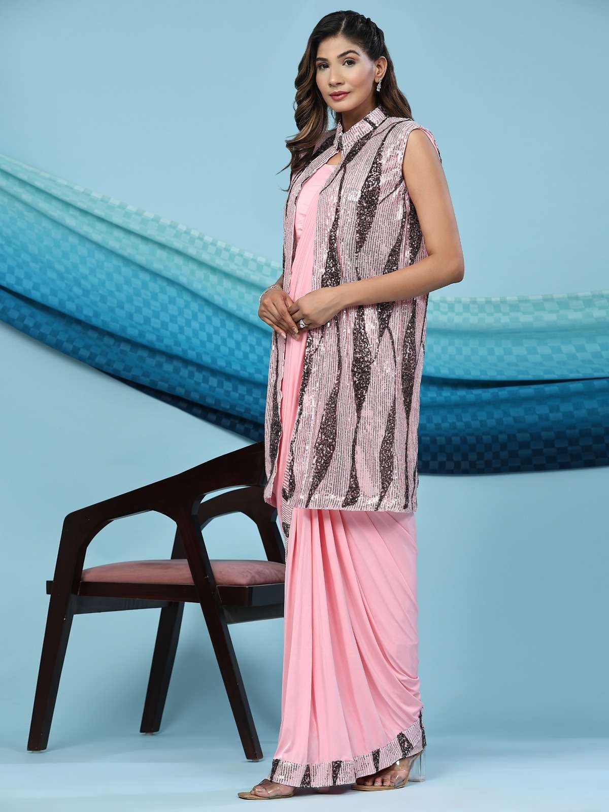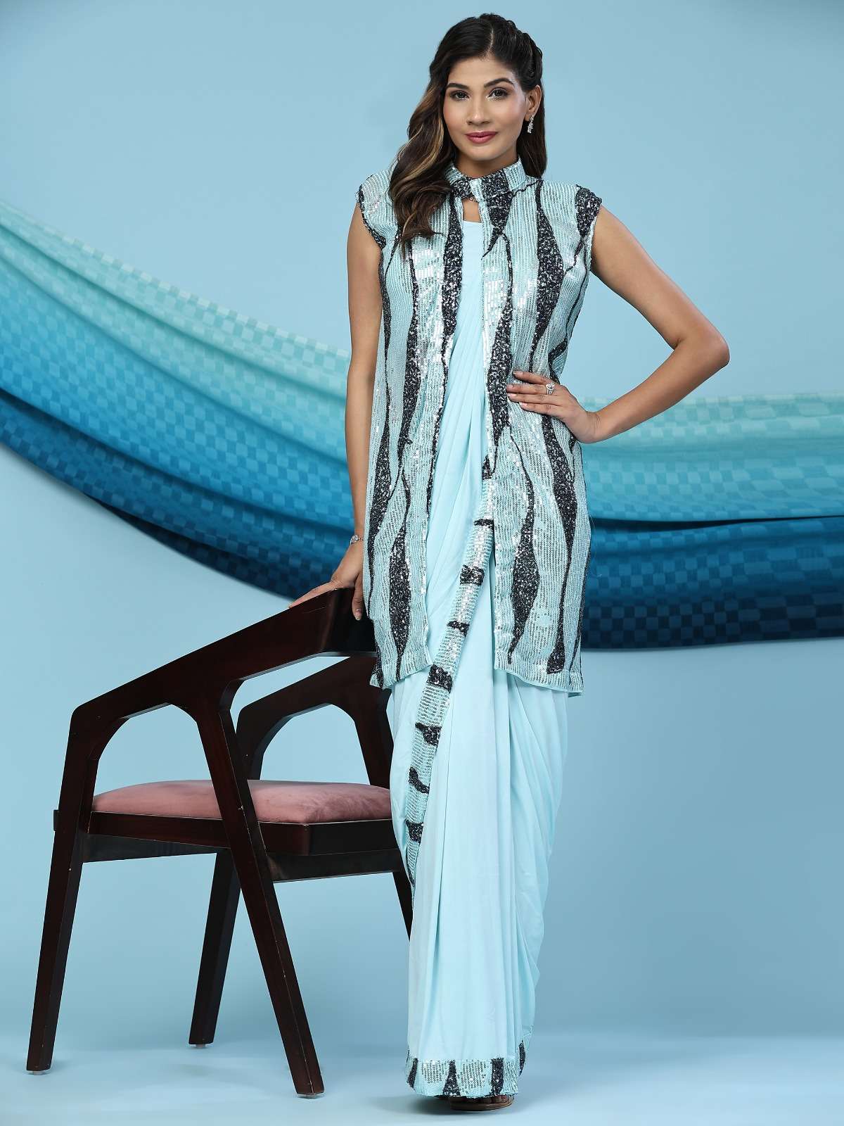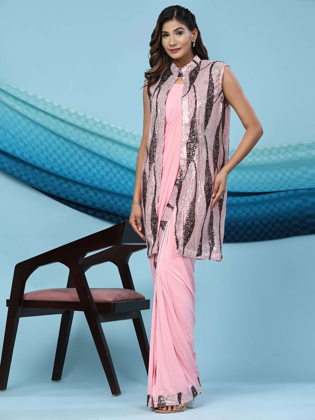 pr 10523 function wear readymade sequin work border fancy saree with blouse and net designer shrug
