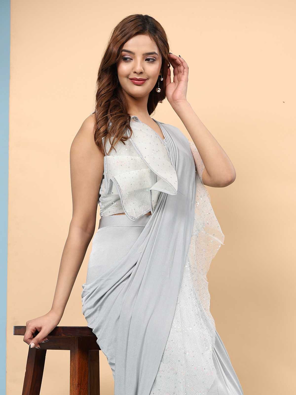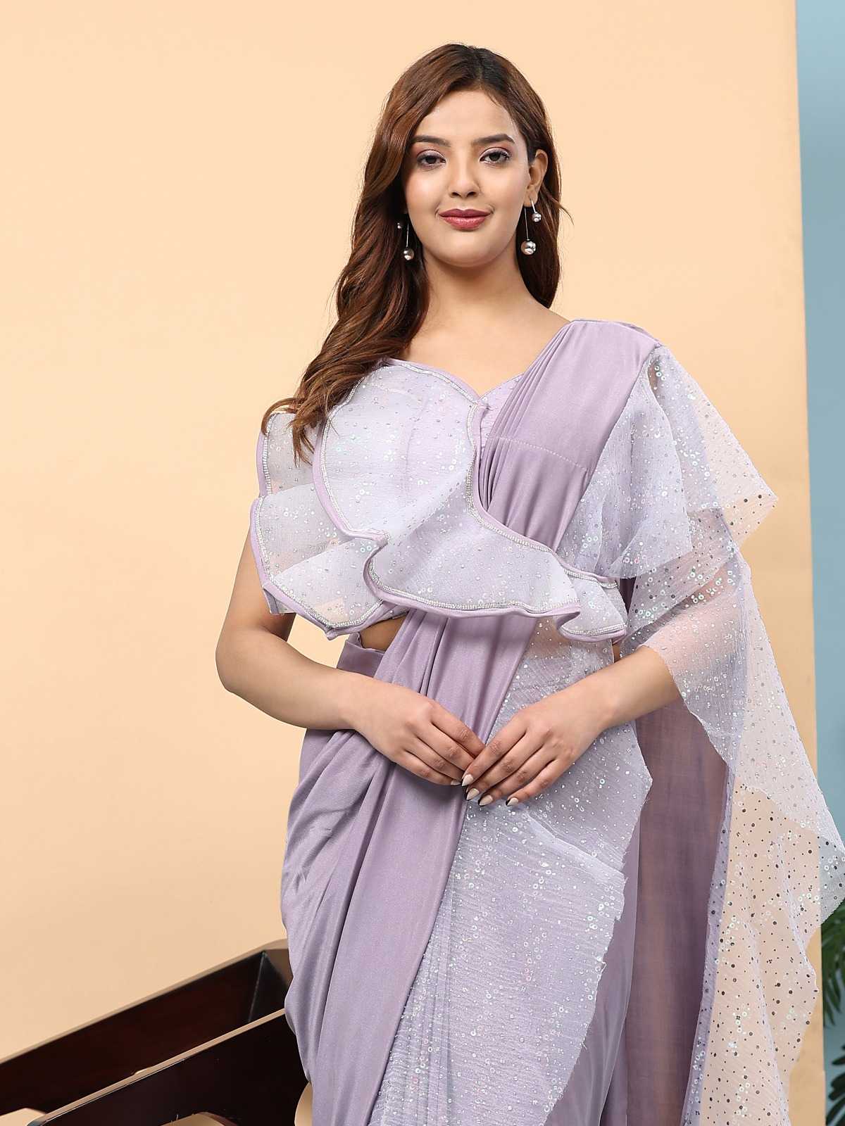 READY TO WEAR SAREES DESIGN NO 10942 BLOUSE STONE AND BEADS WORK WITH FANCY PATTERN SAREE IMPORTED FABRIC WITH RUFFLE BORDER SIZE (36 READY) 4 COLOURS AVAIABLE