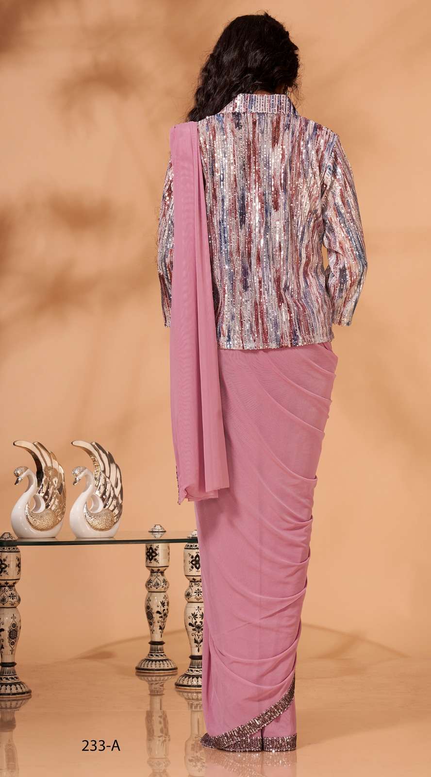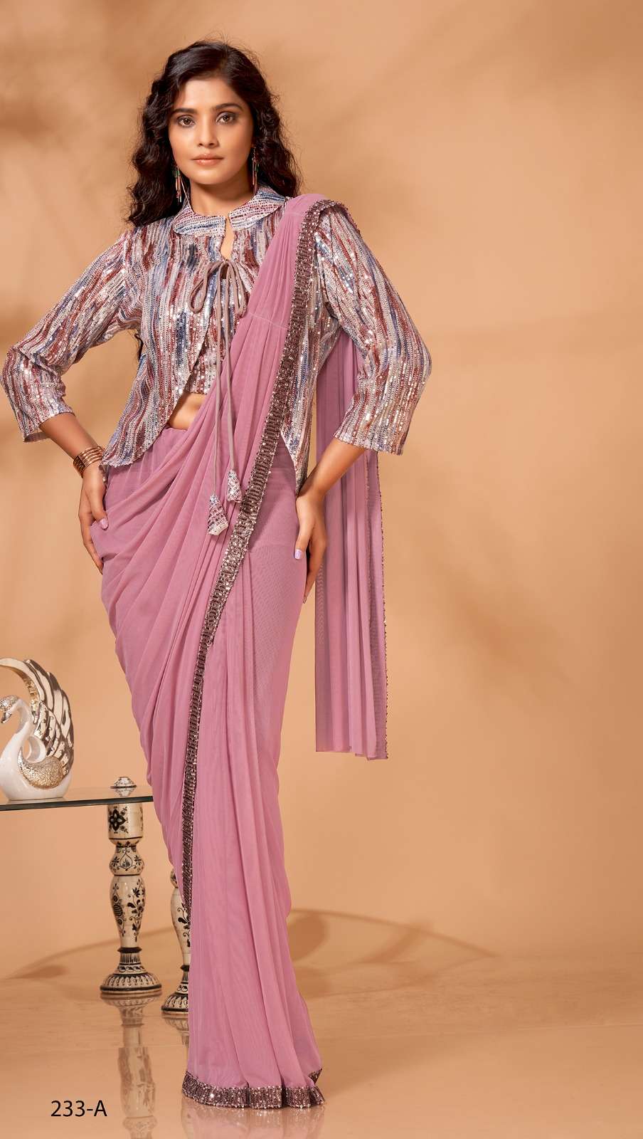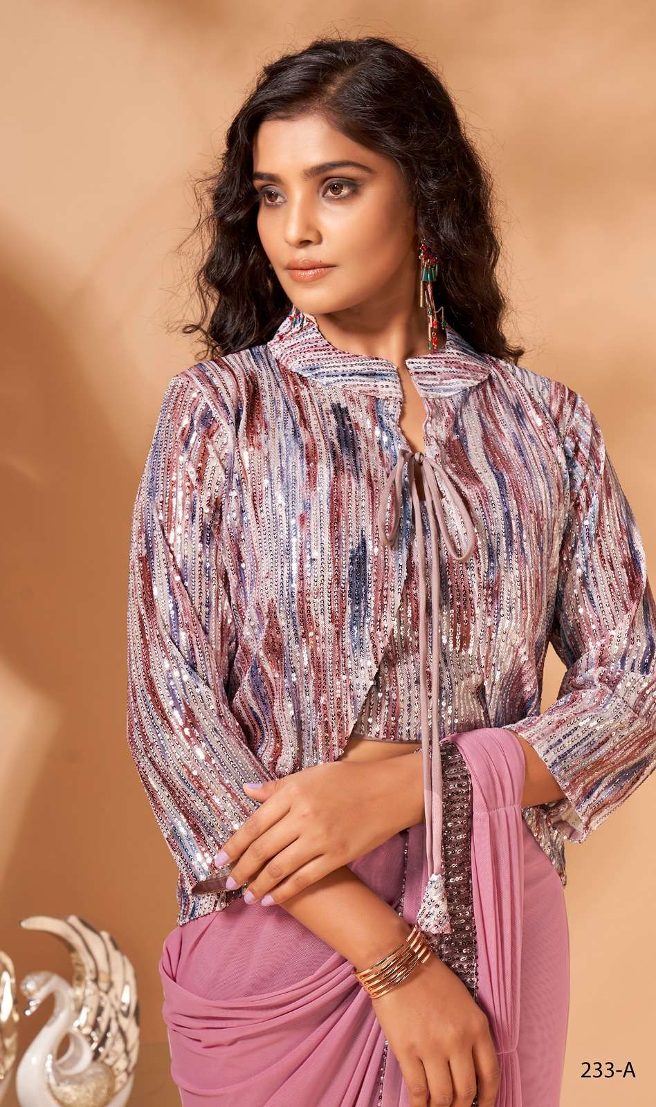 READYMADE SAREES DESIGN NO A233 BLOUSE BLOUSE- 1 SEQUIN PRINT / BLOUSE - 2 IMPORTED FABRIC WITH SEQUIN PRINTED JACKET SAREE POWERNET FABRIC WITH SEQUIN WORK BORDER SIZE 36 (READY) 2-2 INCH MARGIN EXTENDED 40 1COLOUR AVAILABLE RATE 2695+5%(GST) |