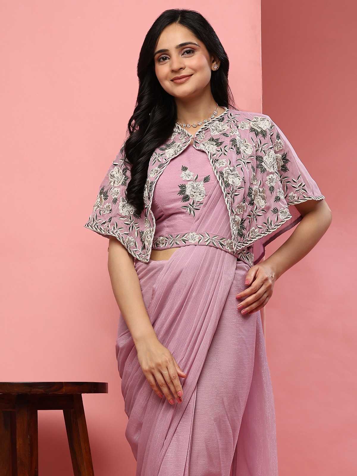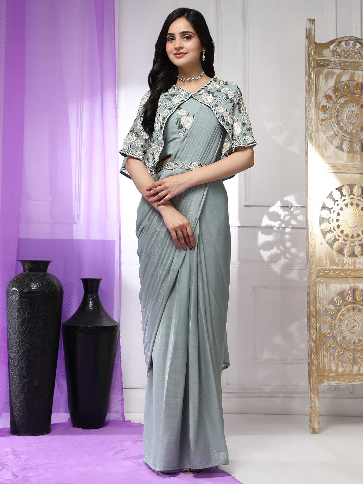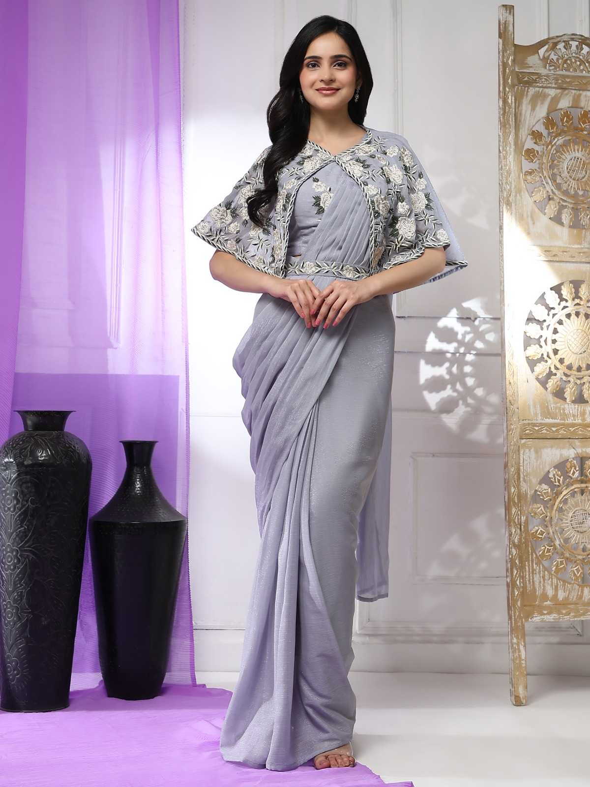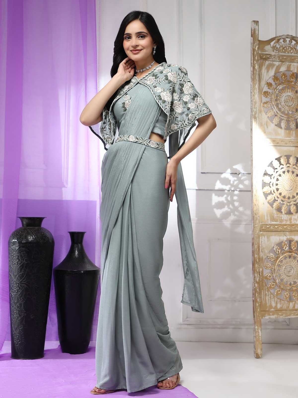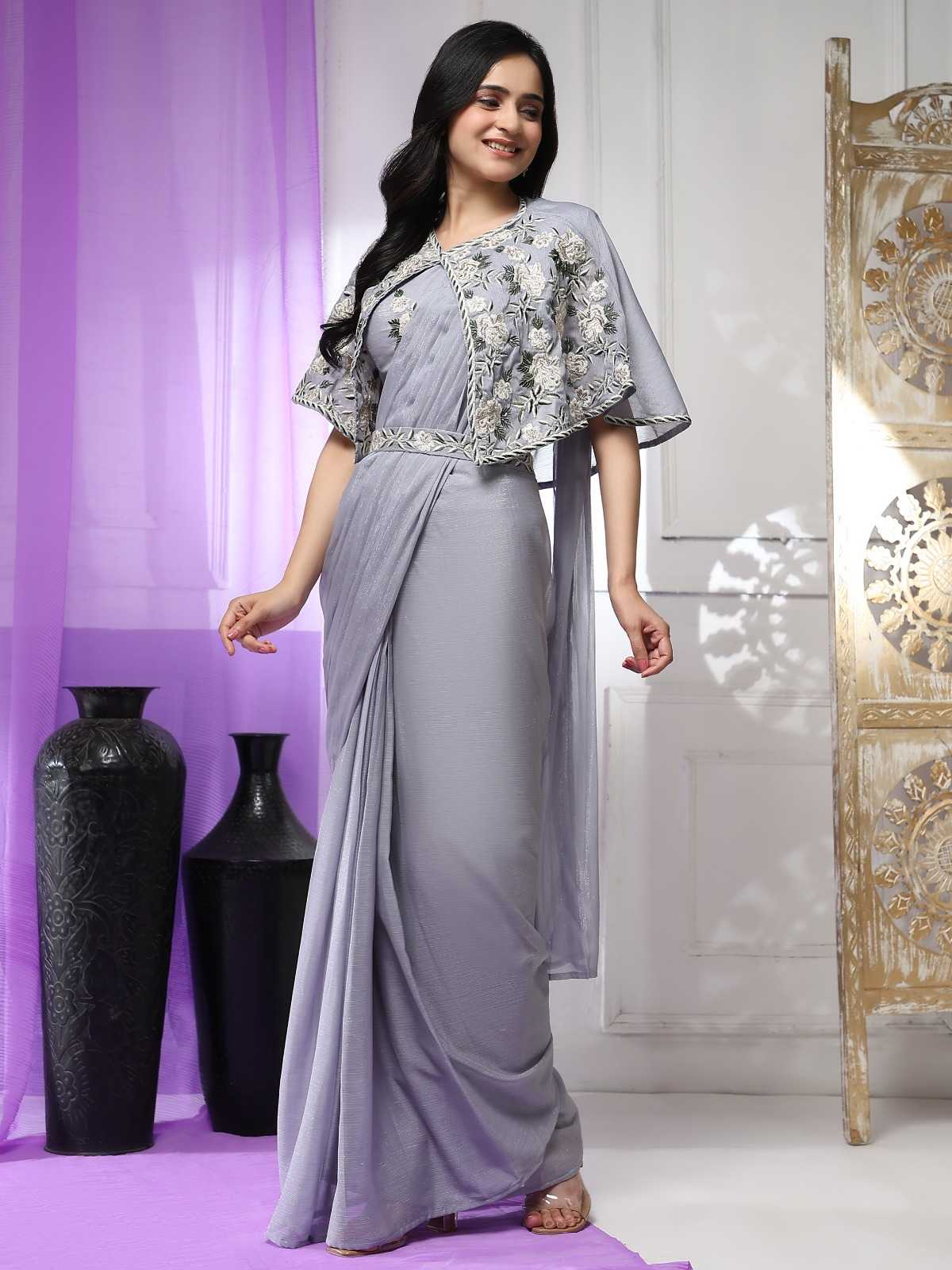 READY TO WEAR SAREES DESIGN NO A338 BLOUSE EXQUISITE EMBROIDERED WORK WITH FLOWER PATTERN CAPE SAREES IMPORTED CHIFFON WITH EMBROIDERED BELT SIZE 36 (READY) RATE 2625+5%GST |