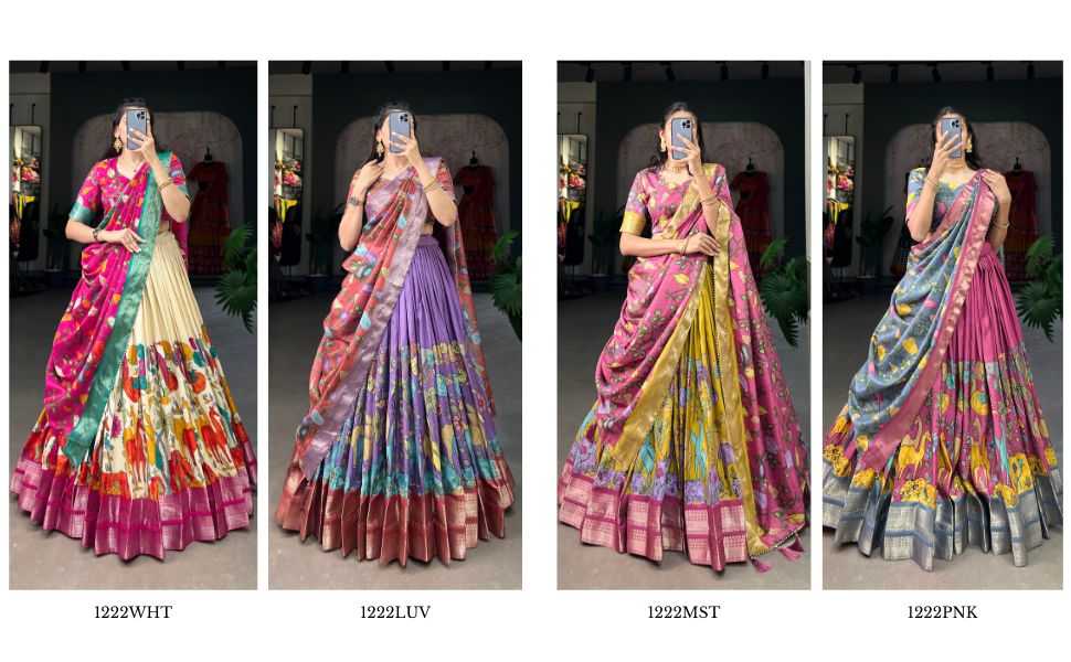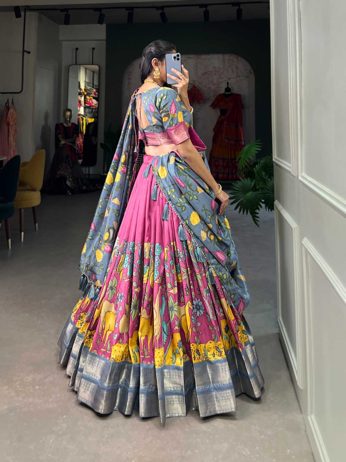 pr akanksha stylish dola silk fancy kalamkari print full stitch lehenga with unstitch blouse exports
