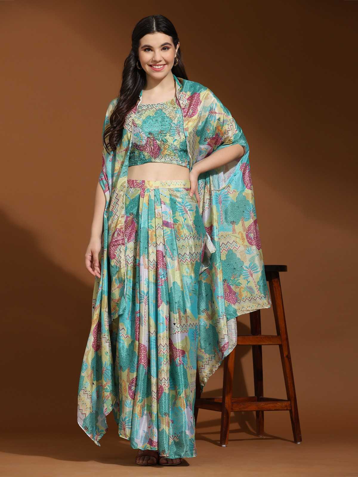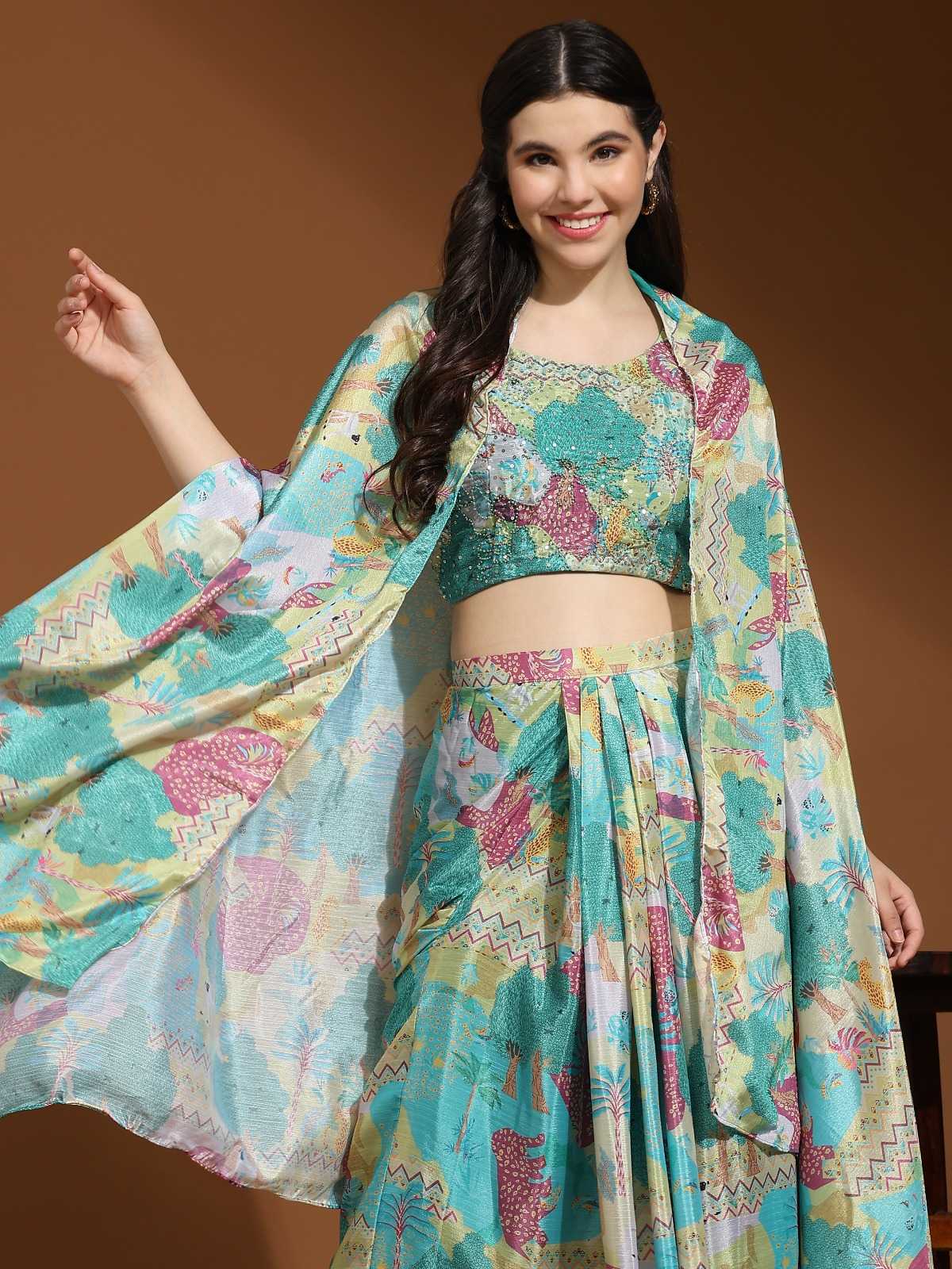 READYMADE INDO-WESTERN TOP HAND WORK BLOUSE SKIRT CHINON FABRIC WITH COWL AND SHRUG SHRUG CHINON FABRIC WITH DESIGNER PRINT SIZE L AND XXL SLEEVES INSIDE 1 COLOURS AVAILABLE RATE 2425 per pcs |