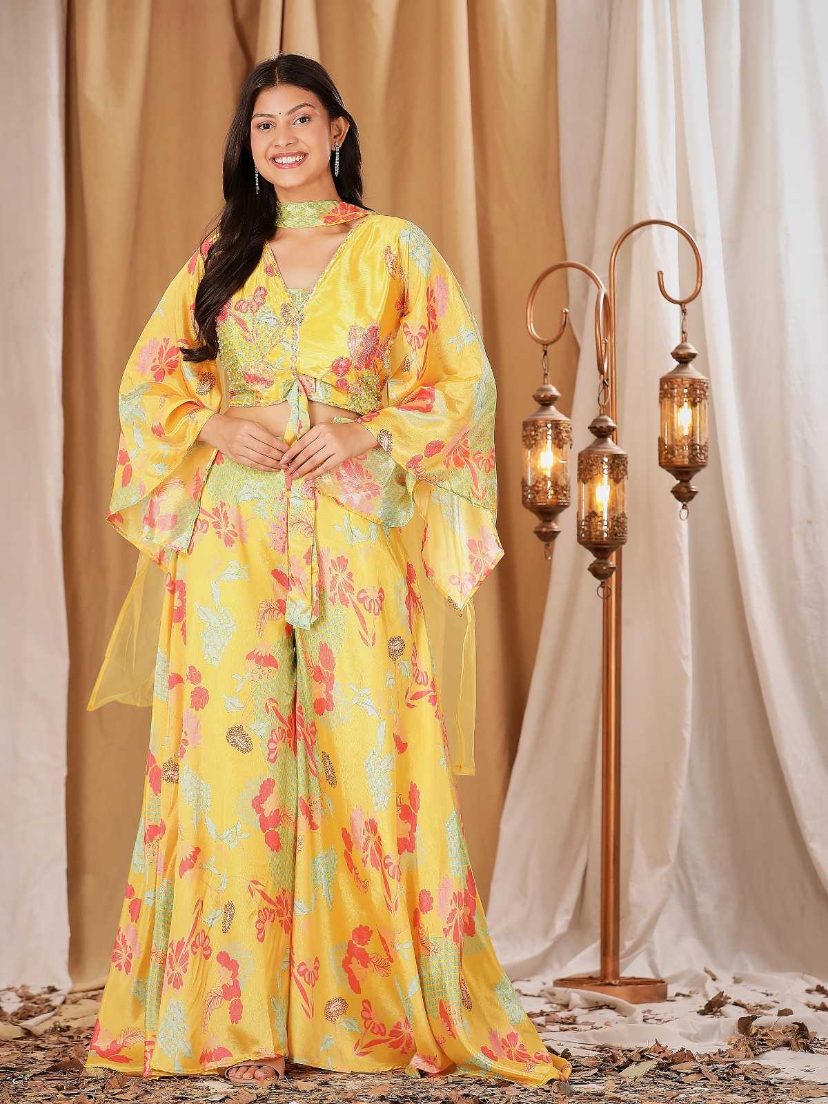 READYMADE CROP TOP DESIGN NO C4002 TOP PRINTED AND EMBROIDERED BELL SLEEVES PLAZZO PRINTED AND EMBROIDERED DUPPATTA NET AND EMBROIDERED FULLY STICHED SIZE L,XL RATE 1995+12%(GST) |