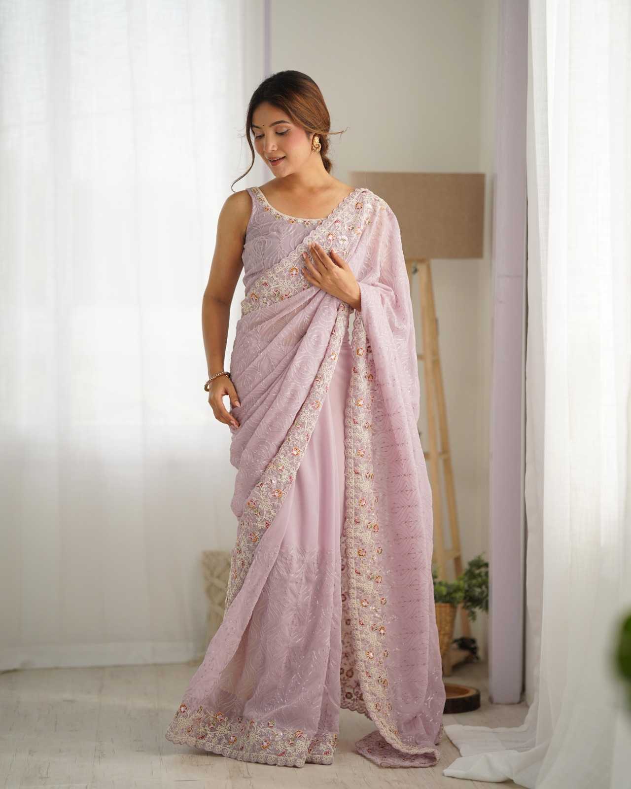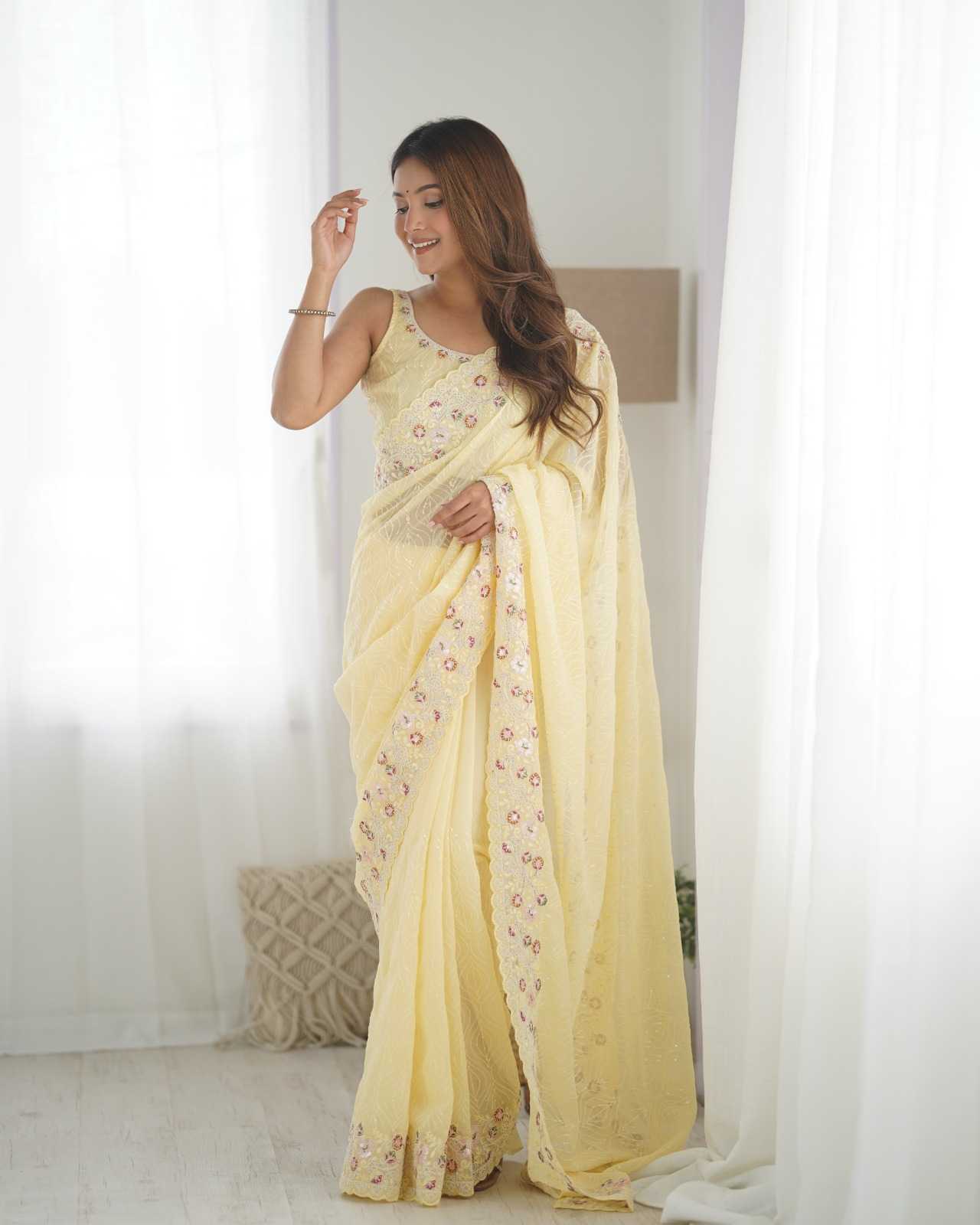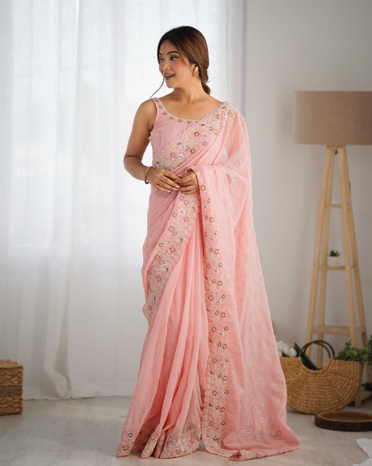 DS-641 👇 PRODUCT DETAIL 👇 🛑SAREE FABRIC- Georgette 🛑SAREE LENGTH- 5.50 Mtr 🛑BLOUSE FABRIC- Georgette with seqwance and coding work RATE - 1499/- |