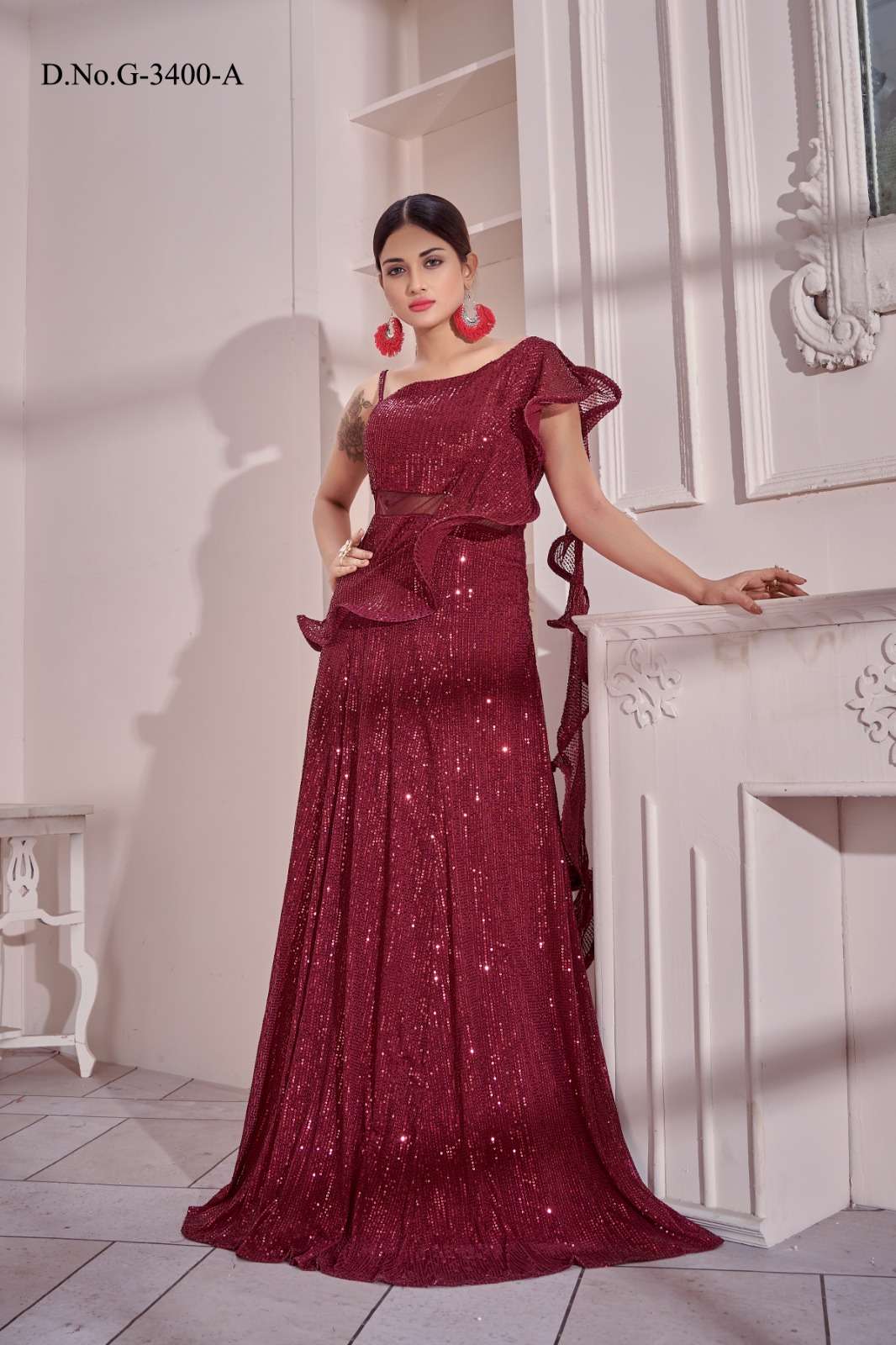 DESIGNE NO-, G-3400 FABRIC - IMPORTED SEQUINS DETAILS - EXCLUSIVE IMPORTED SEQUINS WORK / EXCLUSIVE IMPORTED SEQUINS WITH RUFFLED DRAPE