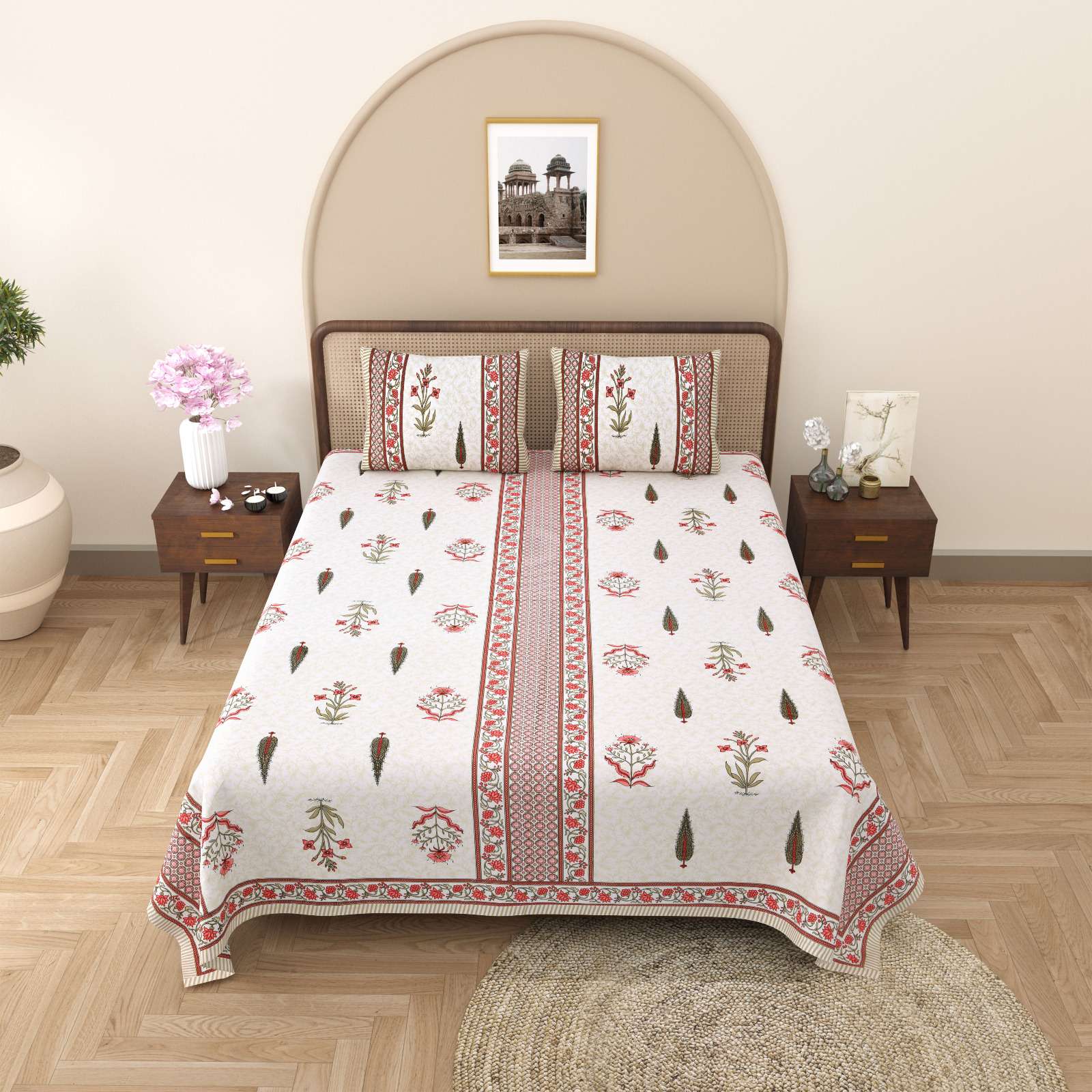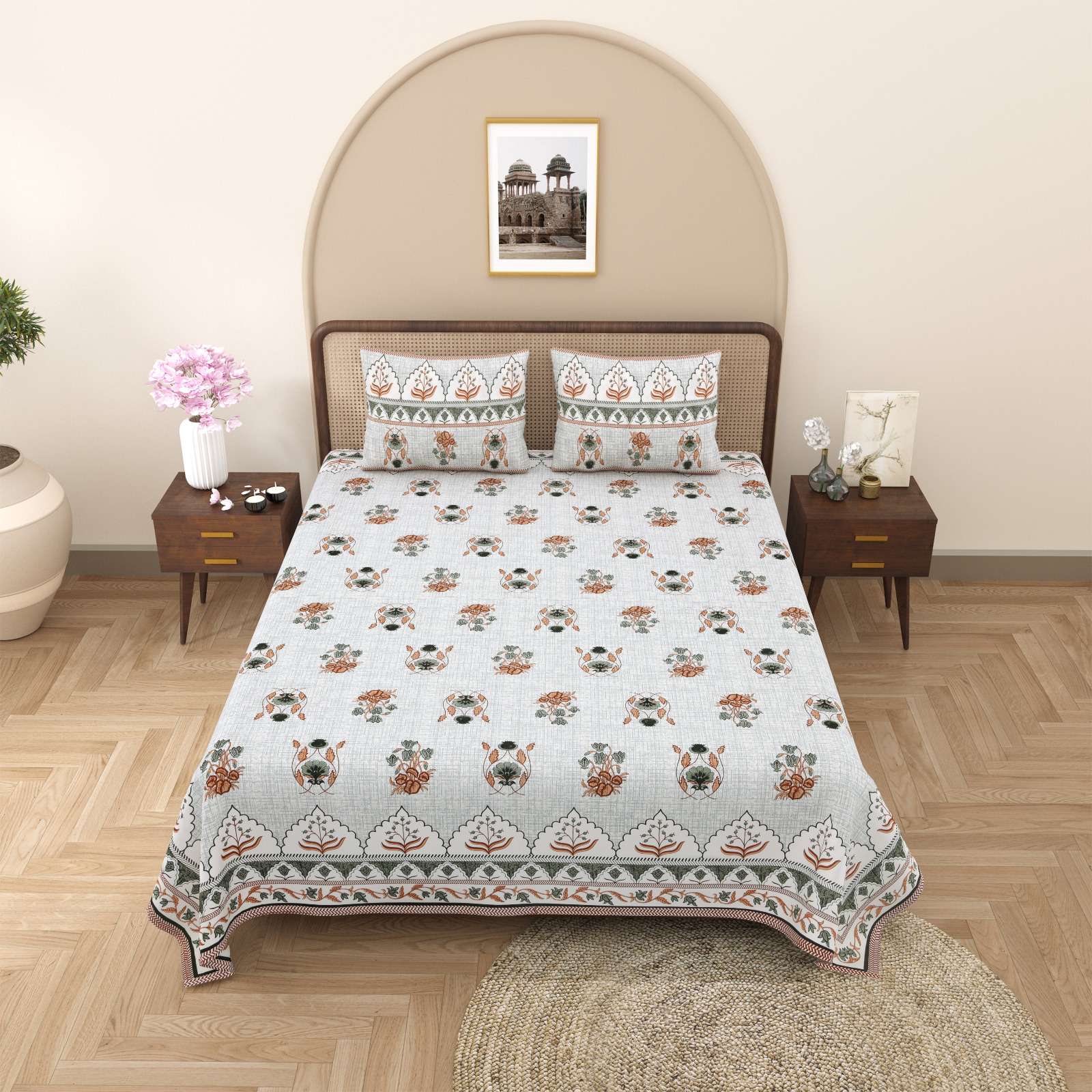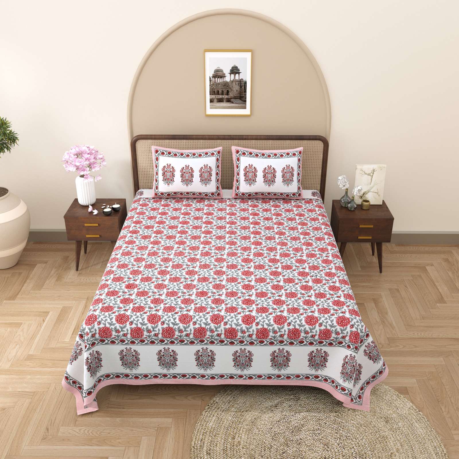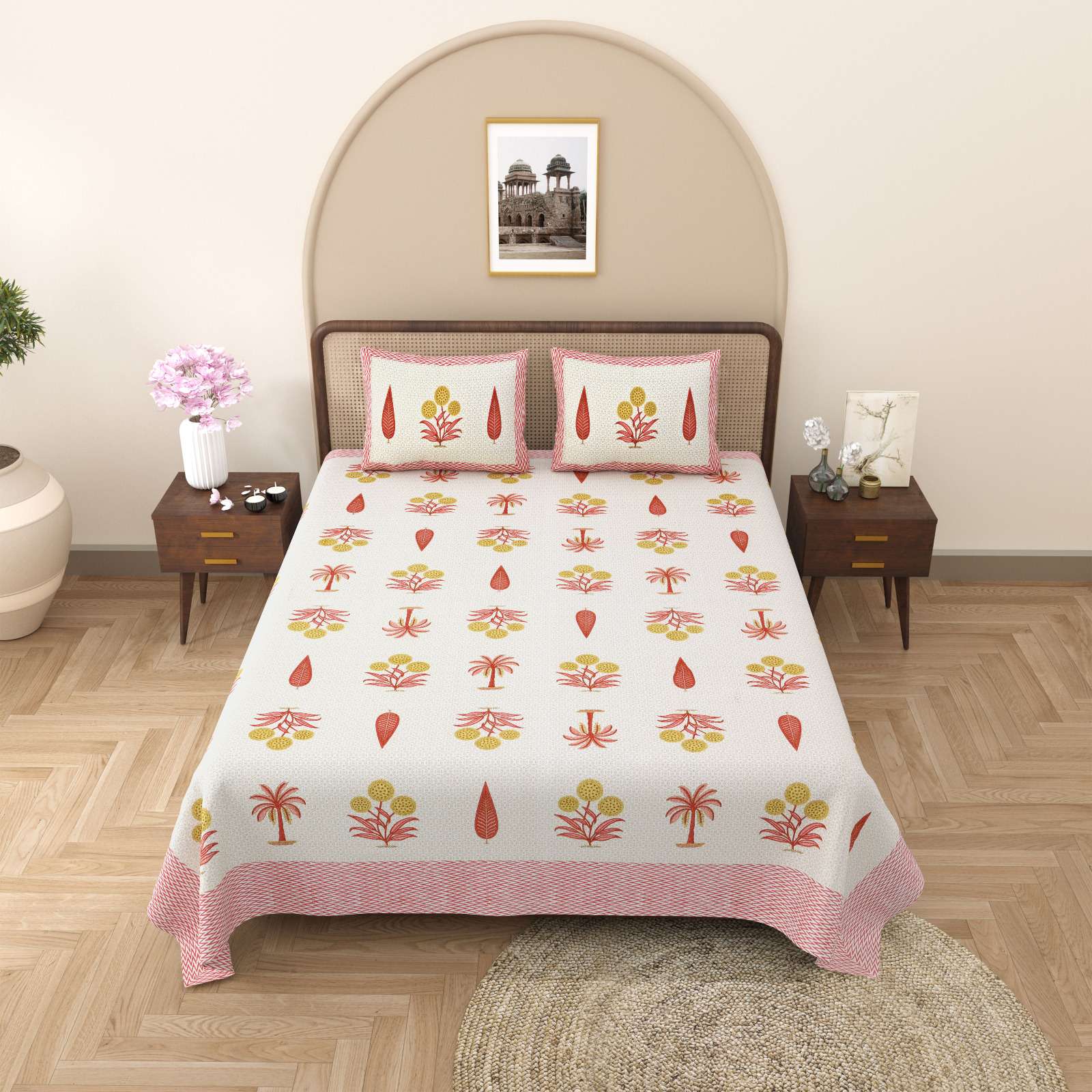 pr gulmohar cotton hand block design king size bedsheet with pillow cover