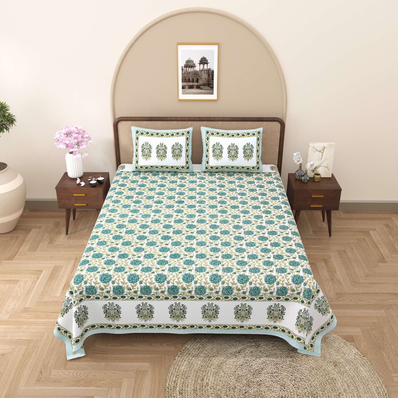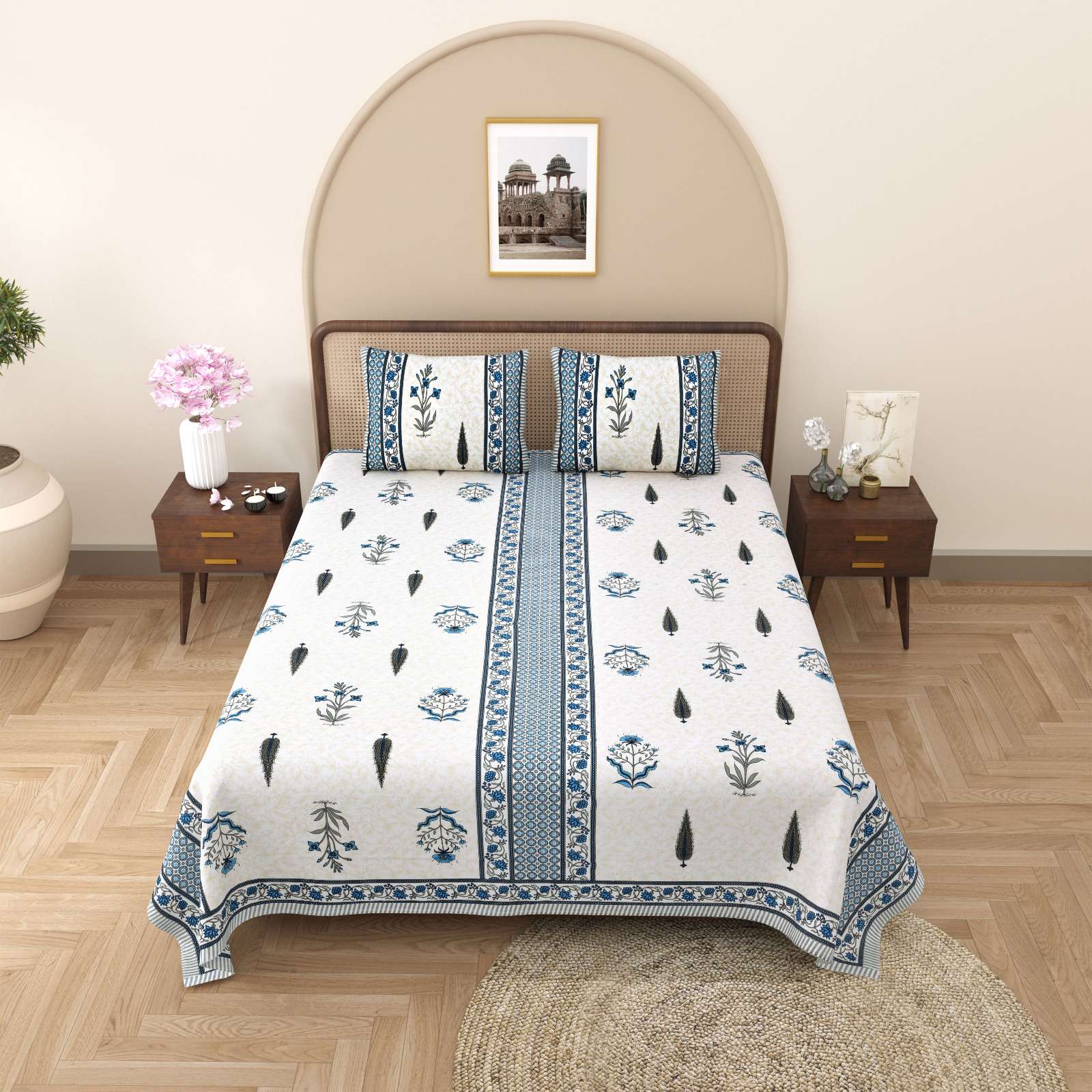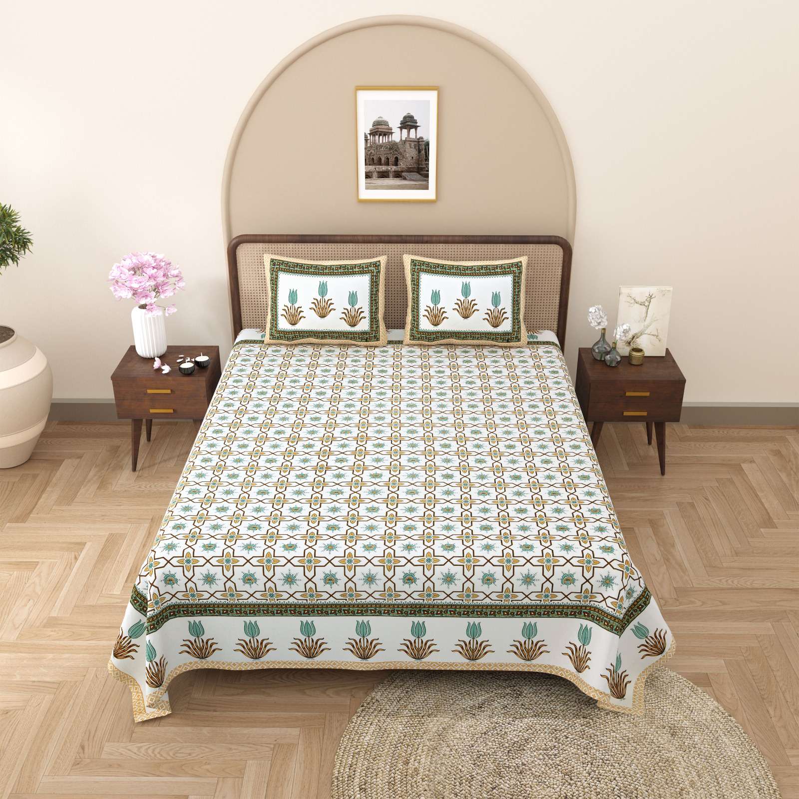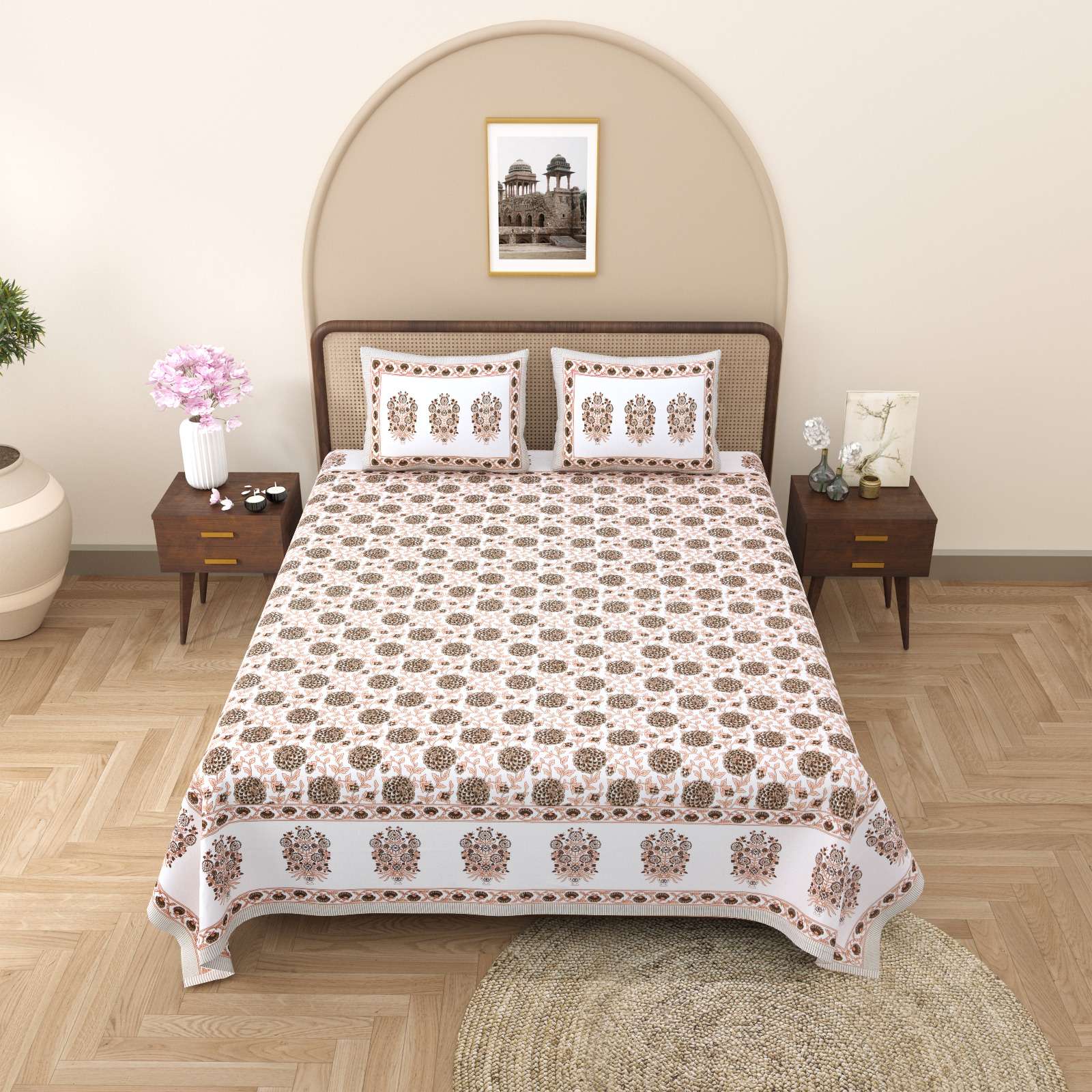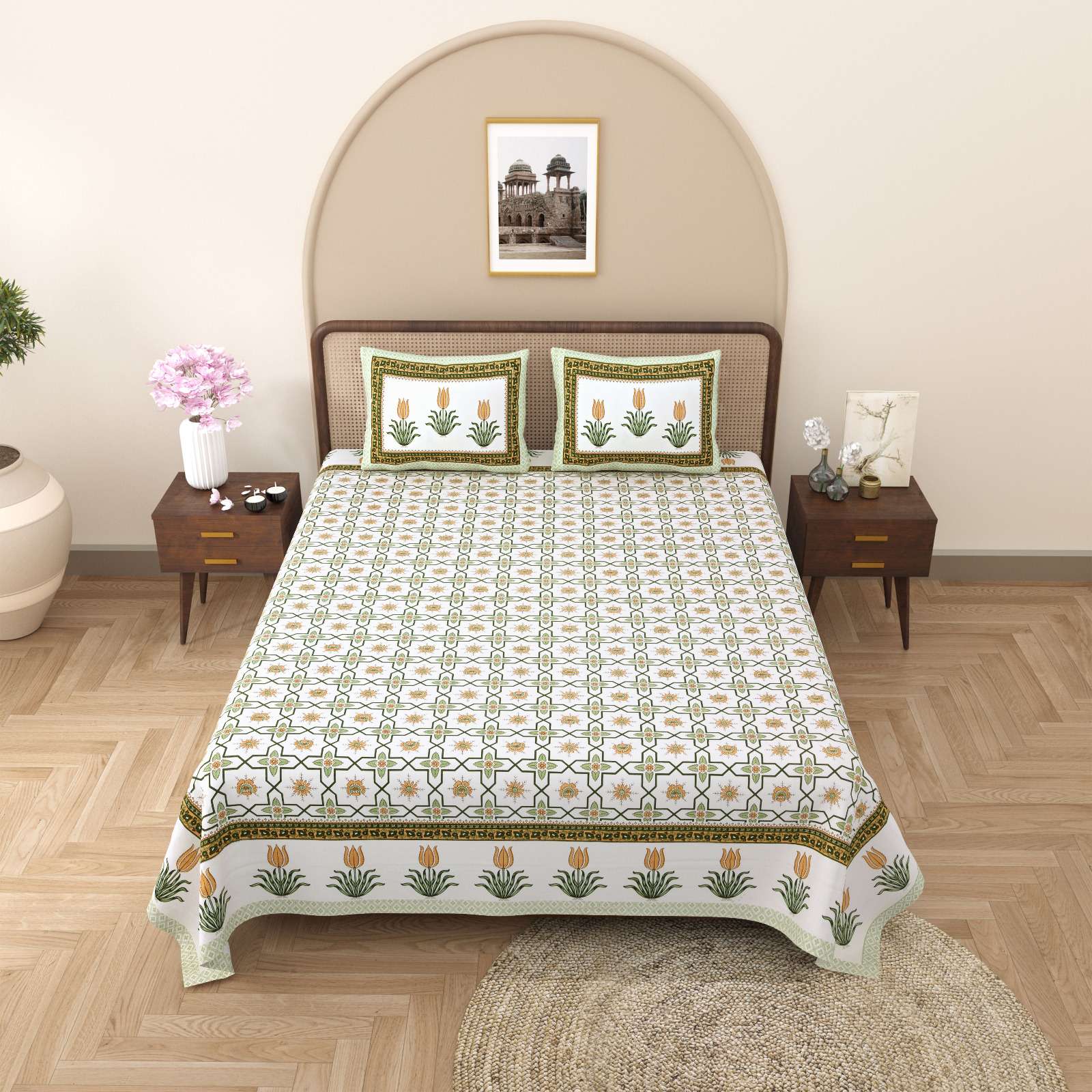 pr gulmohar cotton hand block design king size bedsheet with pillow cover