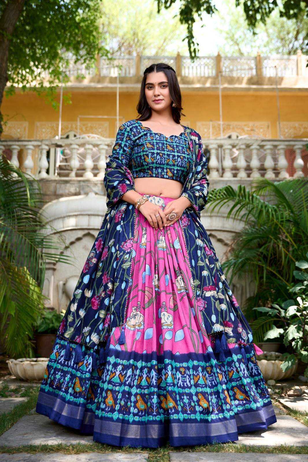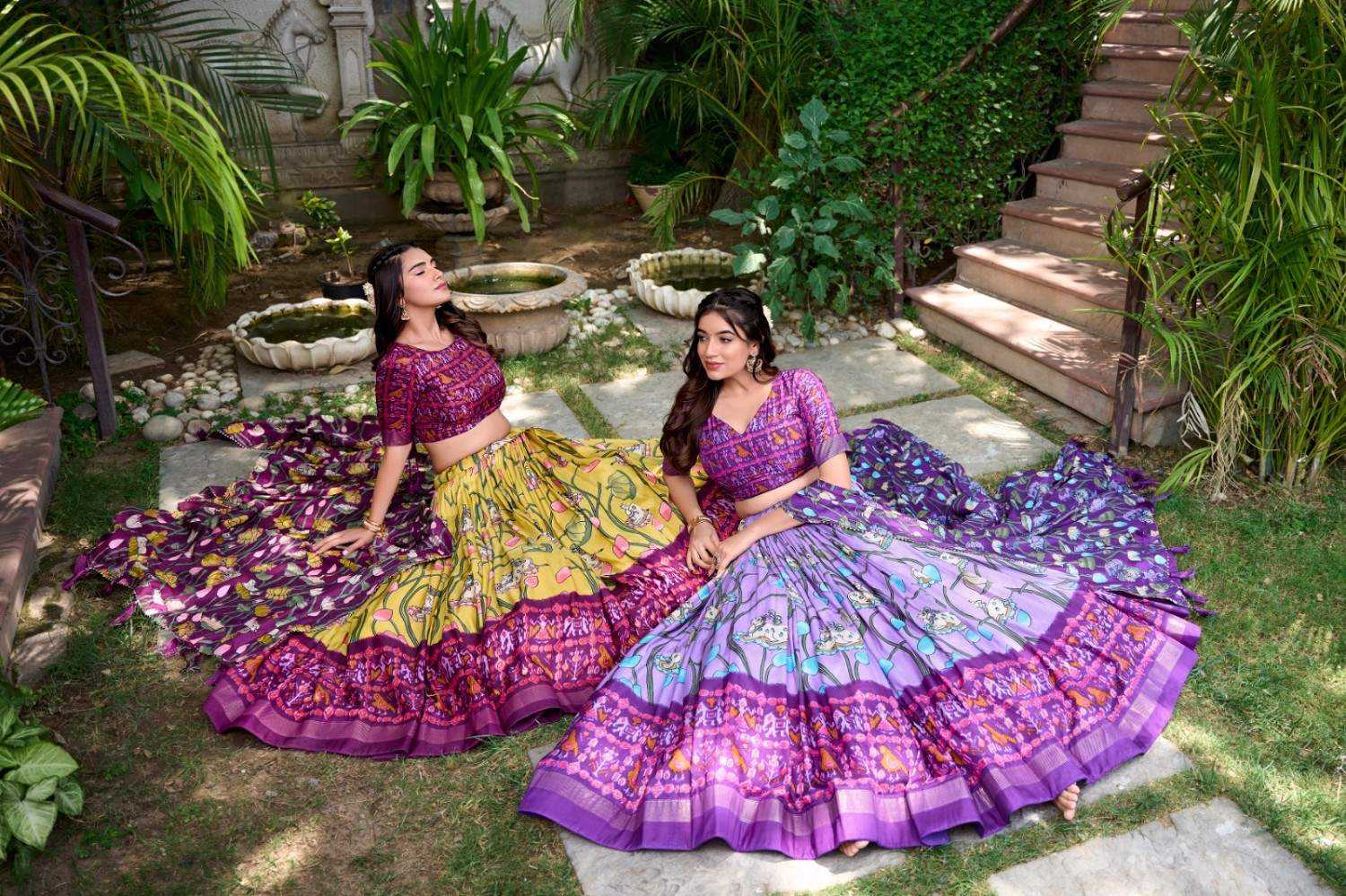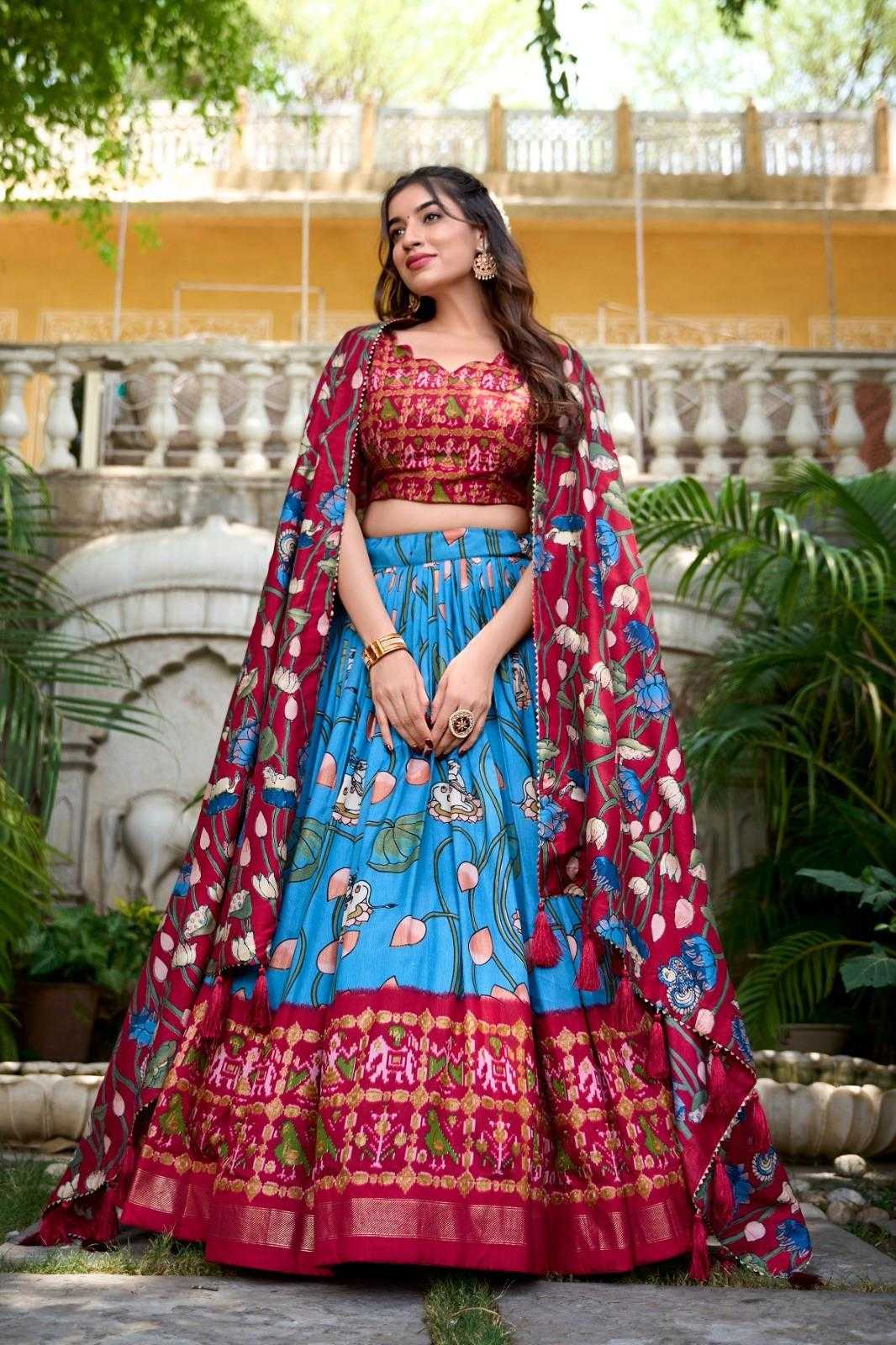 pr ishanya tussar silk designer patola print stitch lehenga with unstitch blouse
