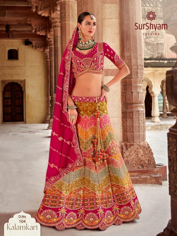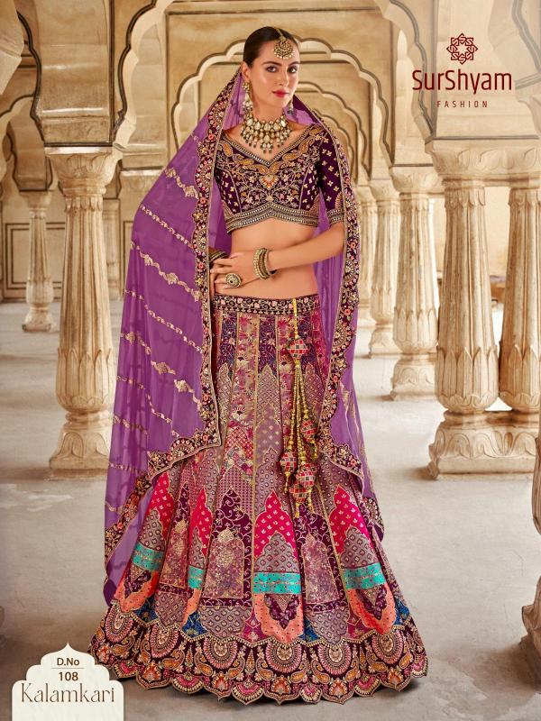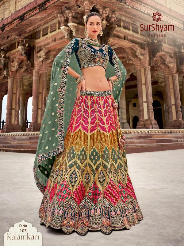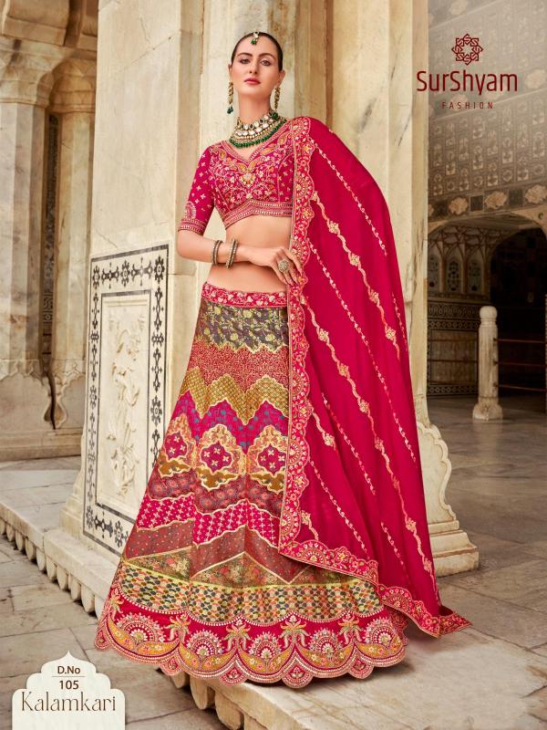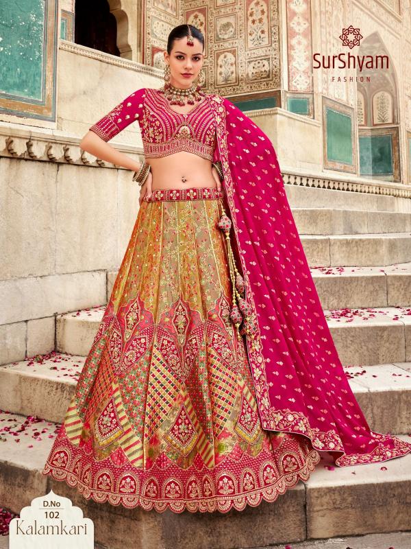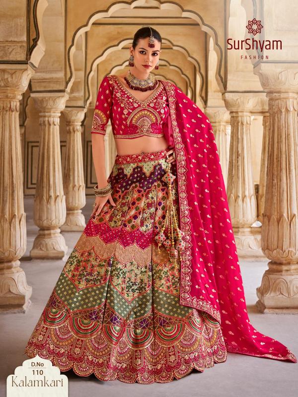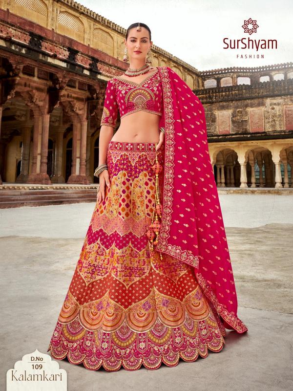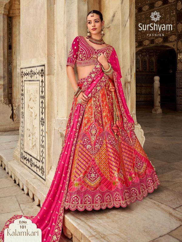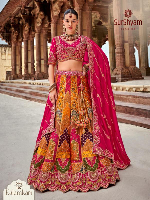 Catlogue name-kalamkari series- 101 to 110 Banarasi silk Semi-Stitched Lehenga choli Rate 8795/- Gst tax 12% extra Lehenga-Banarasi silk with zarkan |