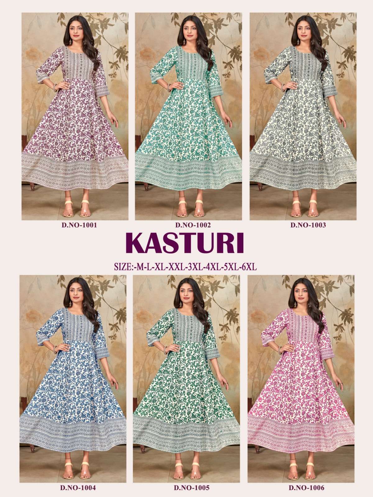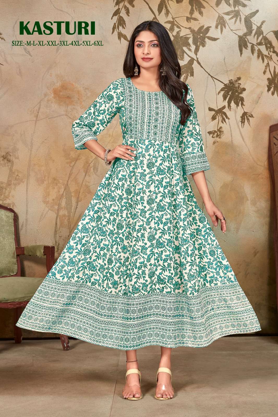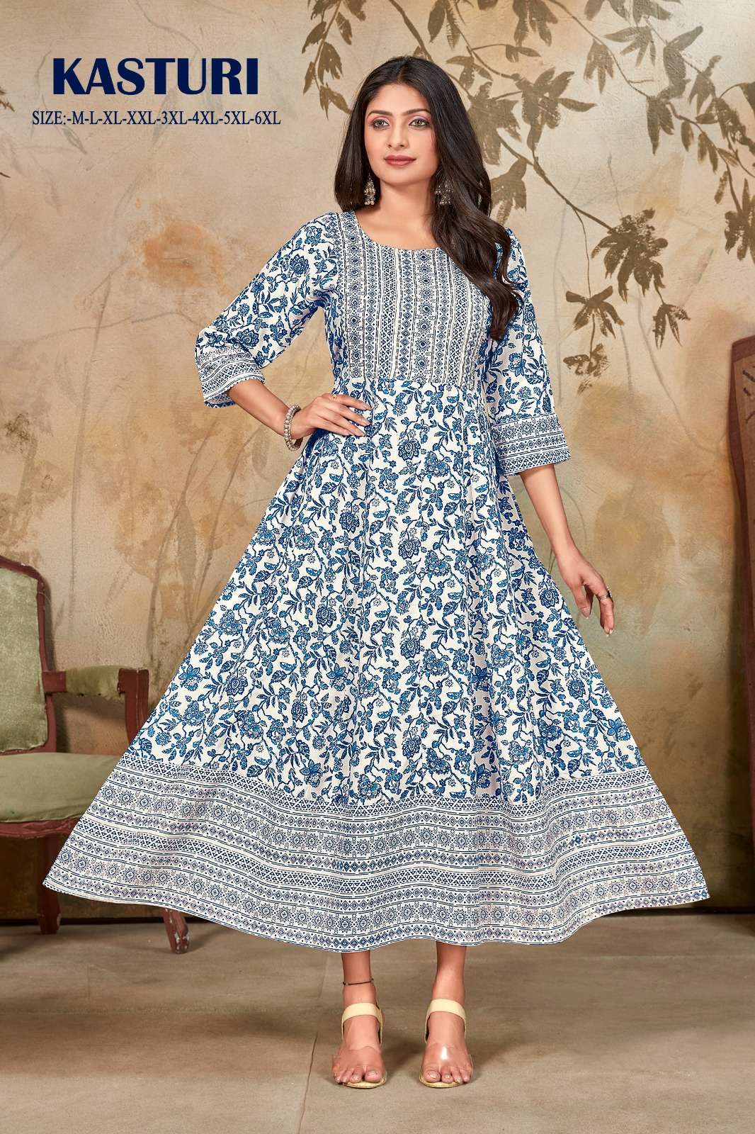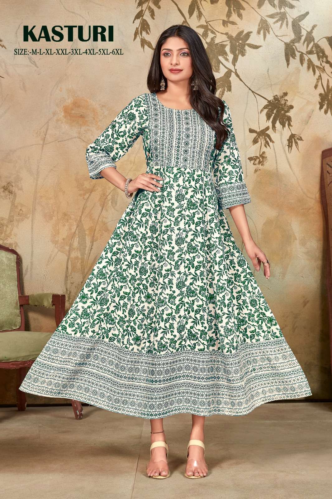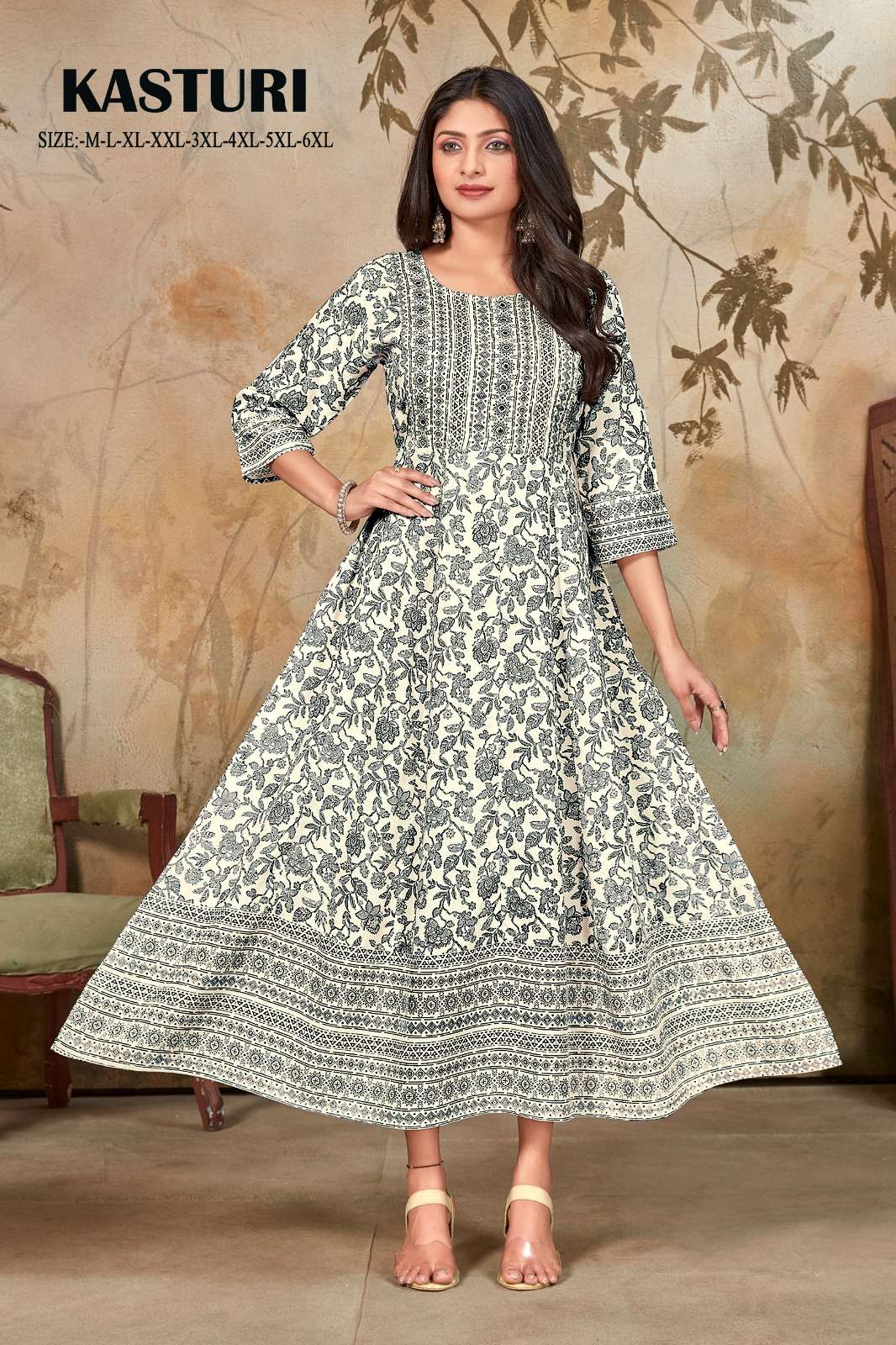 KASTURI Multi Color Foil Print Flair Gown Fabric: 14kg Rayon with Foil Print Work :- Embroidery sequence work Size: Length: 49” Price: 599/- |