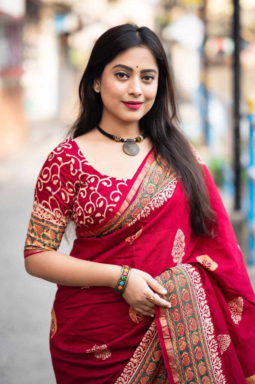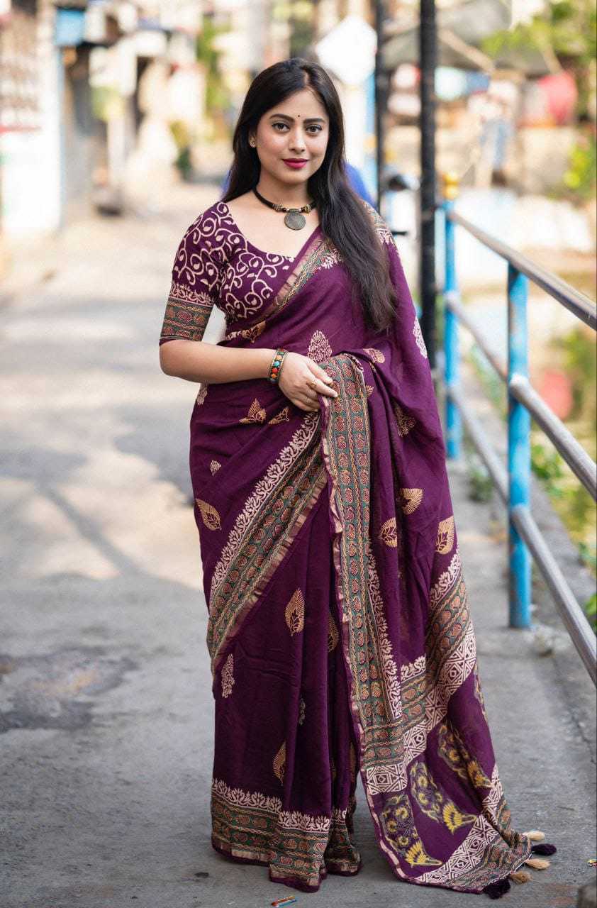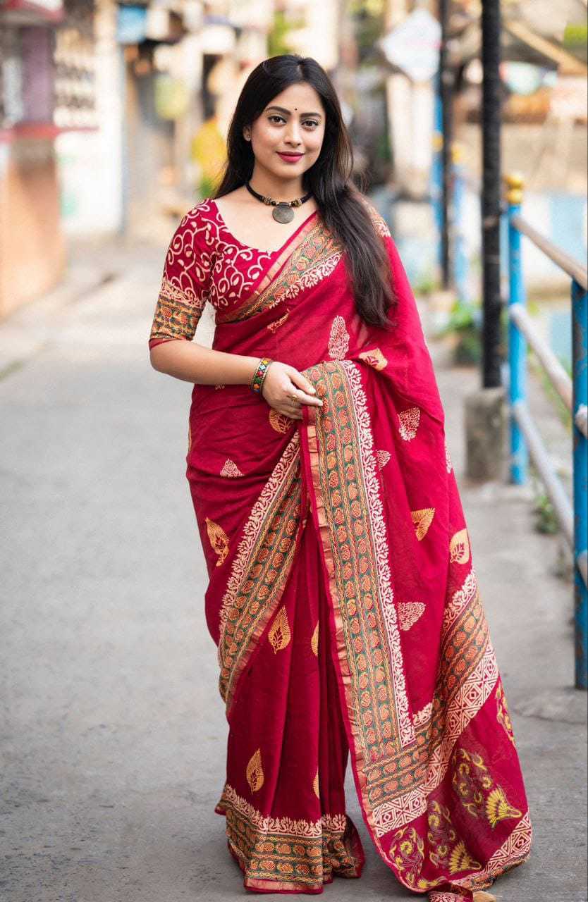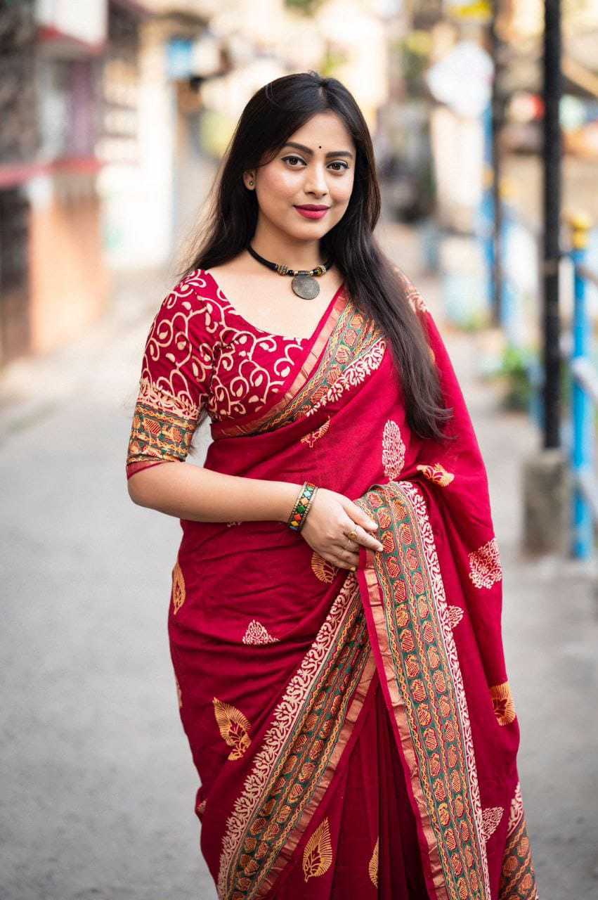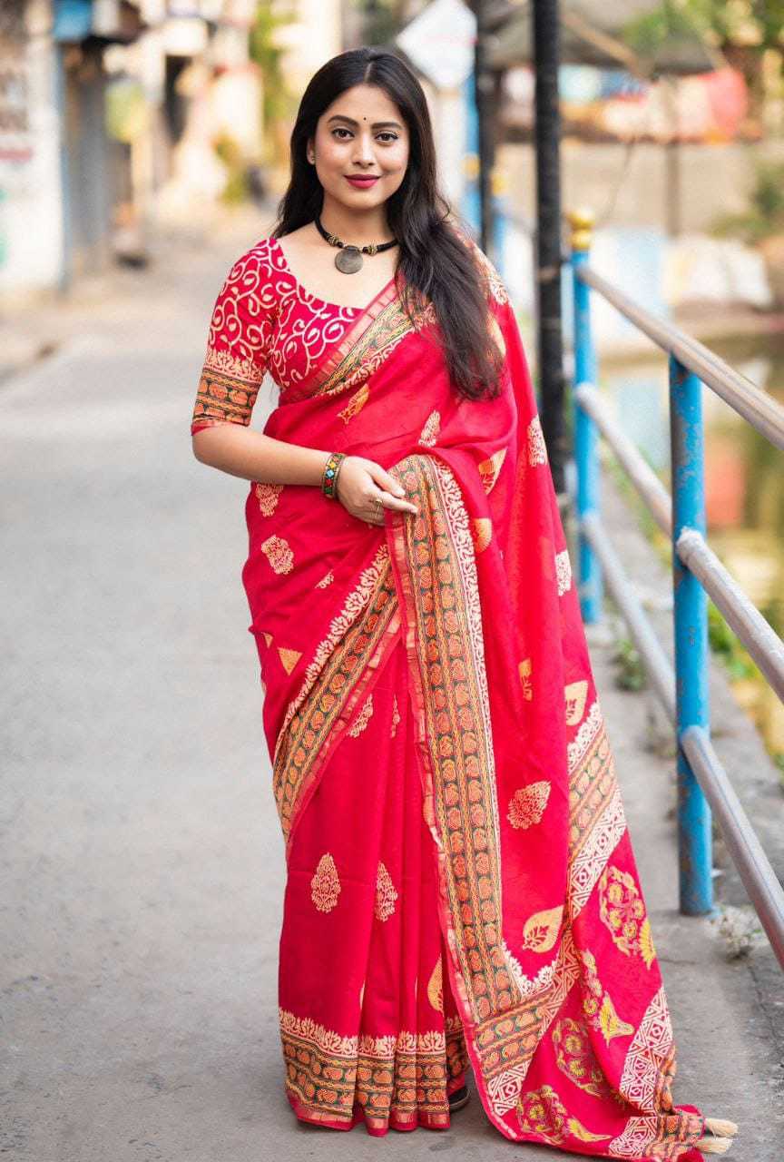new arrivals New preimum hand block printed anrakh saree. KC- 103 KC- magic Ajrakh (d-2) Quality- pure chanderi cotton zare with zari woven pattu border. Ajrakh butta style hand block prints. Blouse- pure chamderi hand block printed blouse. Rate - 1350+ship Top premium quality |