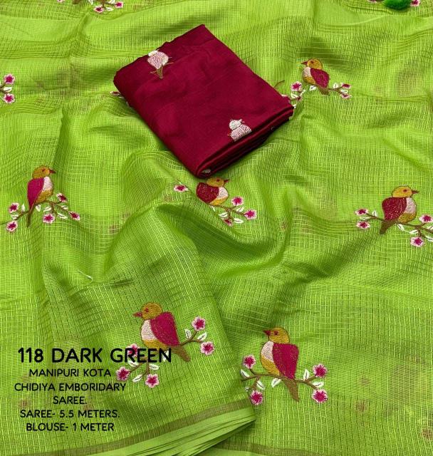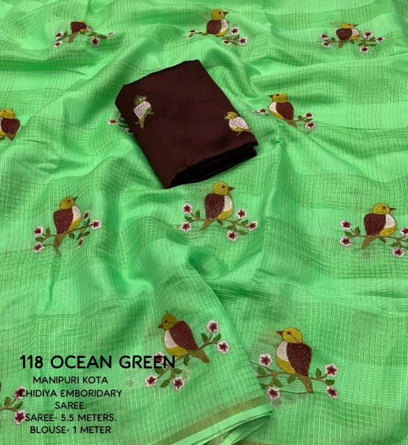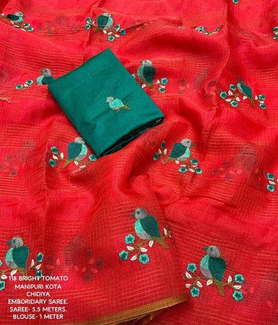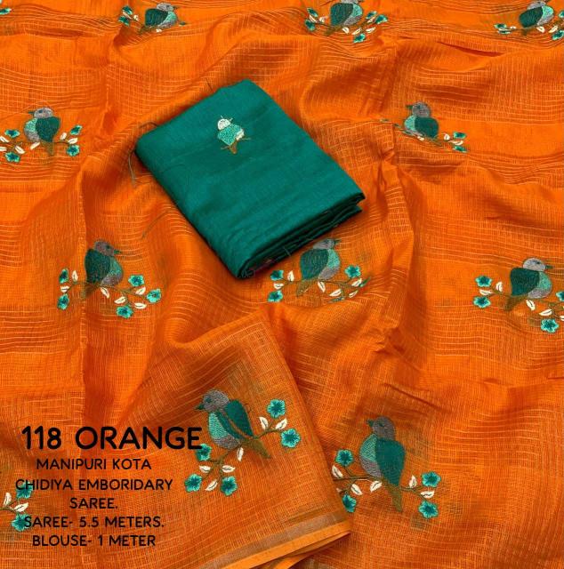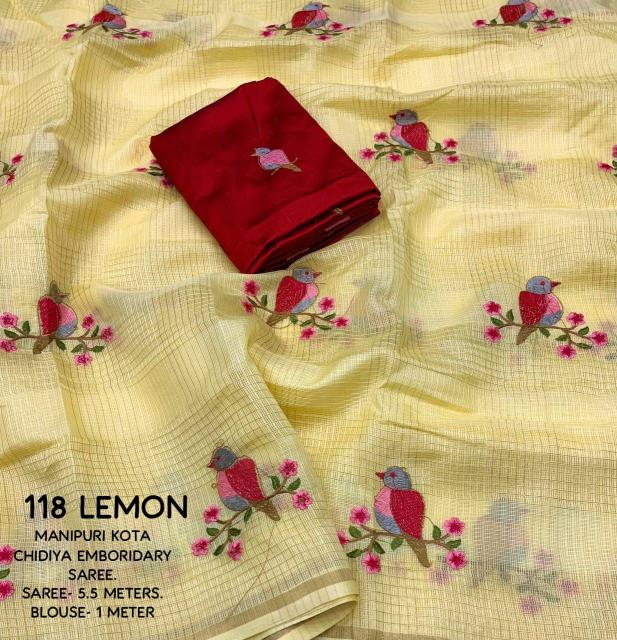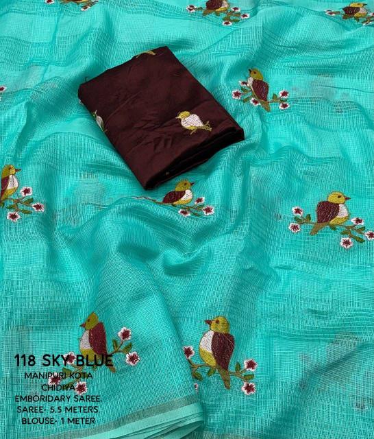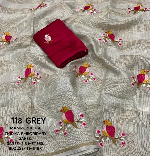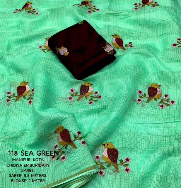 NEW ARRIVALS KC -118 Quality- manipuri kota chex saree with small zari pattu weaving border Allover CHIDIYA style embroidery which goves you some diffrent look. Emboridary is perfectly desigined for kota. Blouse - malbery silk blouse with emboridary Sarees- 5.5 meters Rate - 800/- +ship Top trusted quality |
