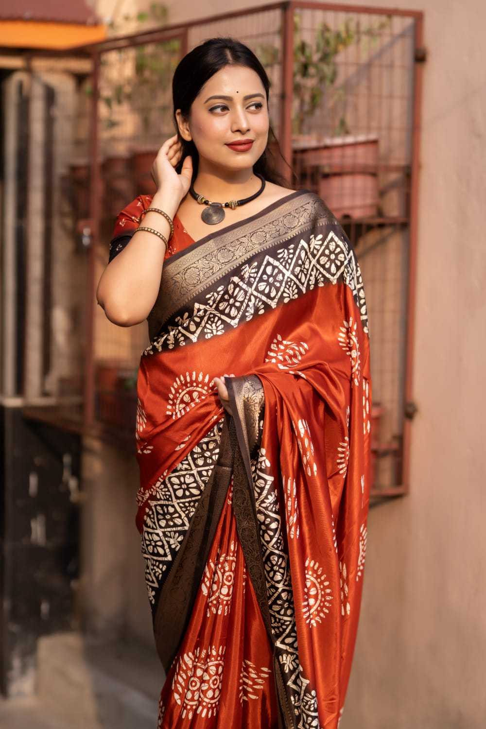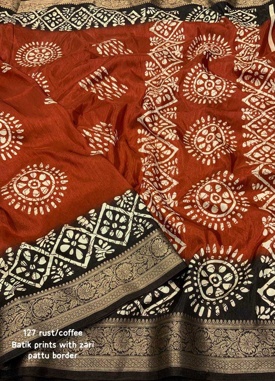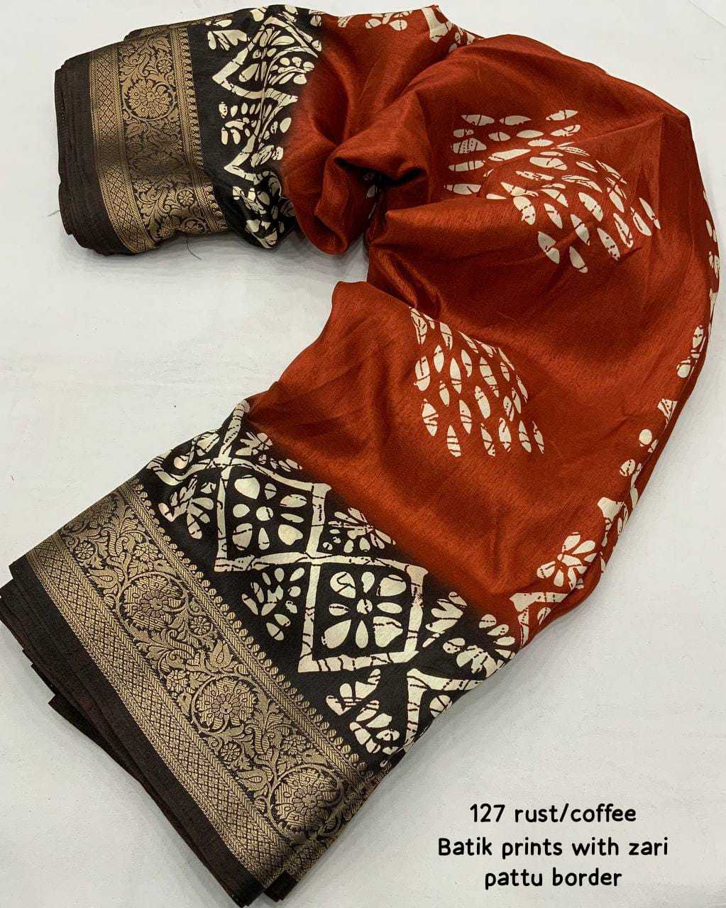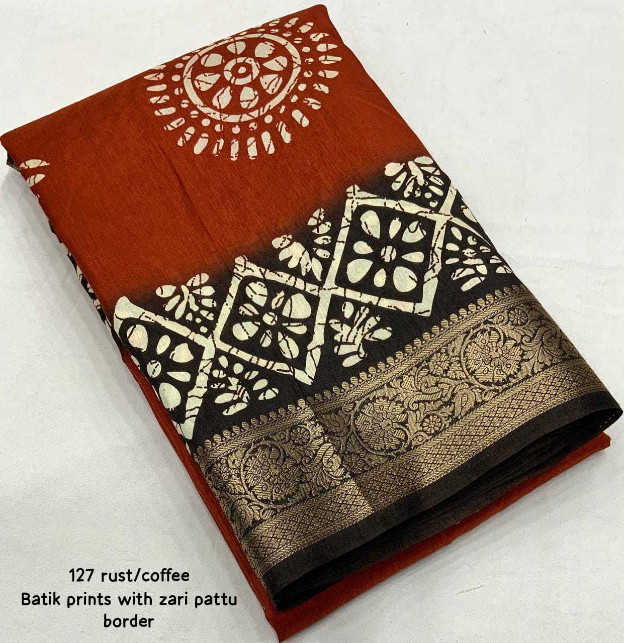 FASTEST SELLING New shaded batik printed sarees. KC-127 KC- mohini cotton crape quality- soft cotton cape with jacq zari woven border. Fresh new batik printed designs on shaded base colour. Blouse- runi.g zari pattu bordee blouse. Rate - 680/-* +ship Top trusted quality |