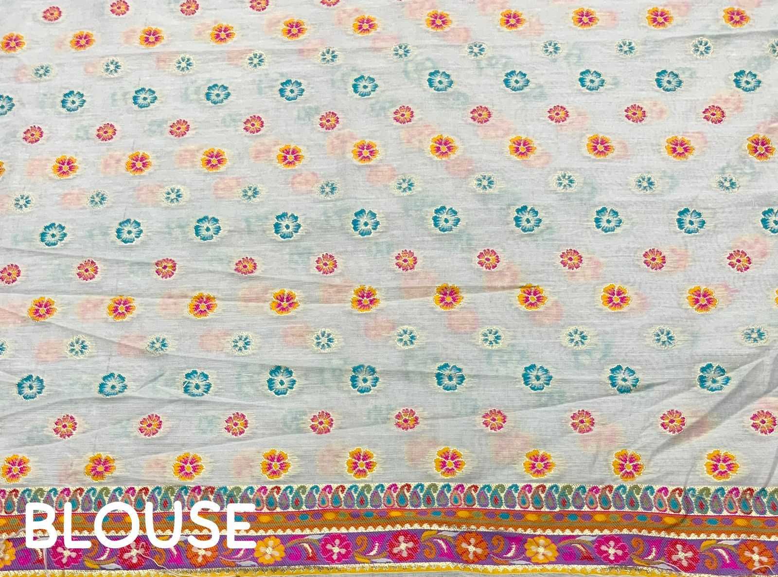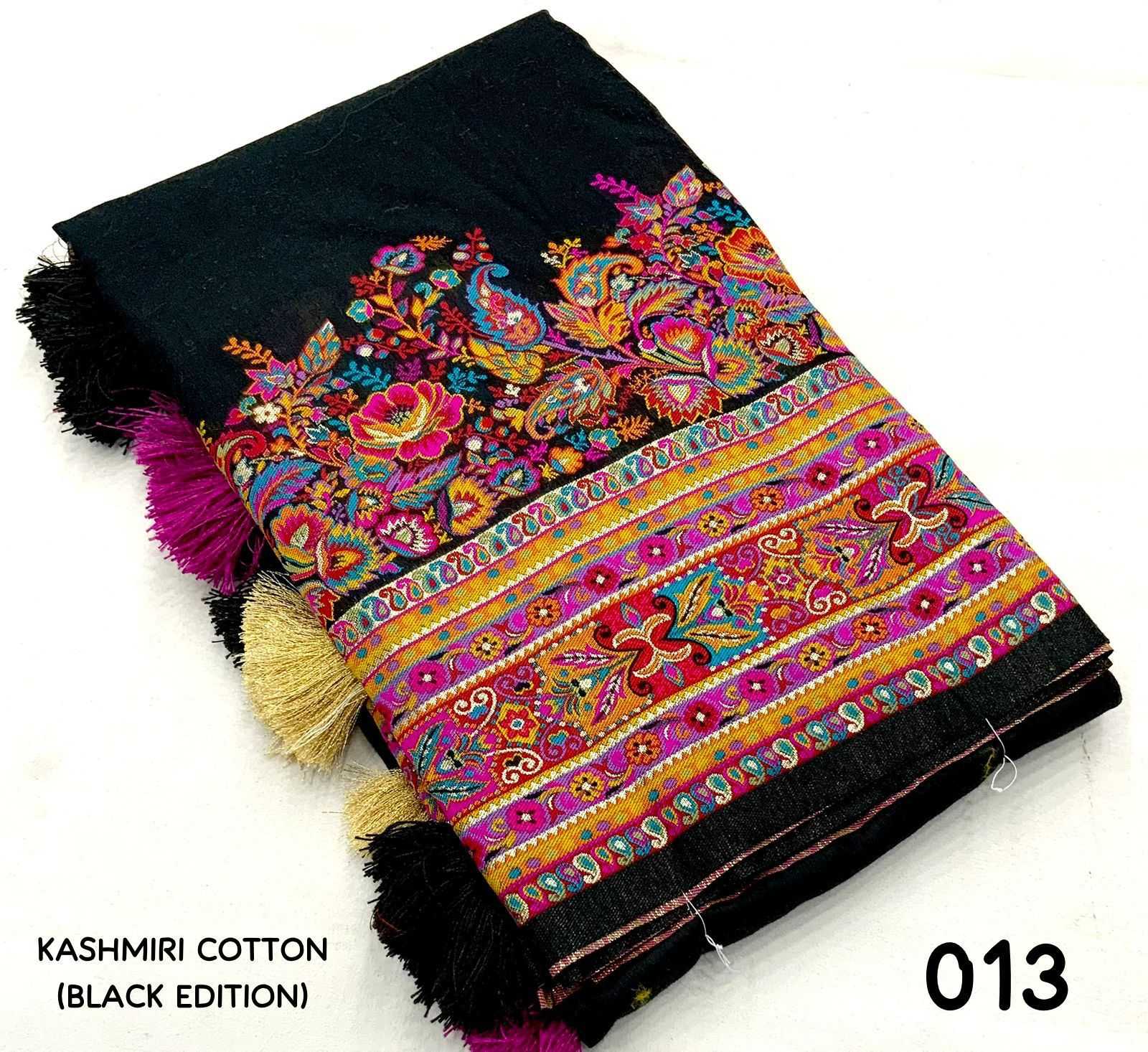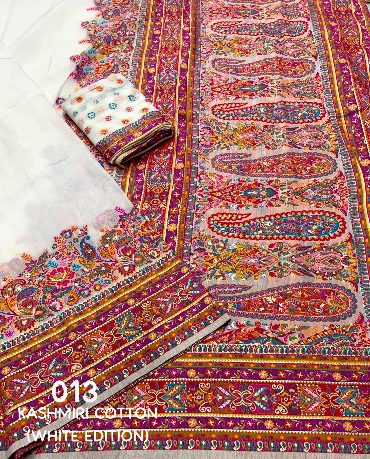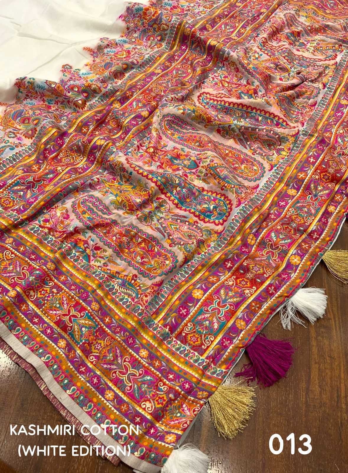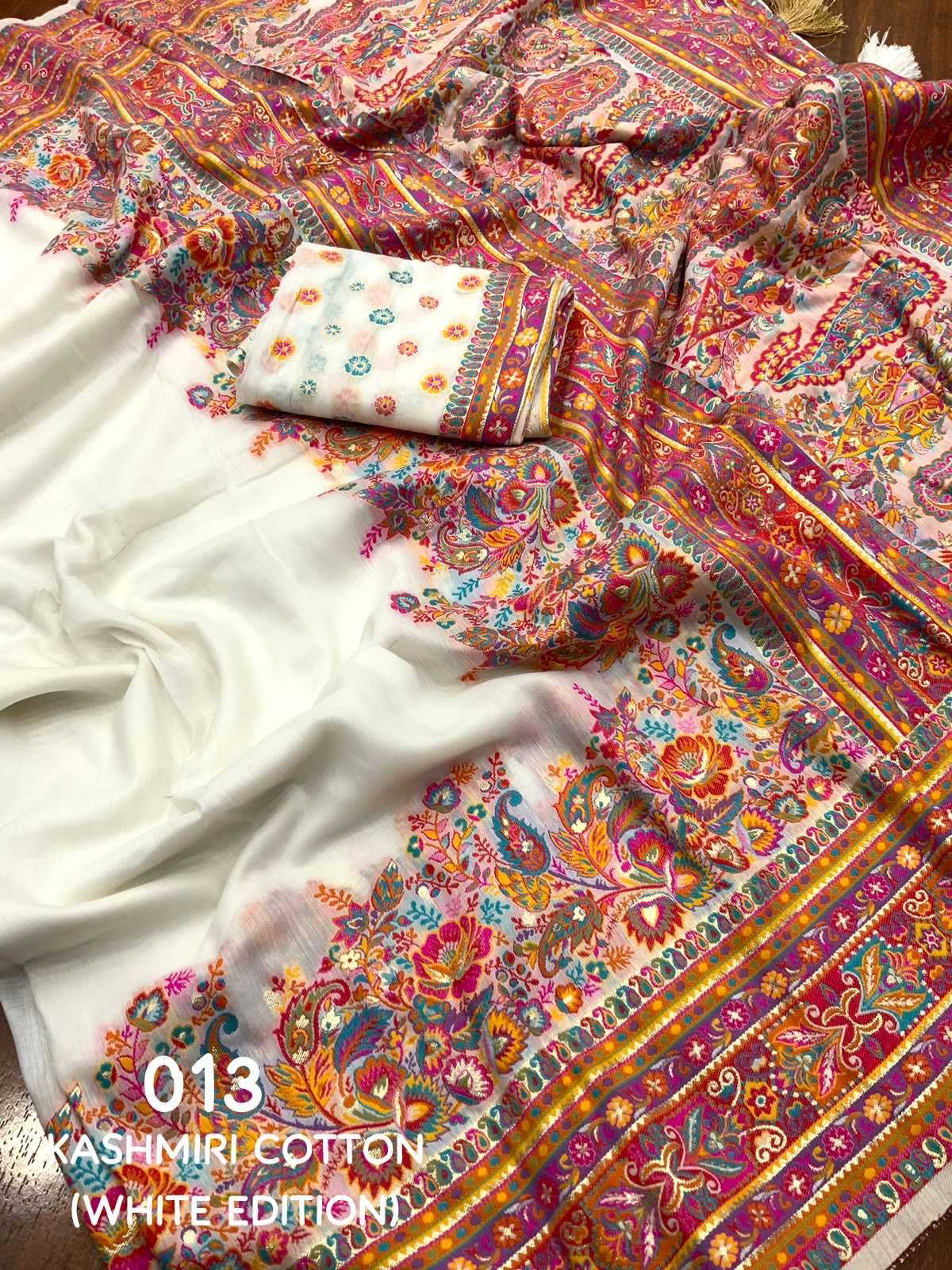 new arrivals New kashimiri cotton saree KC- 013 KC- kashmiri cotton (white edition) Quality- soft cotton saree with kashmiri style multi-color woven design. Rich pallu with cotton tassels Blouse- rich kashmiri style woven blouse. Rate- 2200+ship Top trusted quality |