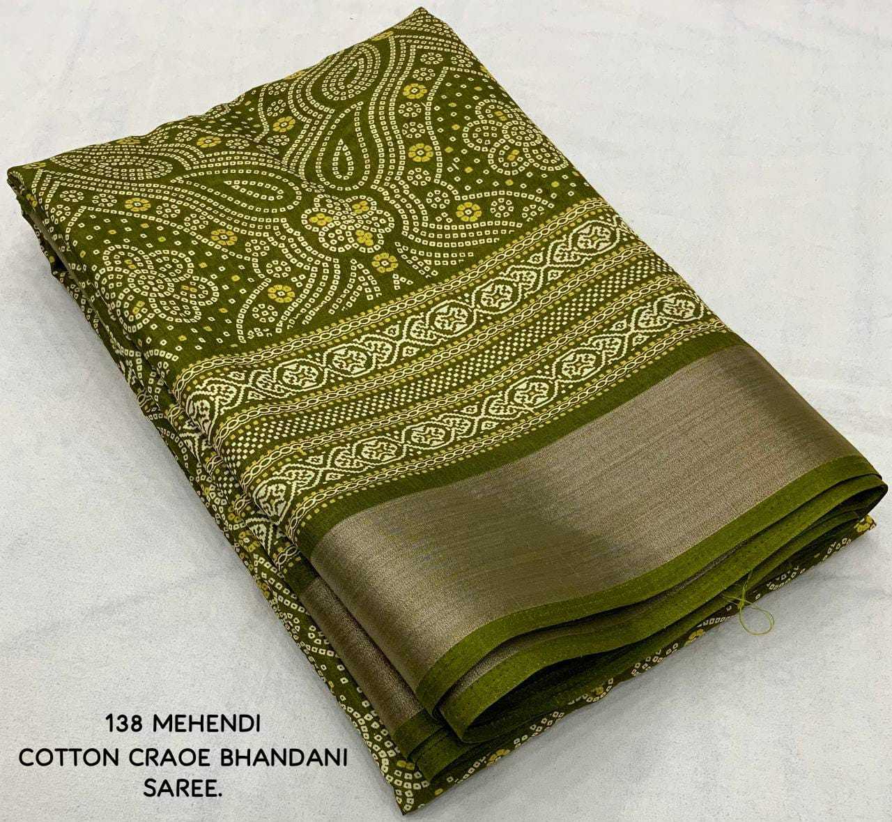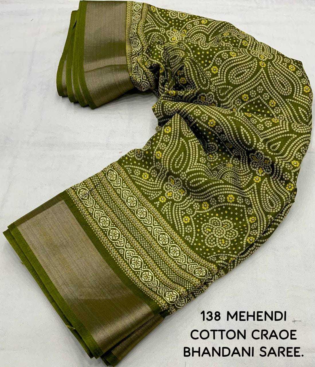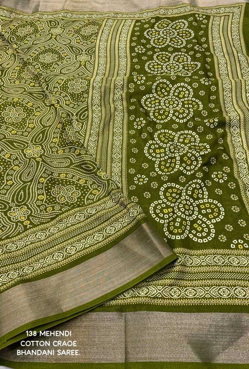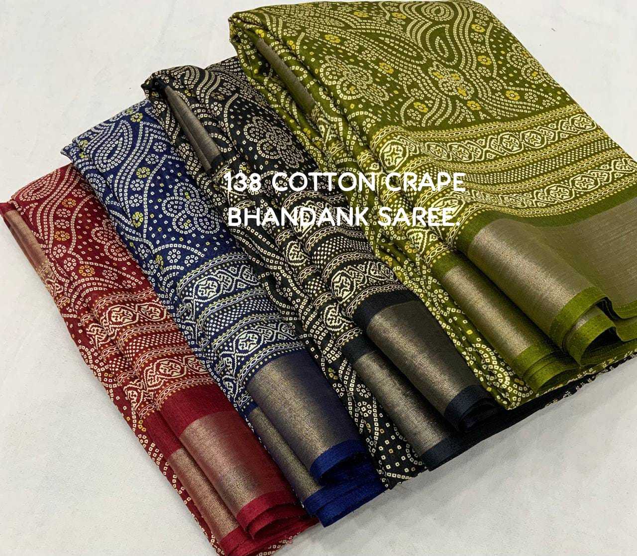 new arrivals New bhandani style printed cotton crape saree. KC - 138. KC - pencil crape (bhandani style) Quality- soft cotton crab Saree with bandhni prints and jaripattu woven border. Blouse- running cotton crape blouse. Rate - 599+ship Top trusted quality |