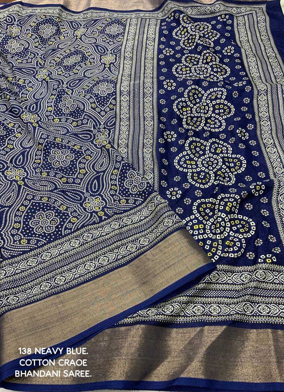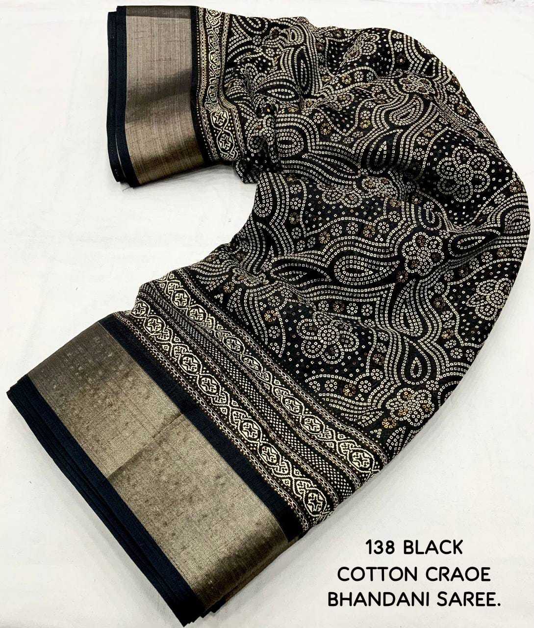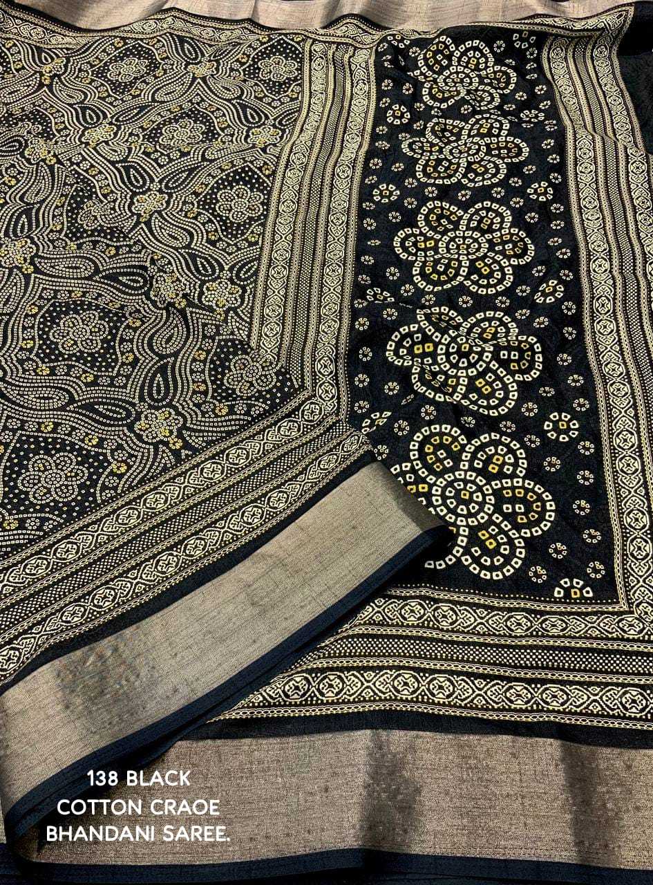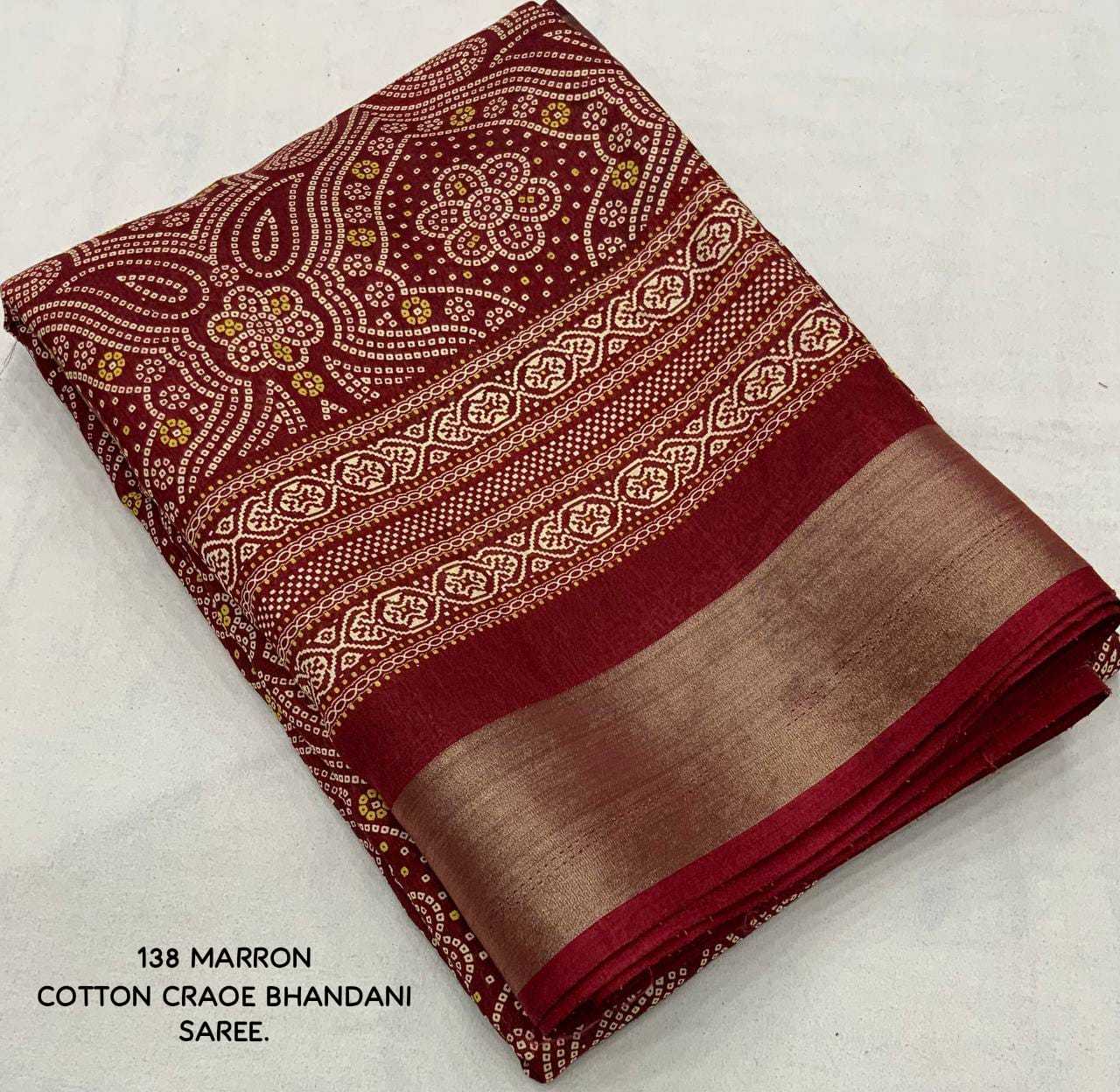 new arrivals New bhandani style printed cotton crape saree. KC - 138. KC - pencil crape (bhandani style) Quality- soft cotton crab Saree with bandhni prints and jaripattu woven border. Blouse- running cotton crape blouse. Rate - 599+ship Top trusted quality |