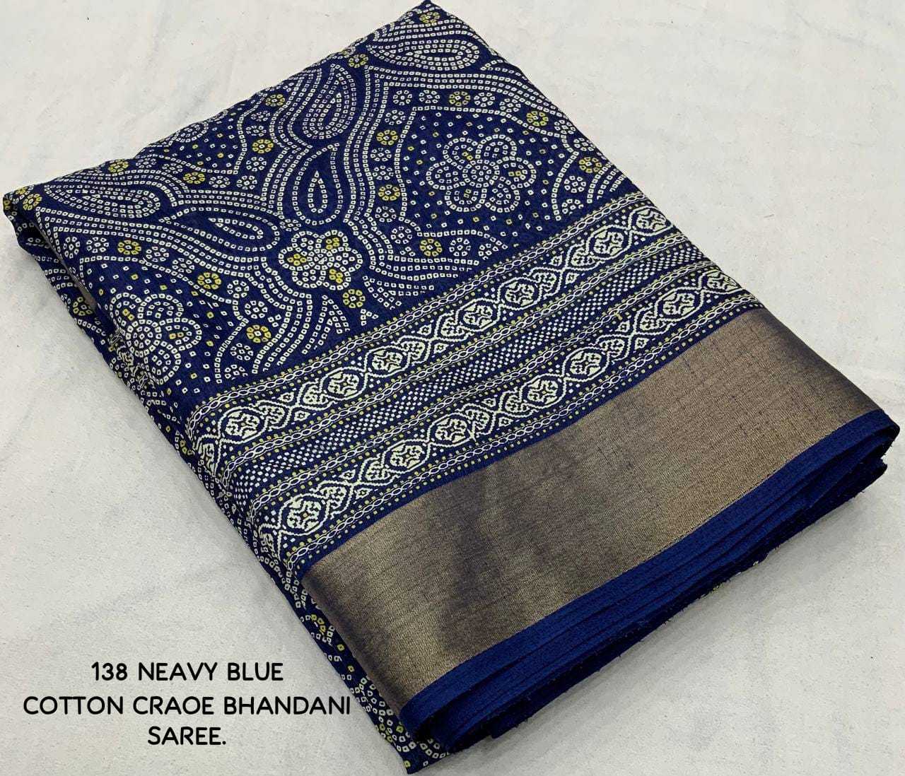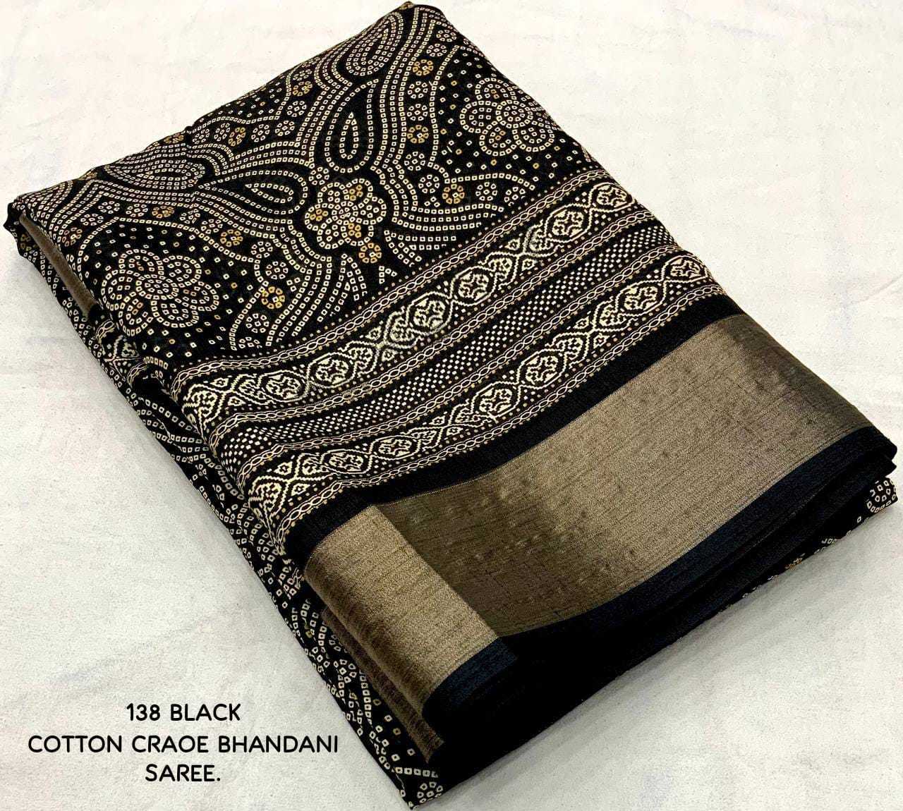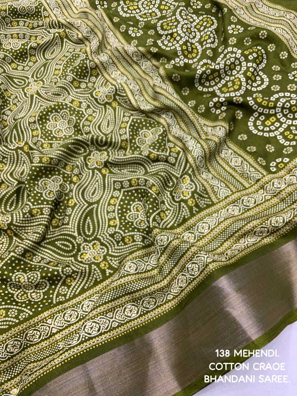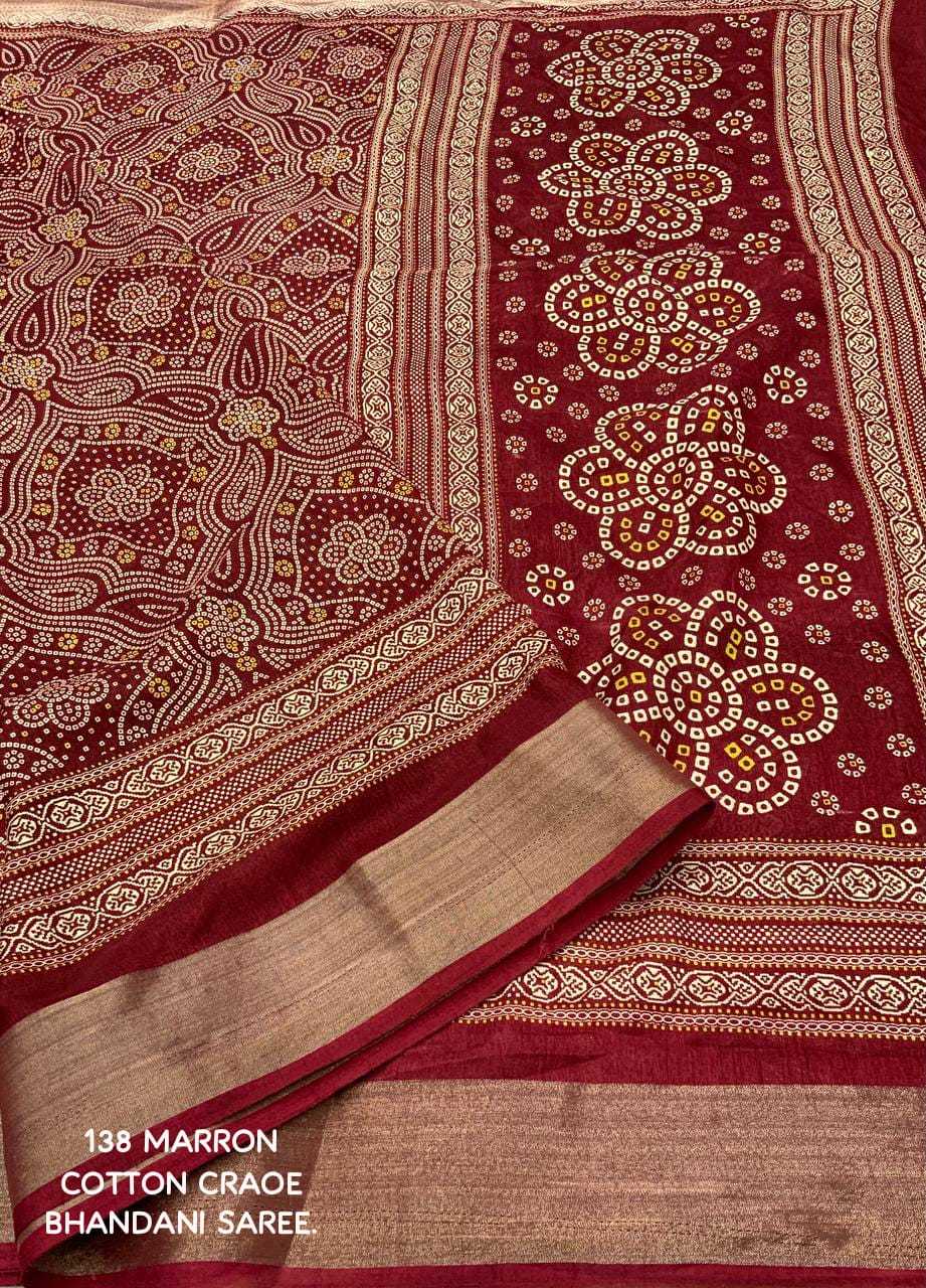 new arrivals New bhandani style printed cotton crape saree. KC - 138. KC - pencil crape (bhandani style) Quality- soft cotton crab Saree with bandhni prints and jaripattu woven border. Blouse- running cotton crape blouse. Rate - 599+ship Top trusted quality |
