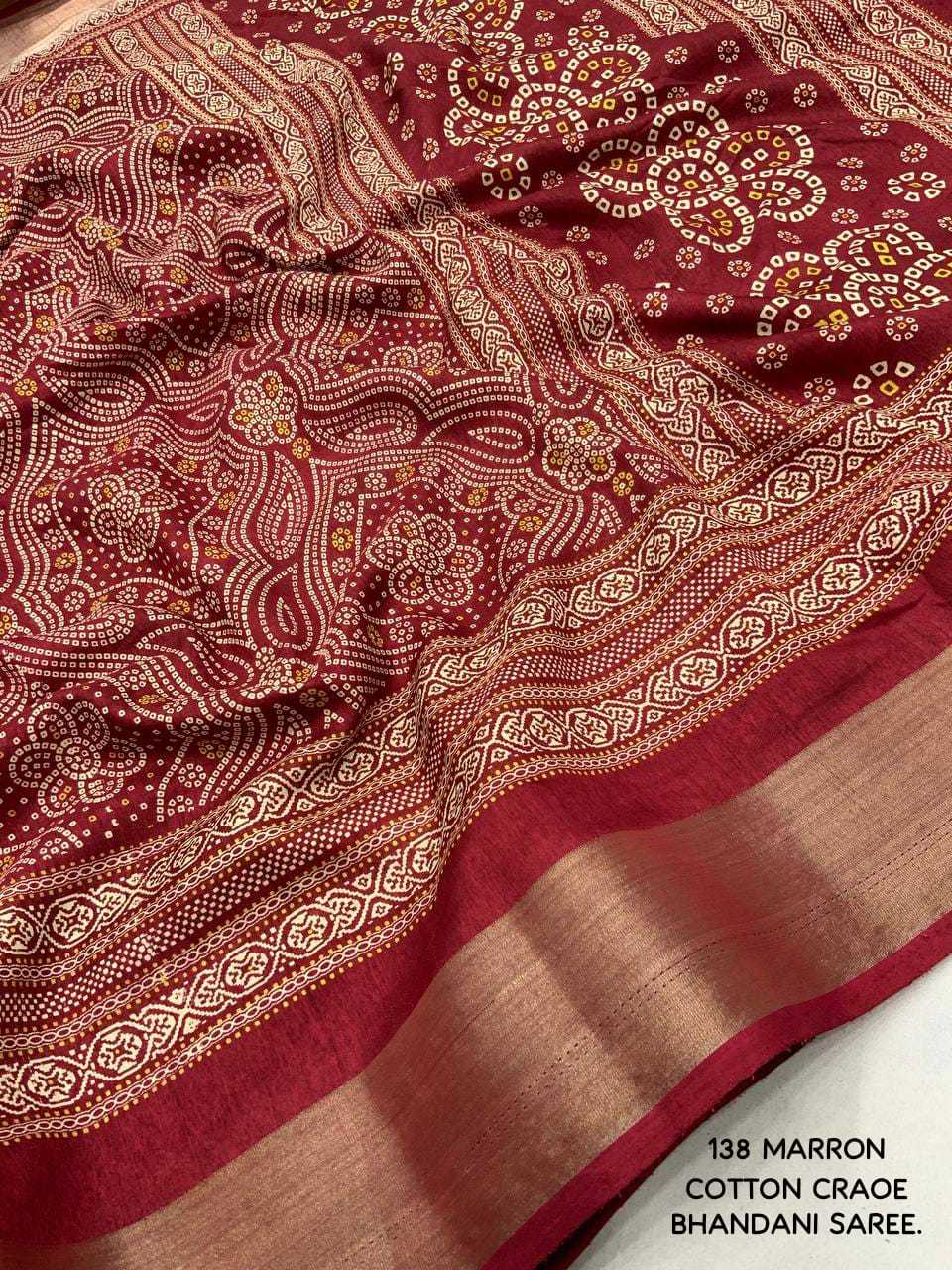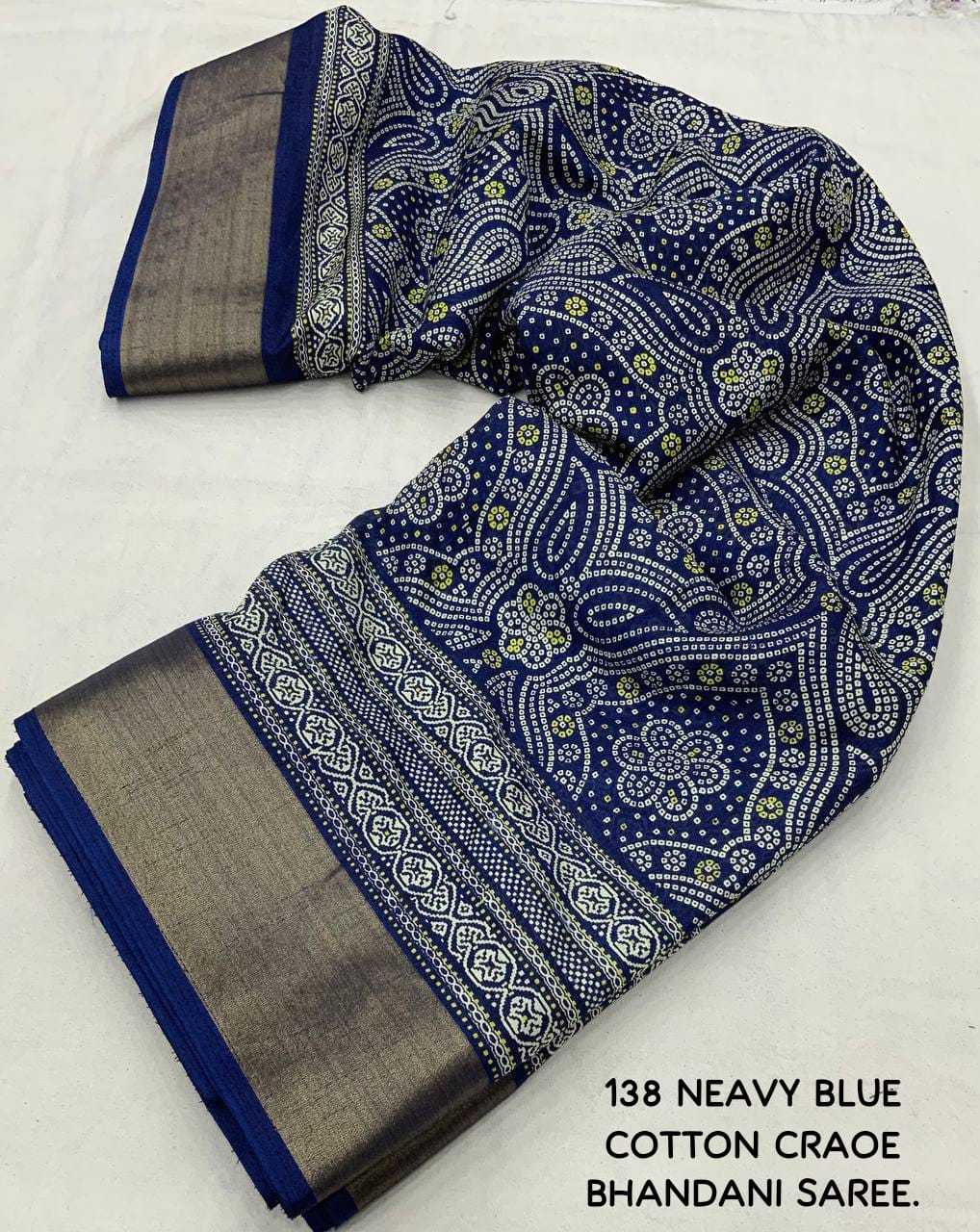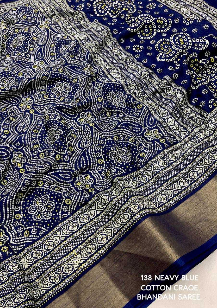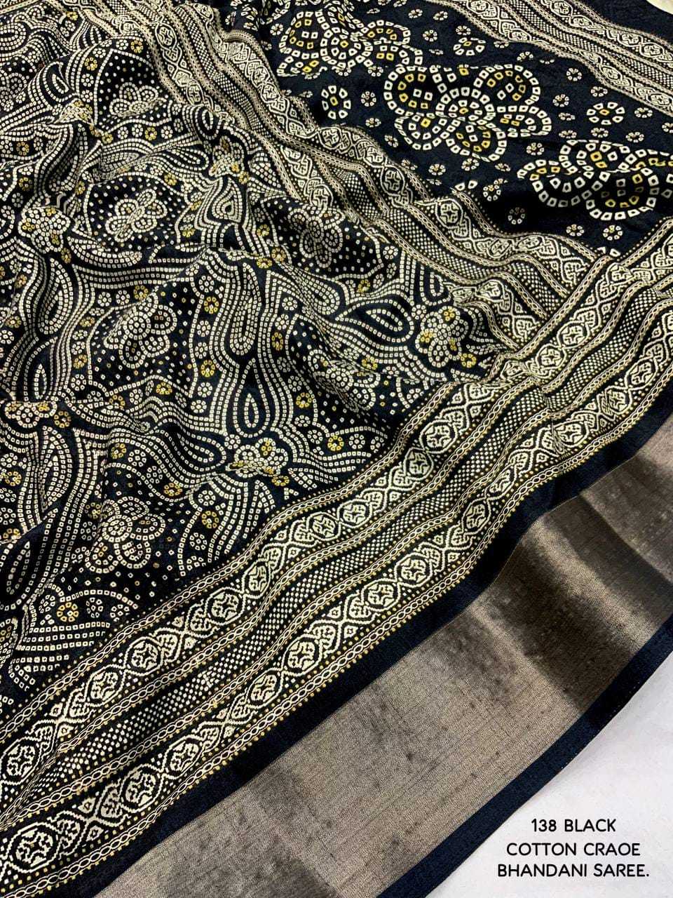 new arrivals New bhandani style printed cotton crape saree. KC - 138. KC - pencil crape (bhandani style) Quality- soft cotton crab Saree with bandhni prints and jaripattu woven border. Blouse- running cotton crape blouse. Rate - 599+ship Top trusted quality |