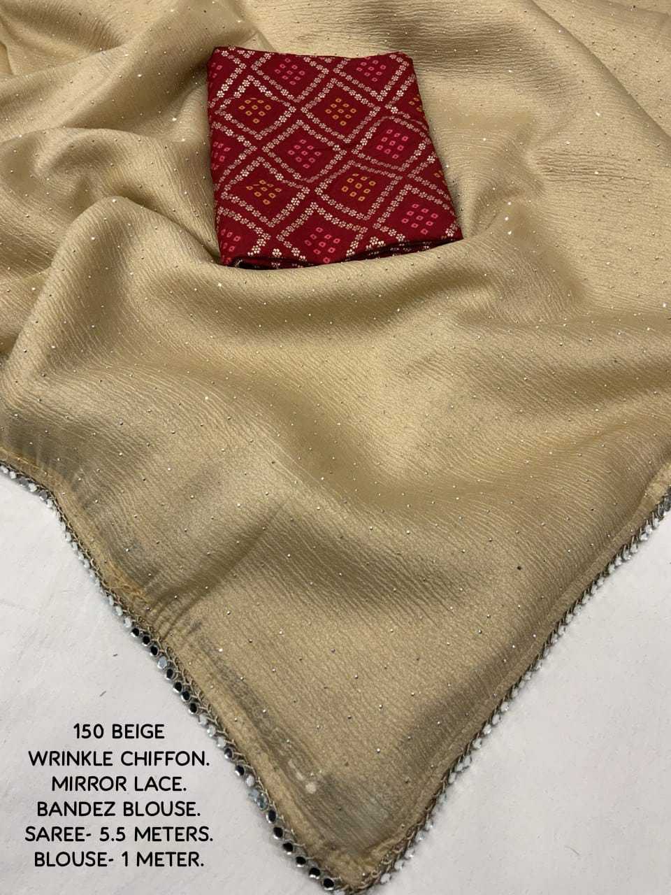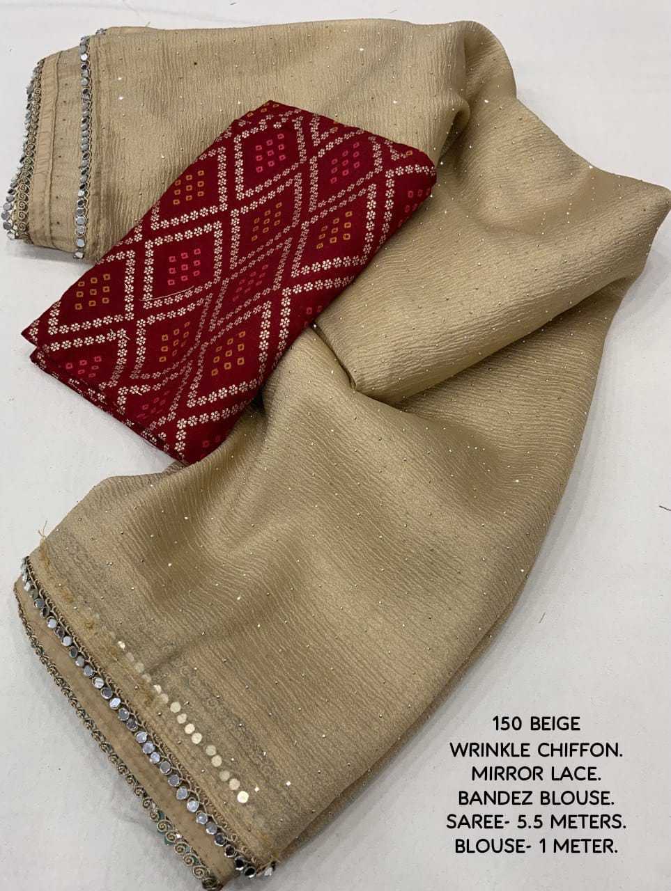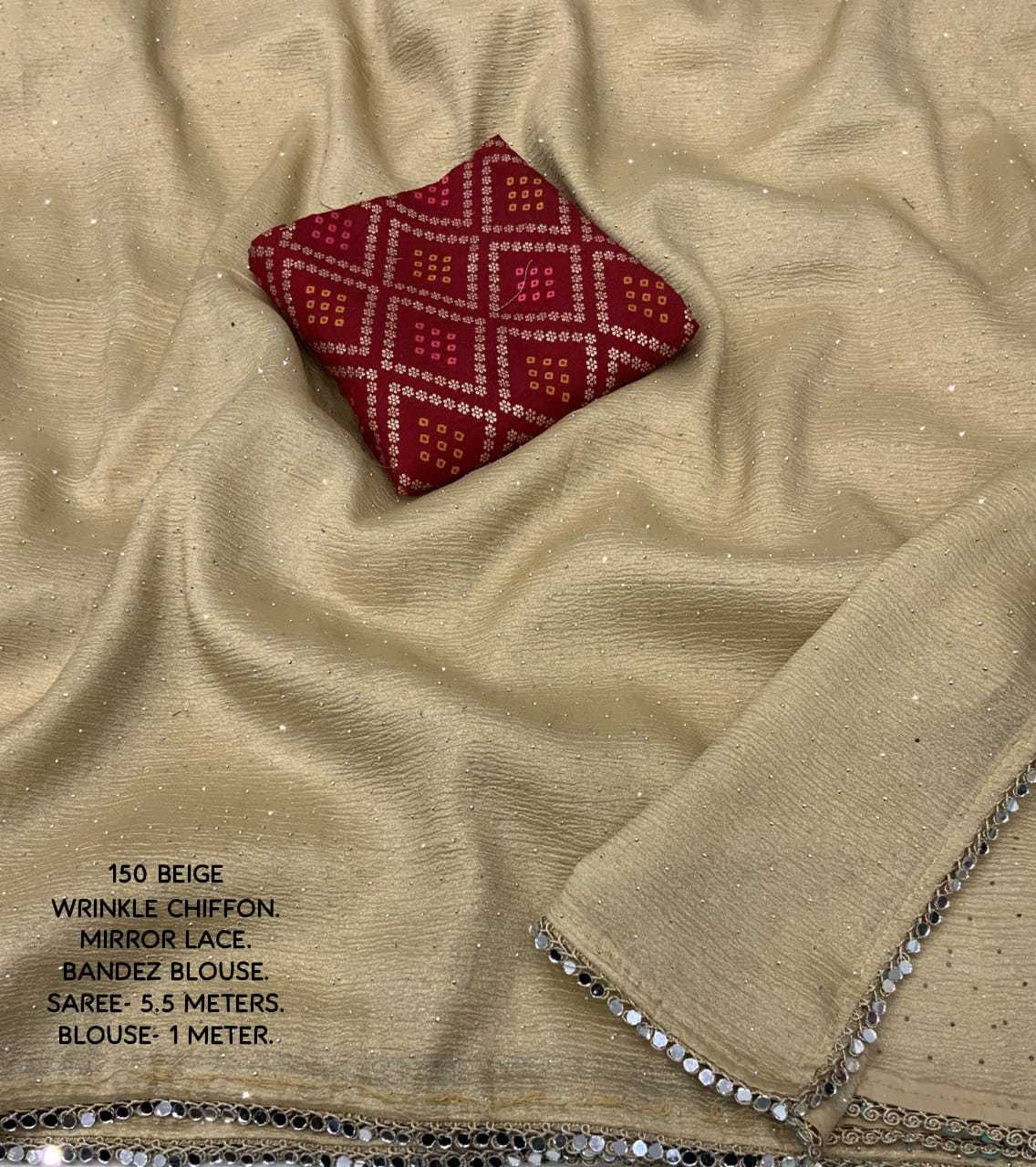 new arrivals New premium wrinkle chiffon saree. KC- 150 KC- wrinkle chiffon (BEIGE EDITION) QUALITY-soft chiffon saree with woven wrinkle on it. Mirror lace with siroski work allover saree. Blouse - tye and dye bandez woven banarasi silk blouse. Rate - 1700+ship Top trusted quality |