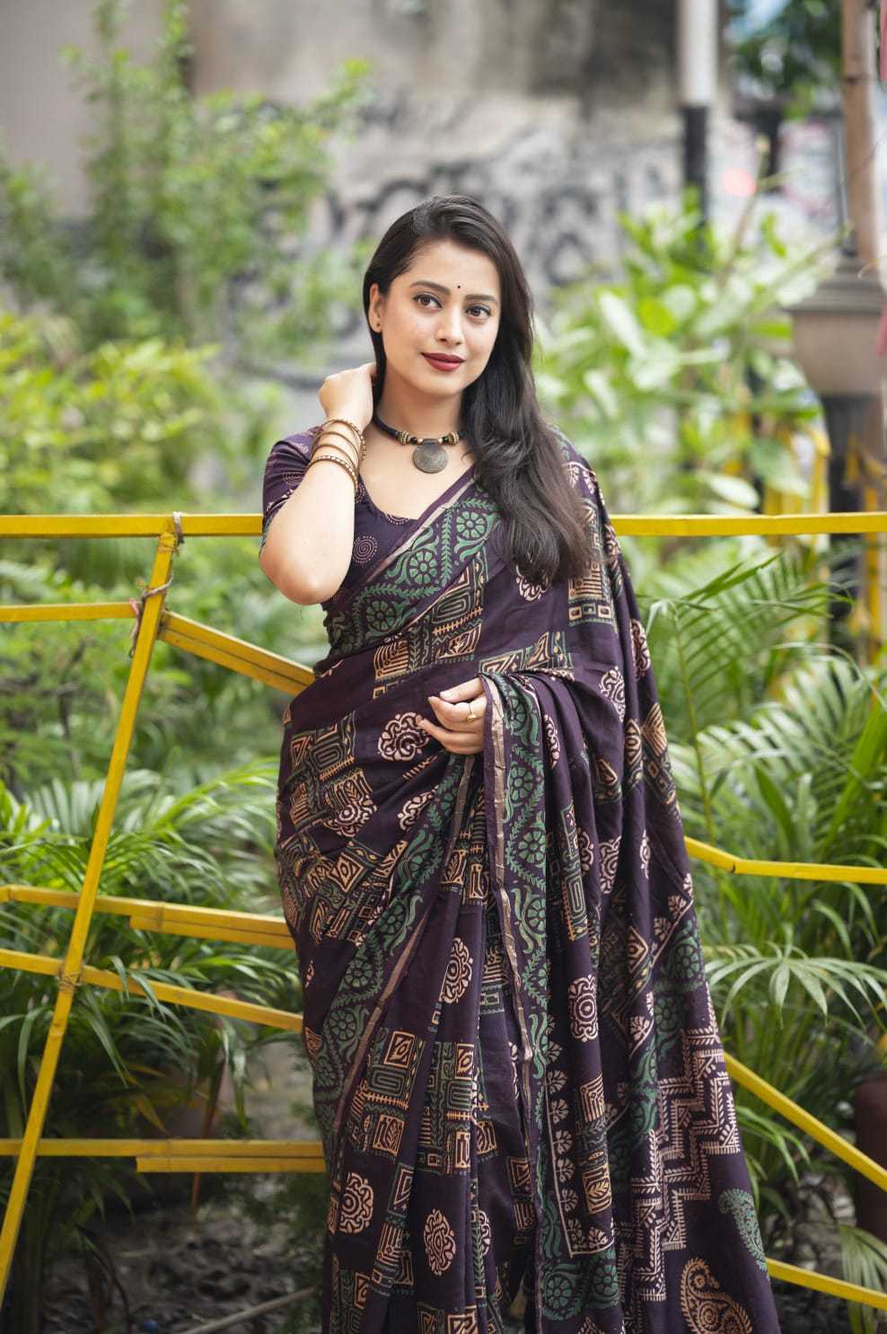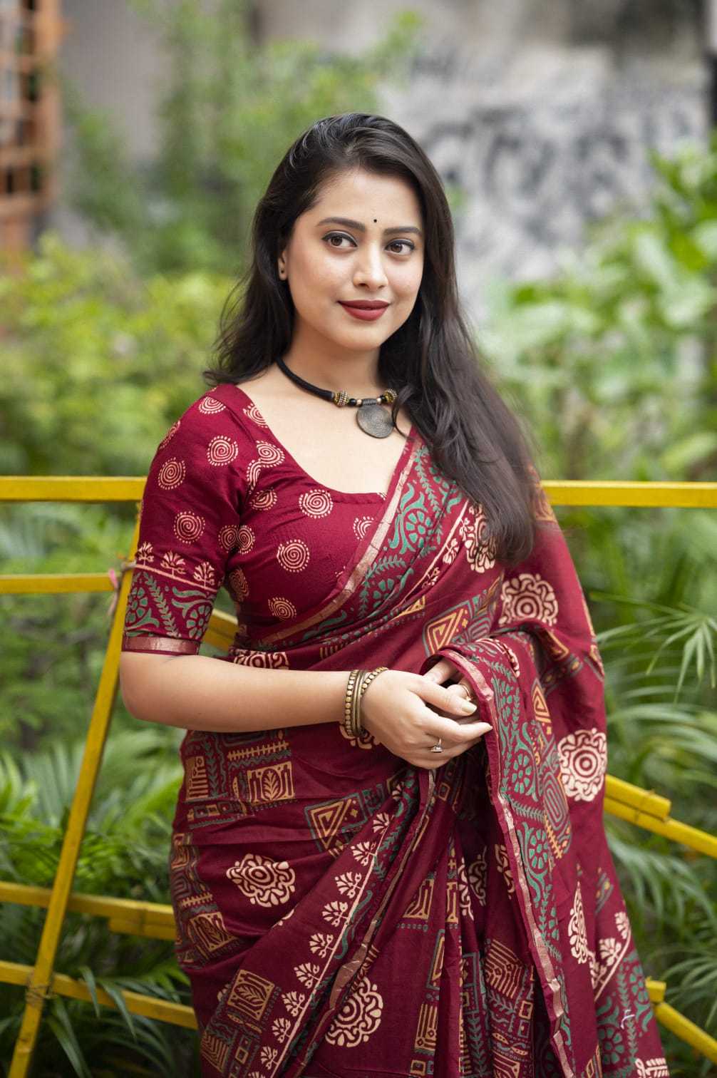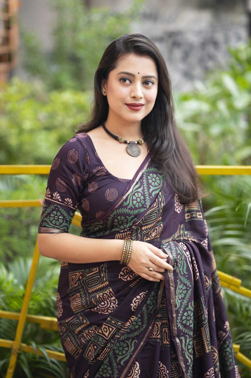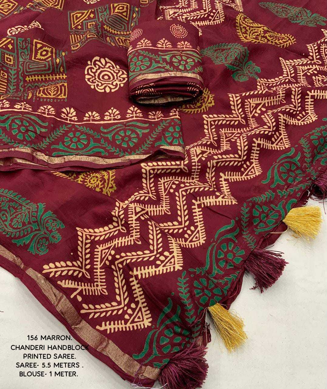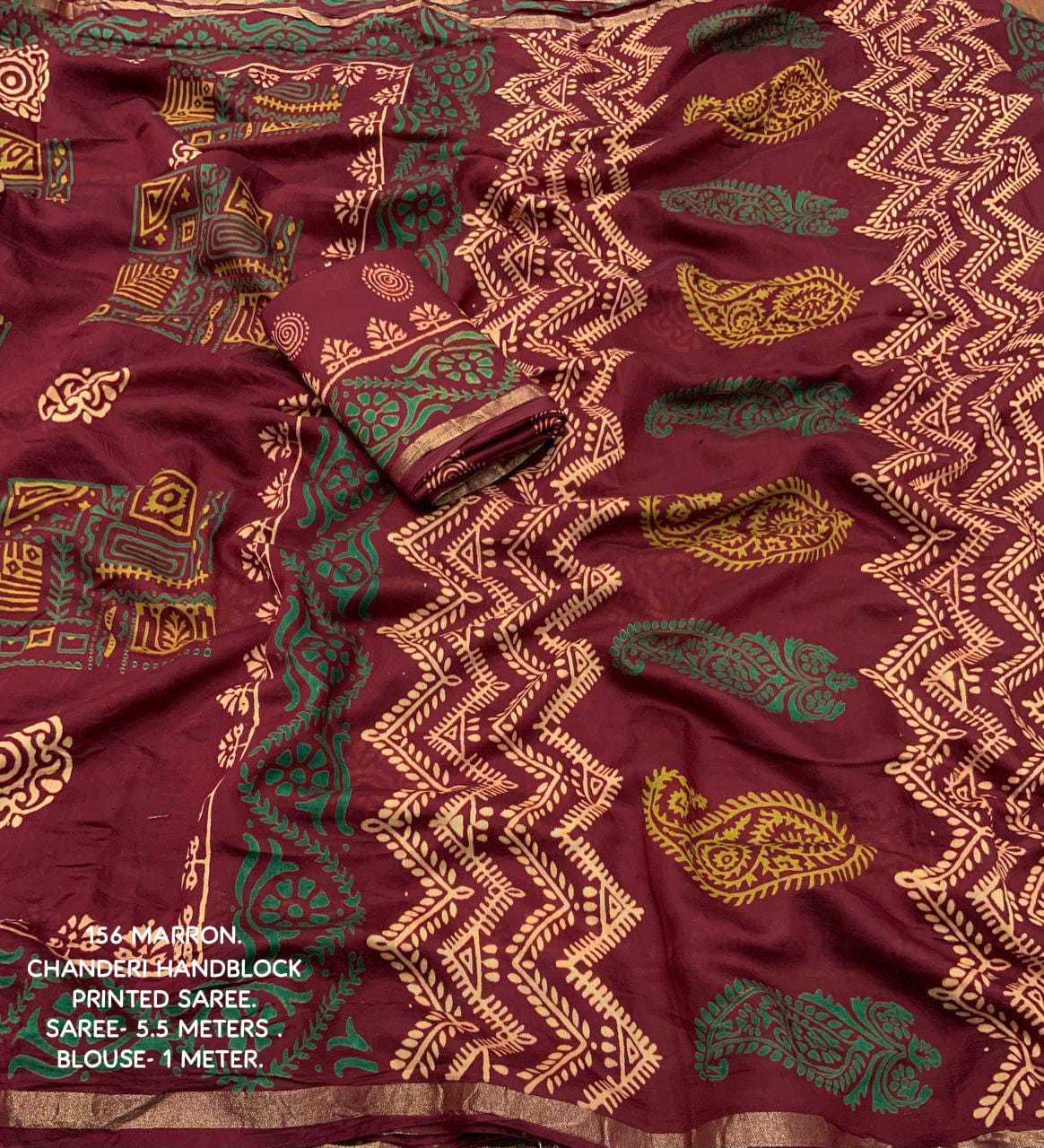 new arrivals New premium hand block printed ajrakh saree. KC- 156. KC- magic Ajrakh (d-3) Quality- pure chanderi cotton zare with zari woven pattu border. Ajrakh butta style hand block prints. Blouse- pure chanderi hand block printed blouse. Rate - 1350+ship Top premium quality |