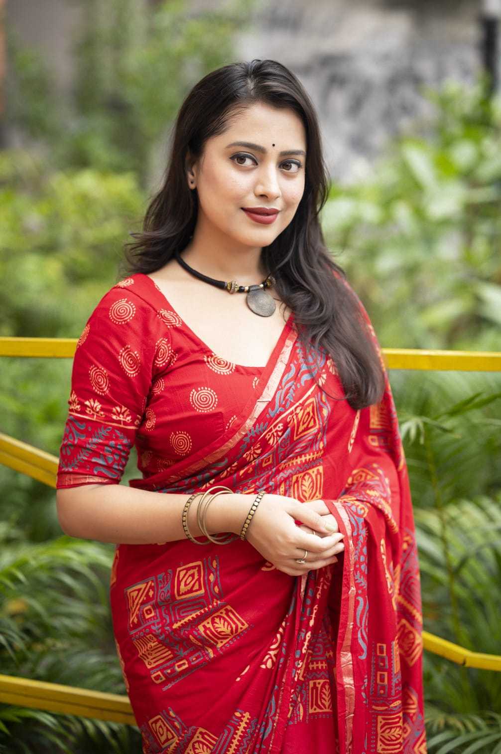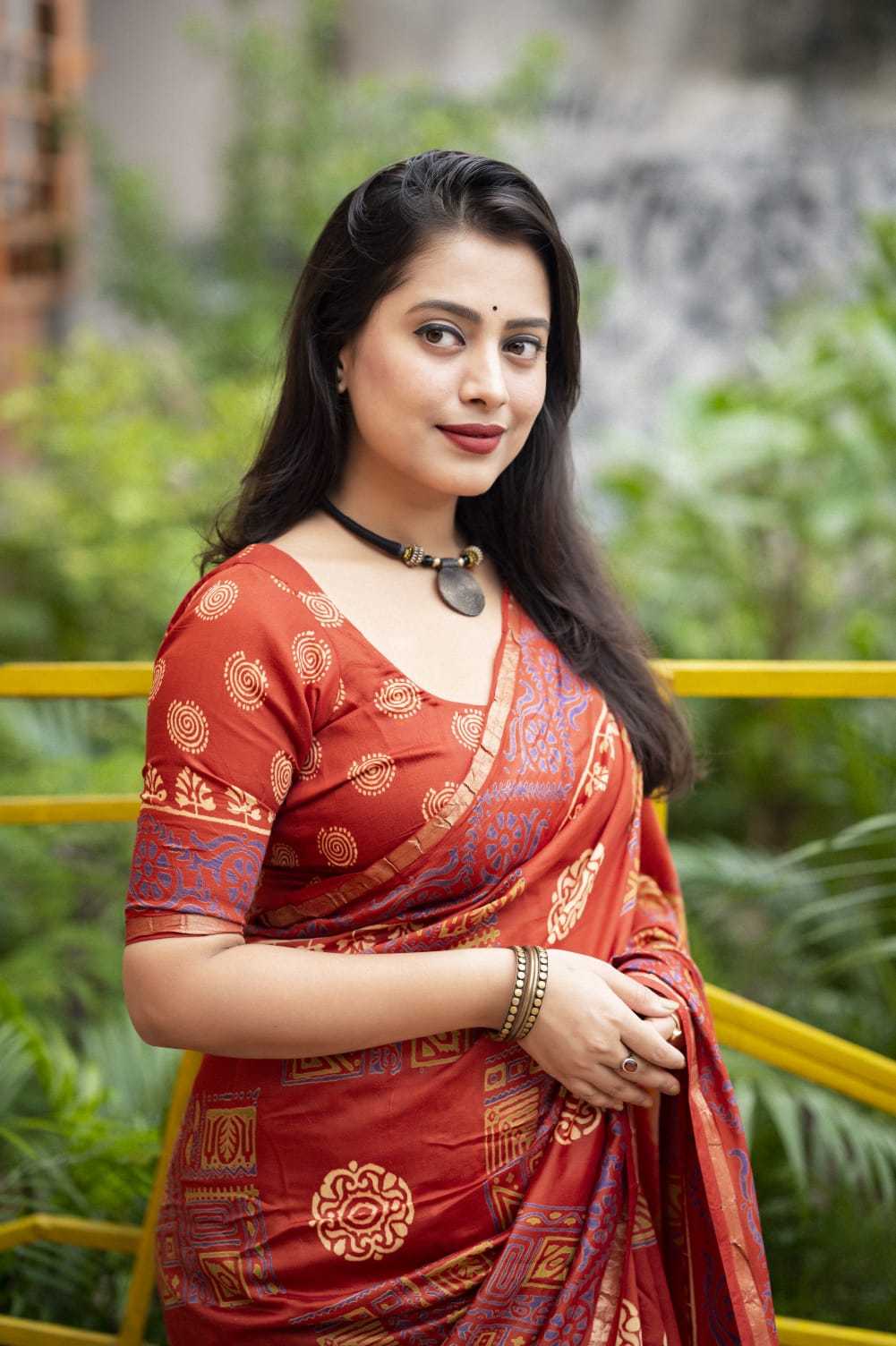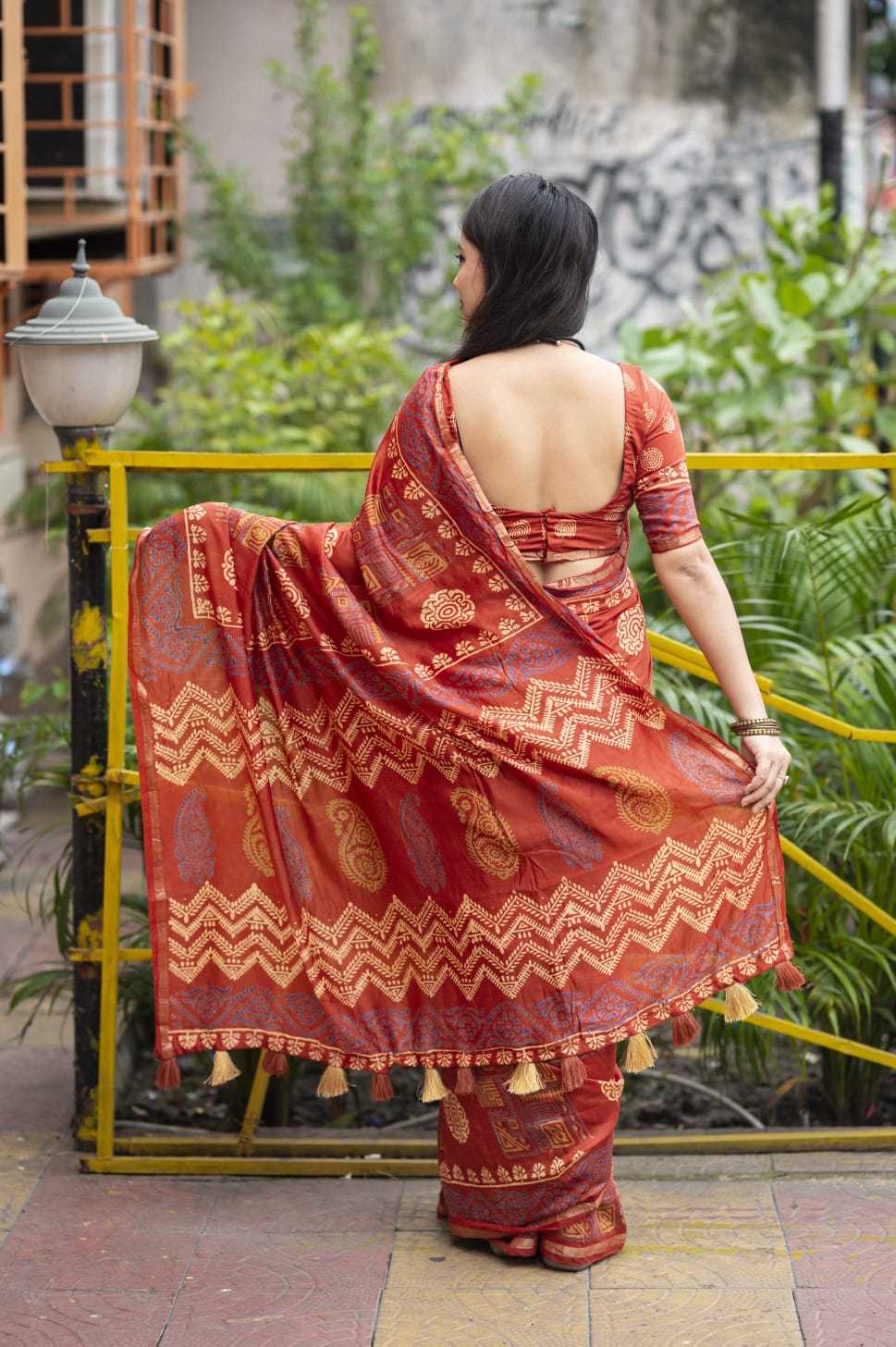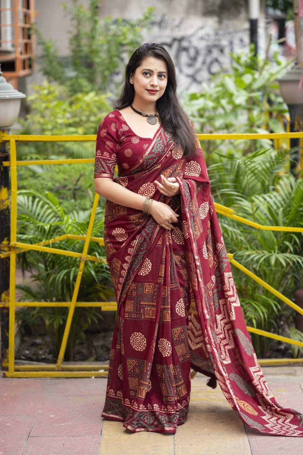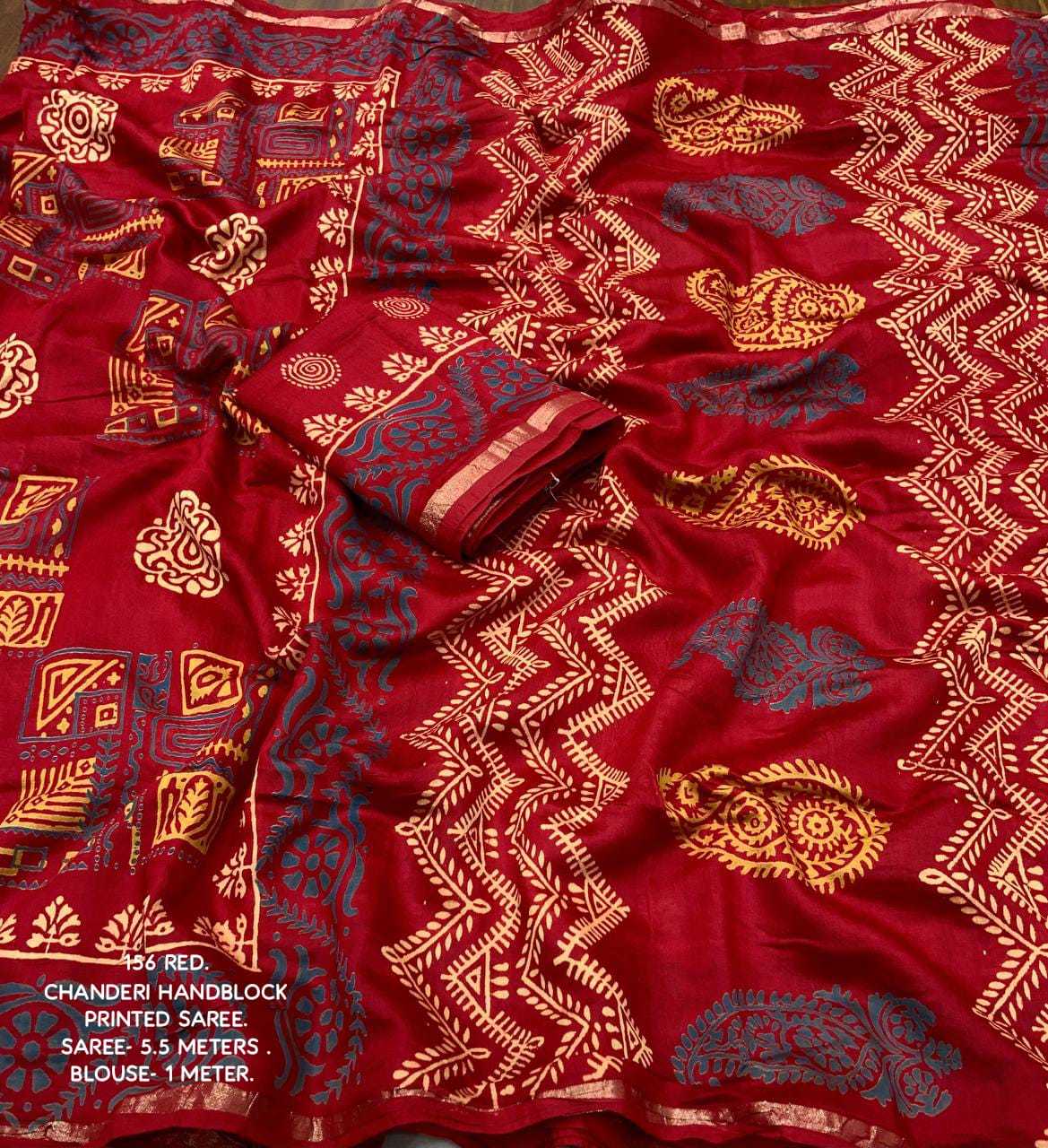 new arrivals New premium hand block printed ajrakh saree. KC- 156. KC- magic Ajrakh (d-3) Quality- pure chanderi cotton zare with zari woven pattu border. Ajrakh butta style hand block prints. Blouse- pure chanderi hand block printed blouse. Rate - 1350+ship Top premium quality |