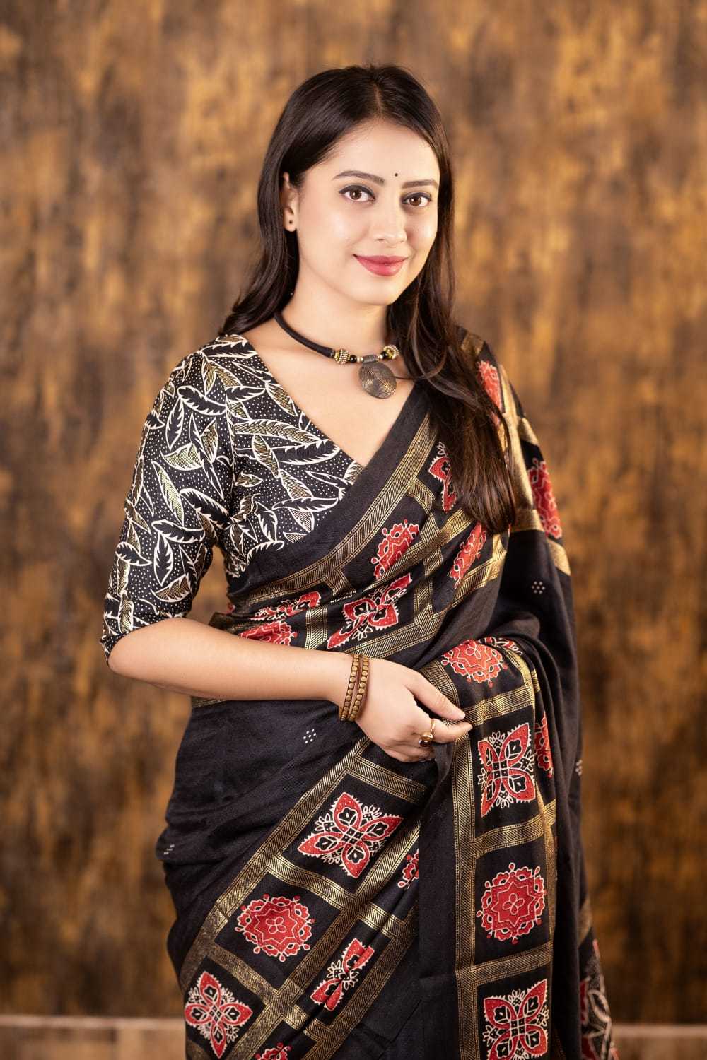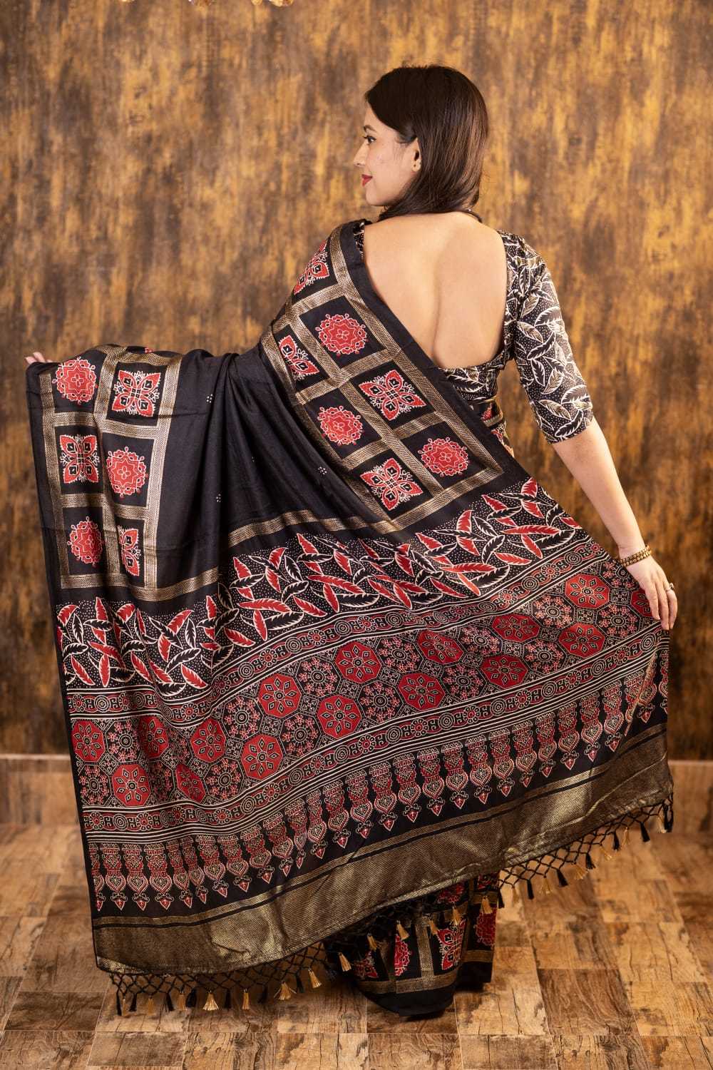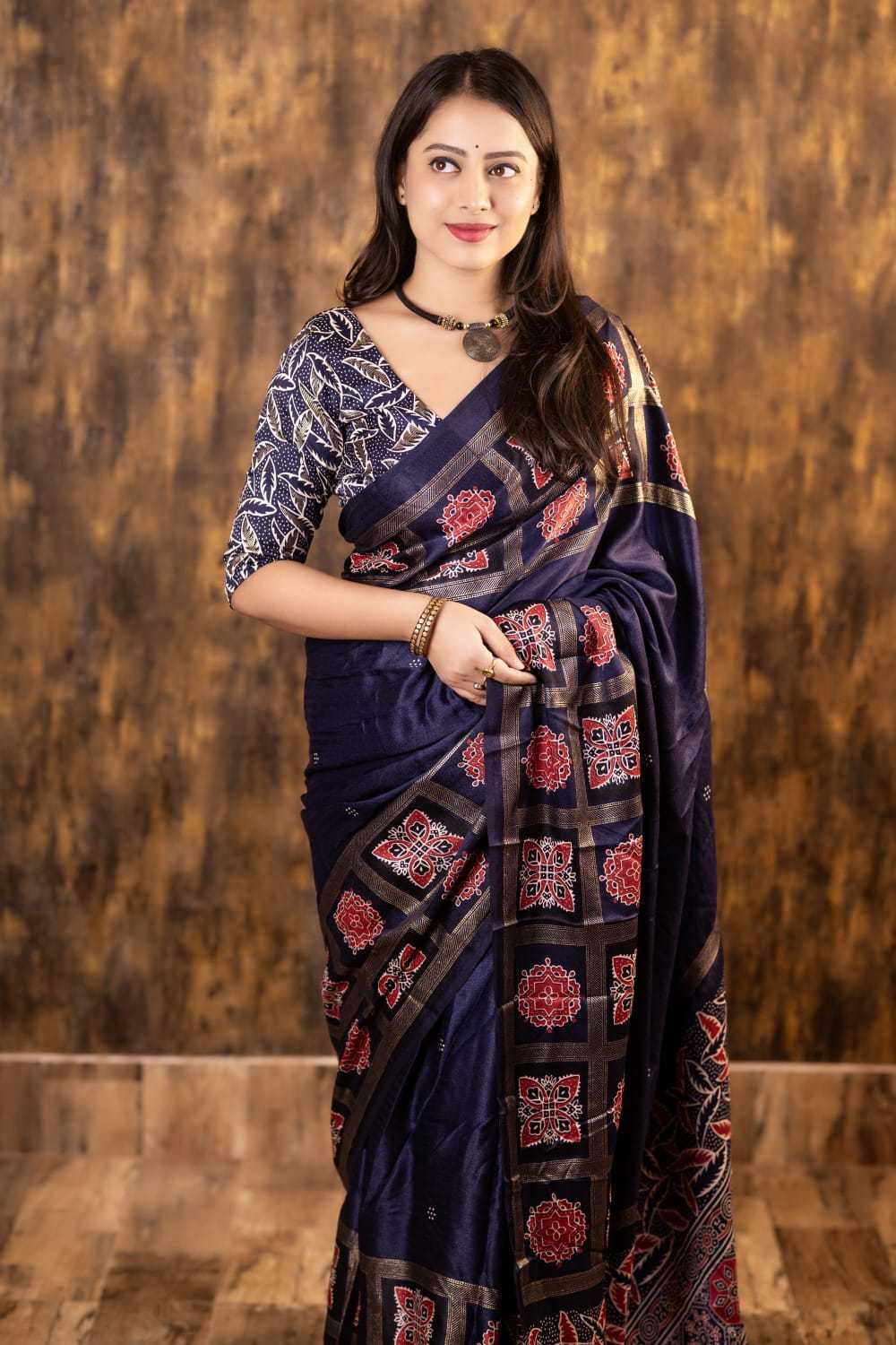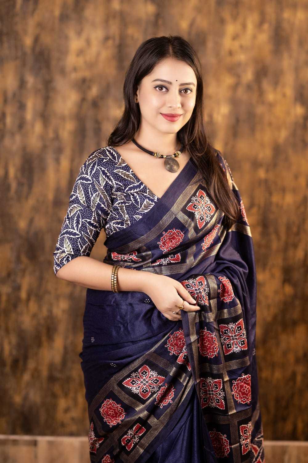 new arrivals New trending ajrakh style pashmina saree KC- 160 KC- pashmina d-3 Quality- soft pashmima silk saree with ajrakh style prints and foil work on it. Tassles on pallu. Blouse- running pashmina silk blouse. Rate - 690+ship Top trusted quality |