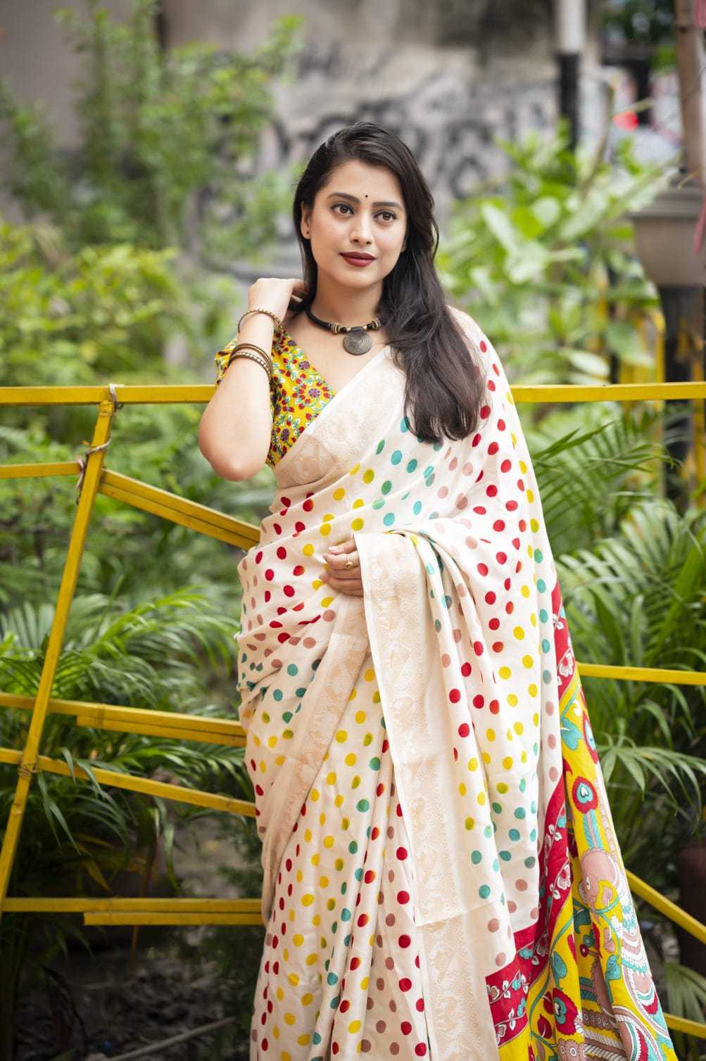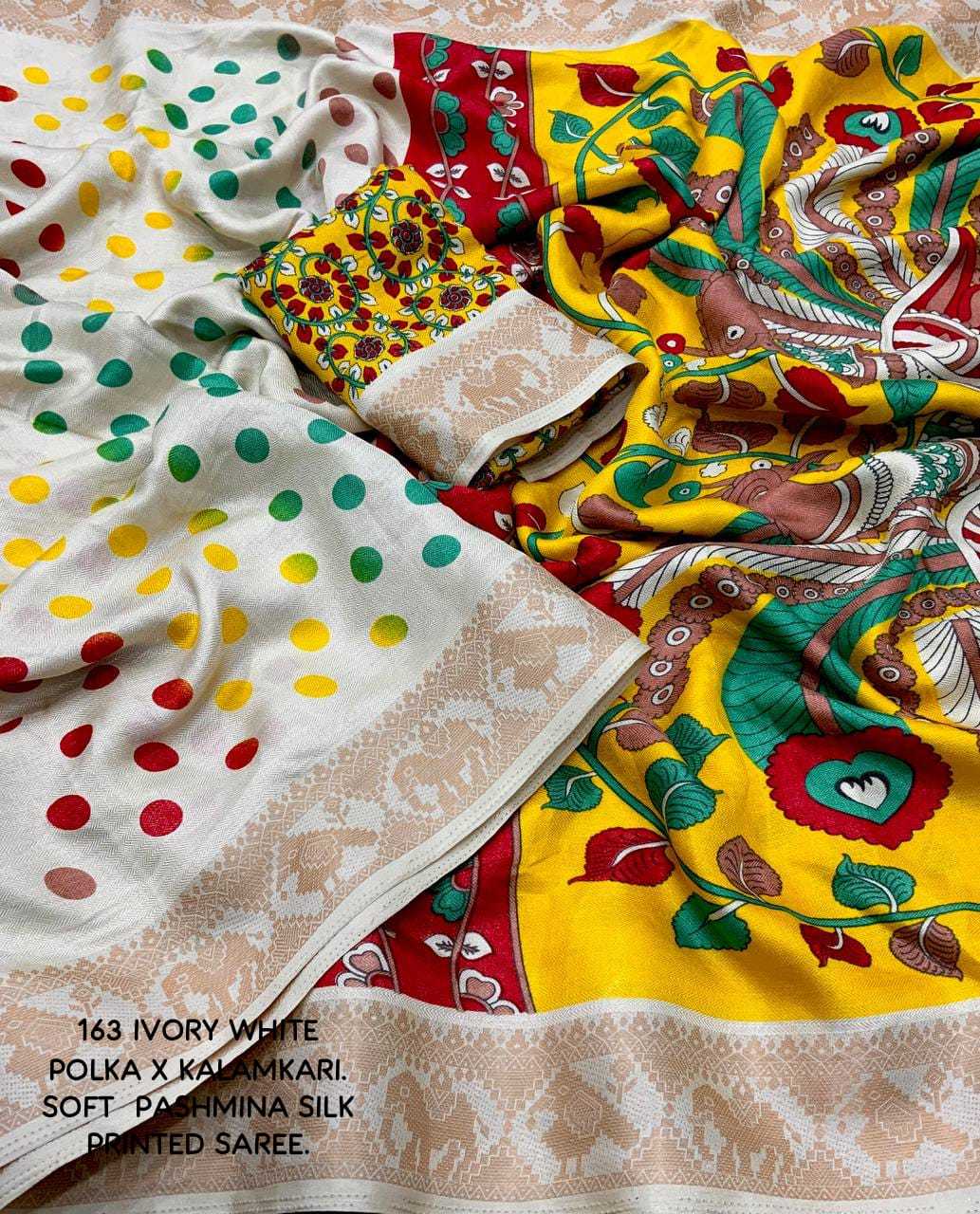 new arrivals New premium pashmina printed saree POLKADOT X KALAMKARI KC 163 PASHMINA POLKA. quality- soft pashmina silk zaree with zari woven border and self woven design all-over saree. Polka dot prints with bright big kalamkari pallu and blouse. Rate - 730+ship. Top trusted quality |