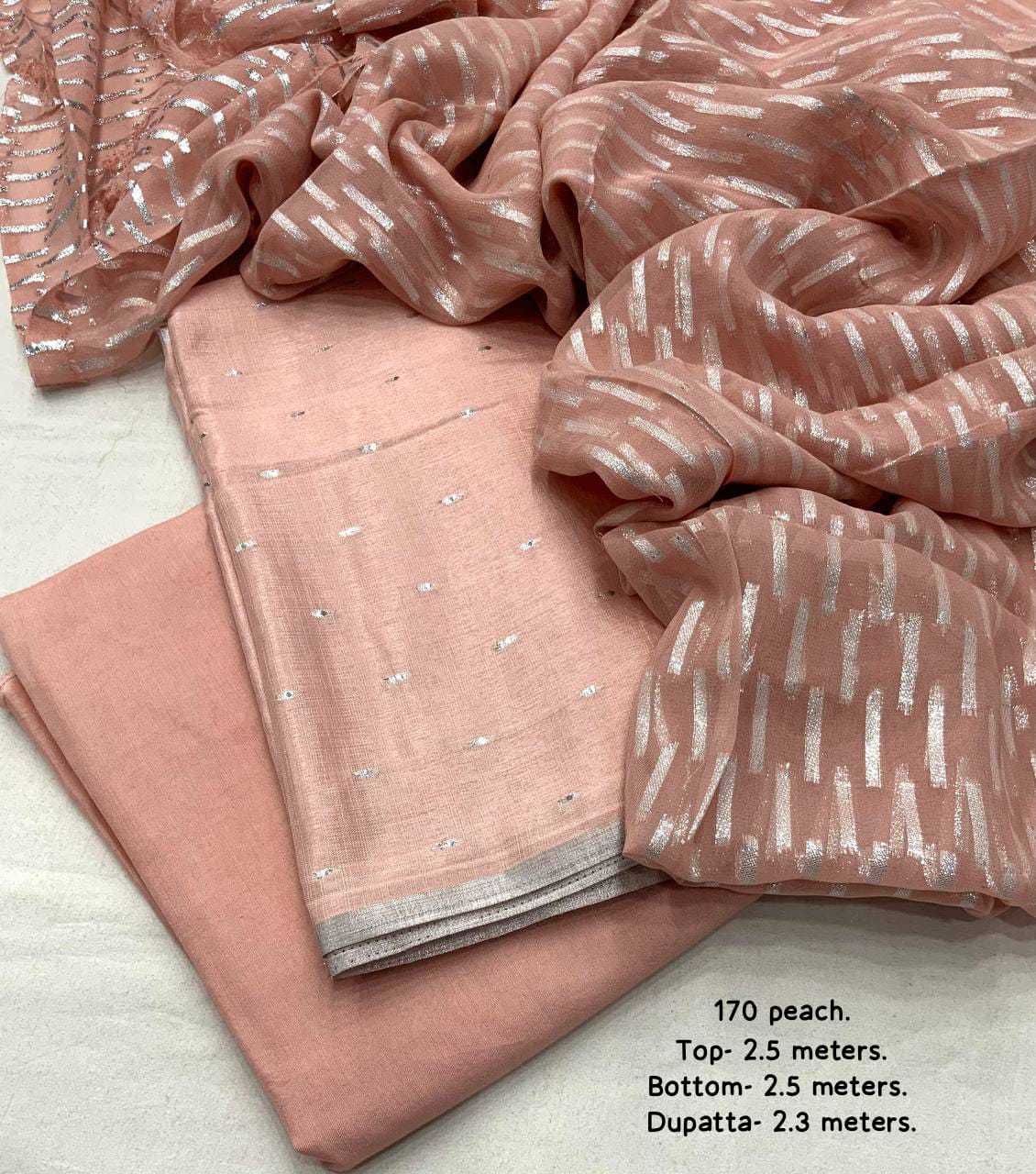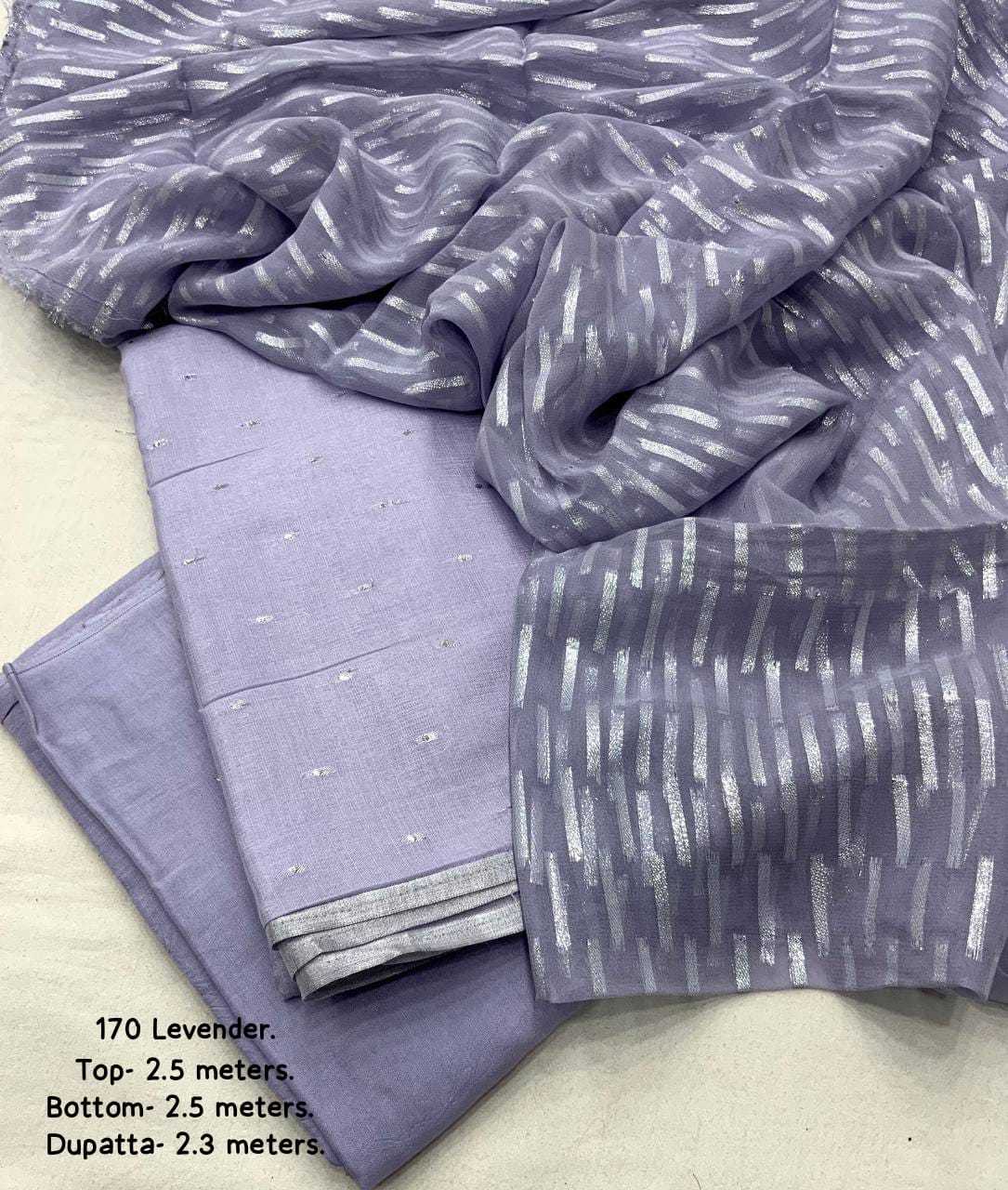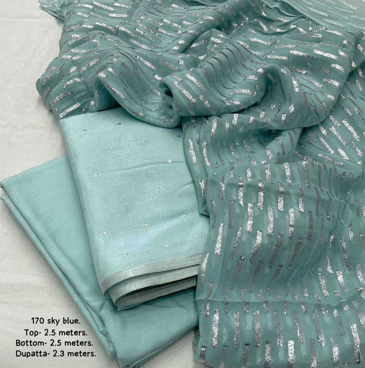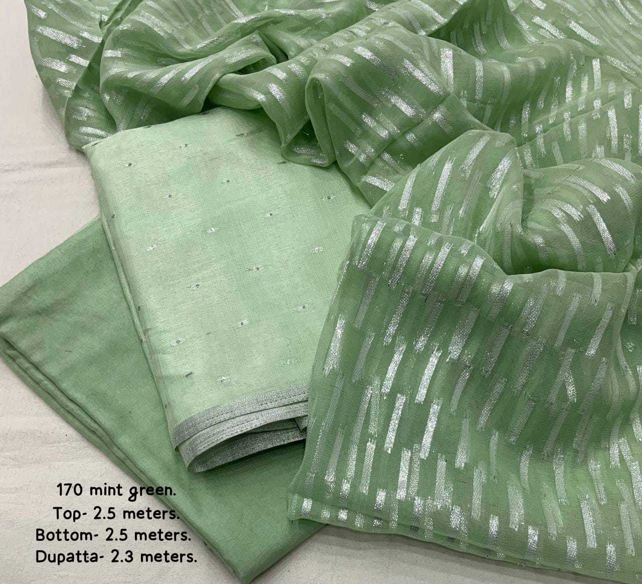 new arrivals New cotton silk unstitched dress materials. KC - 169 KC - cotton silk. Quality- Top- soft cotton silk with silver zari woven butti. Dupatta- pure georgette silver zari woven buttas. Bottom- perefctly matched santoon bottom Messuremnets- Rate - 999/- +ship Top trusted quality |