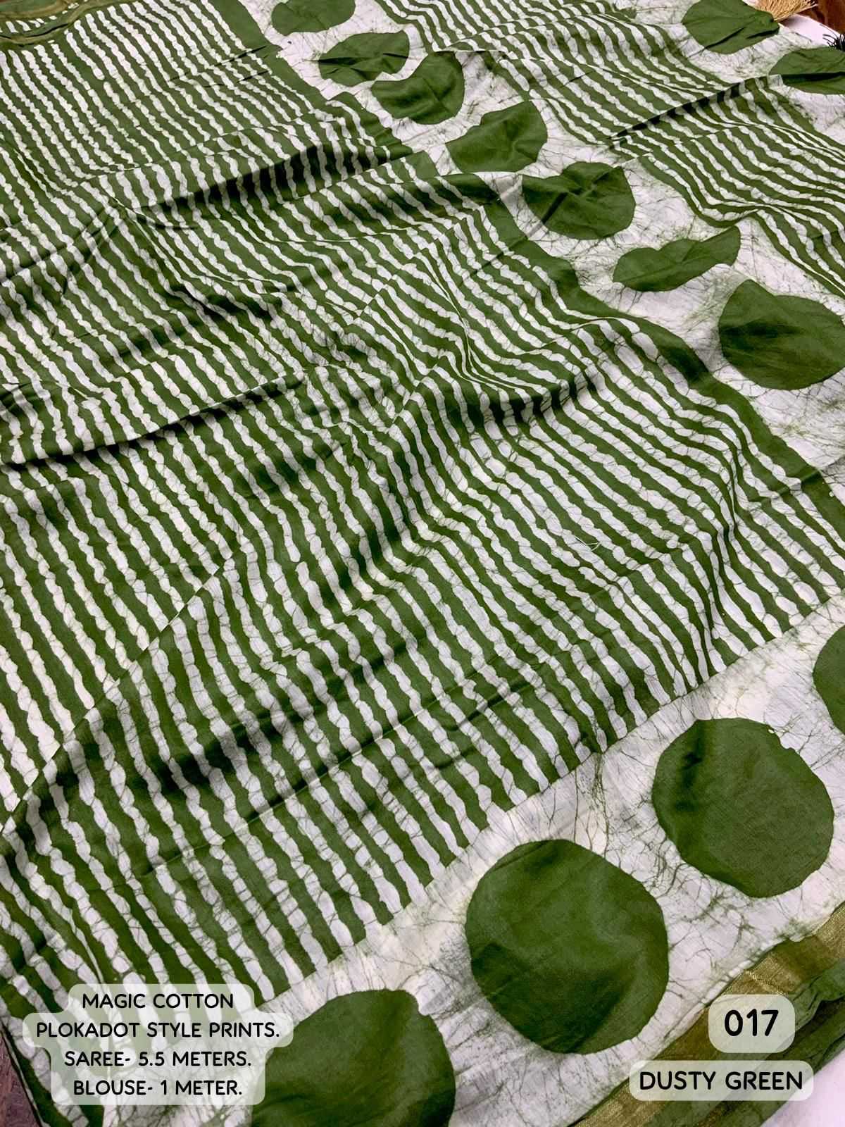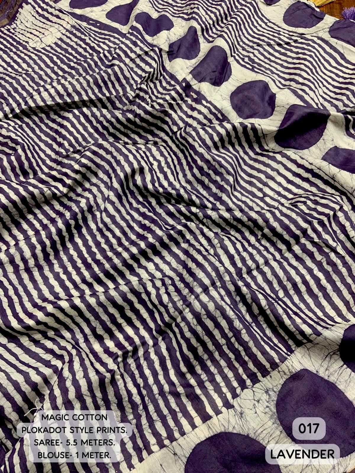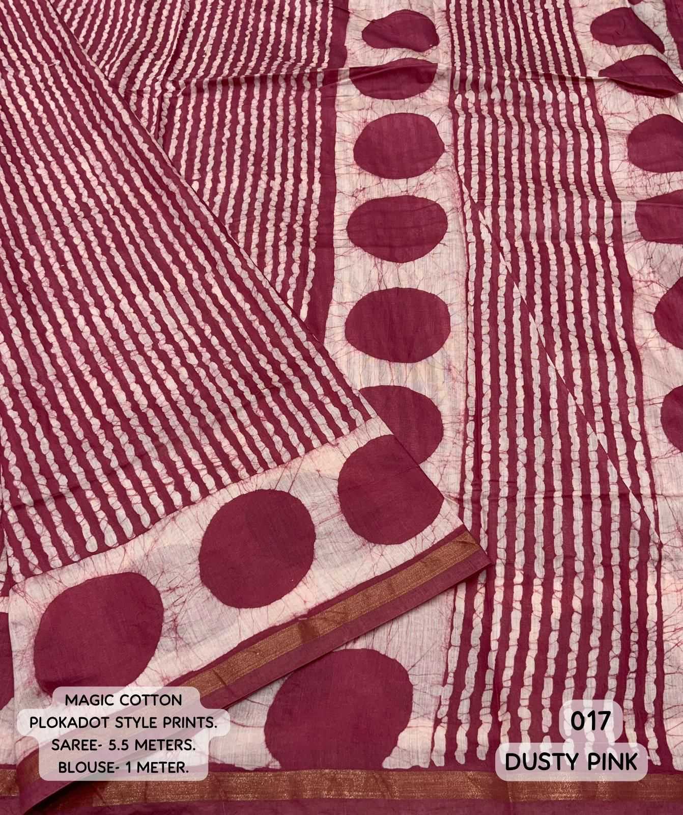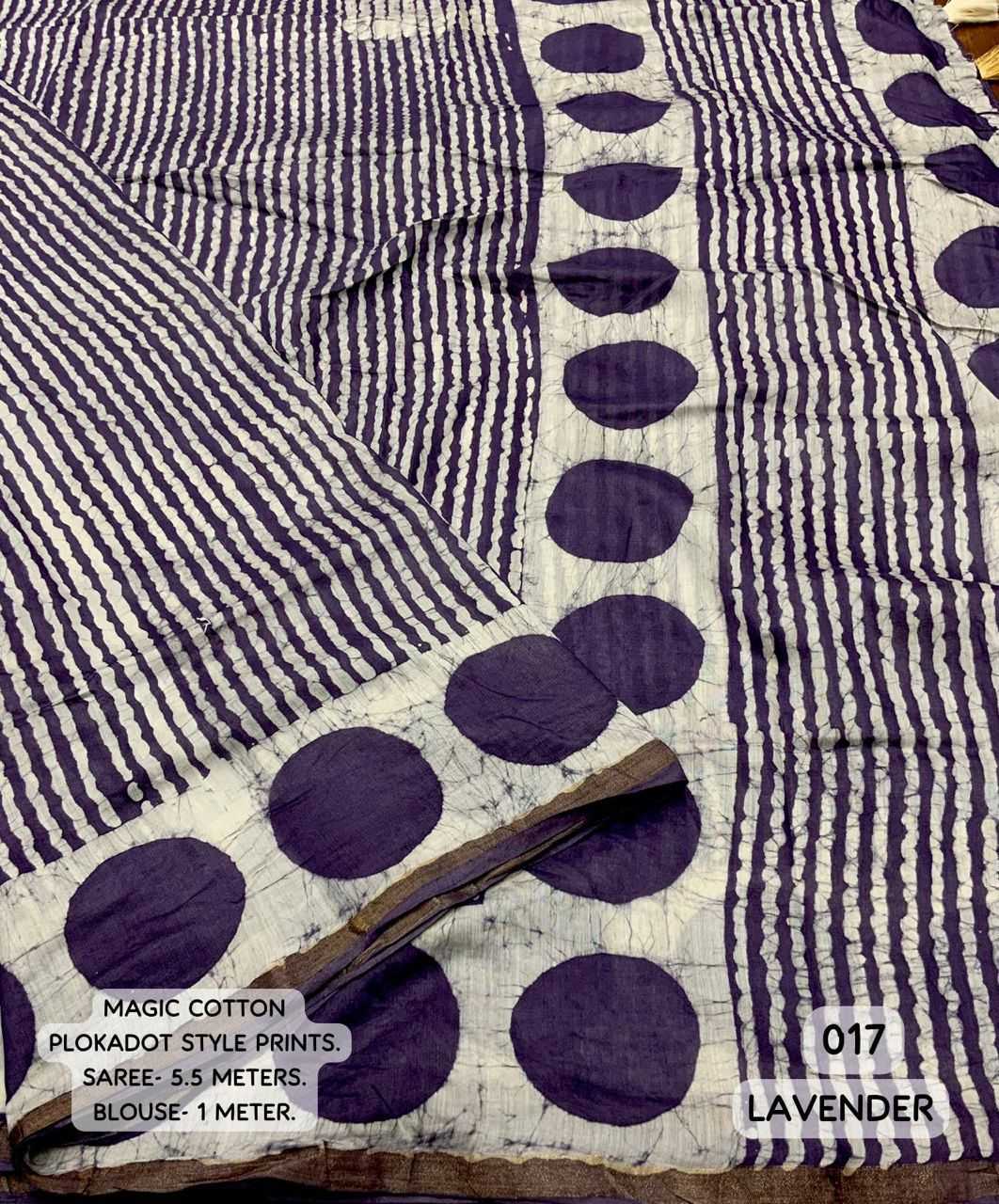 BEST SELLER BACK IN STOCK New magic cotton handblock printed saree. kc- 017 kc - magic cotton (polkadot style) Quality- soft pure cotton saree with handblock printed saree. Zari woven border. Speciality- uneven printing design which give premium look of hand printed saree. Cotton tassels on pallu. Blouse- running pure cotton printed blouse (separate printed design) Rate- 945/- +ship Top premium quality |