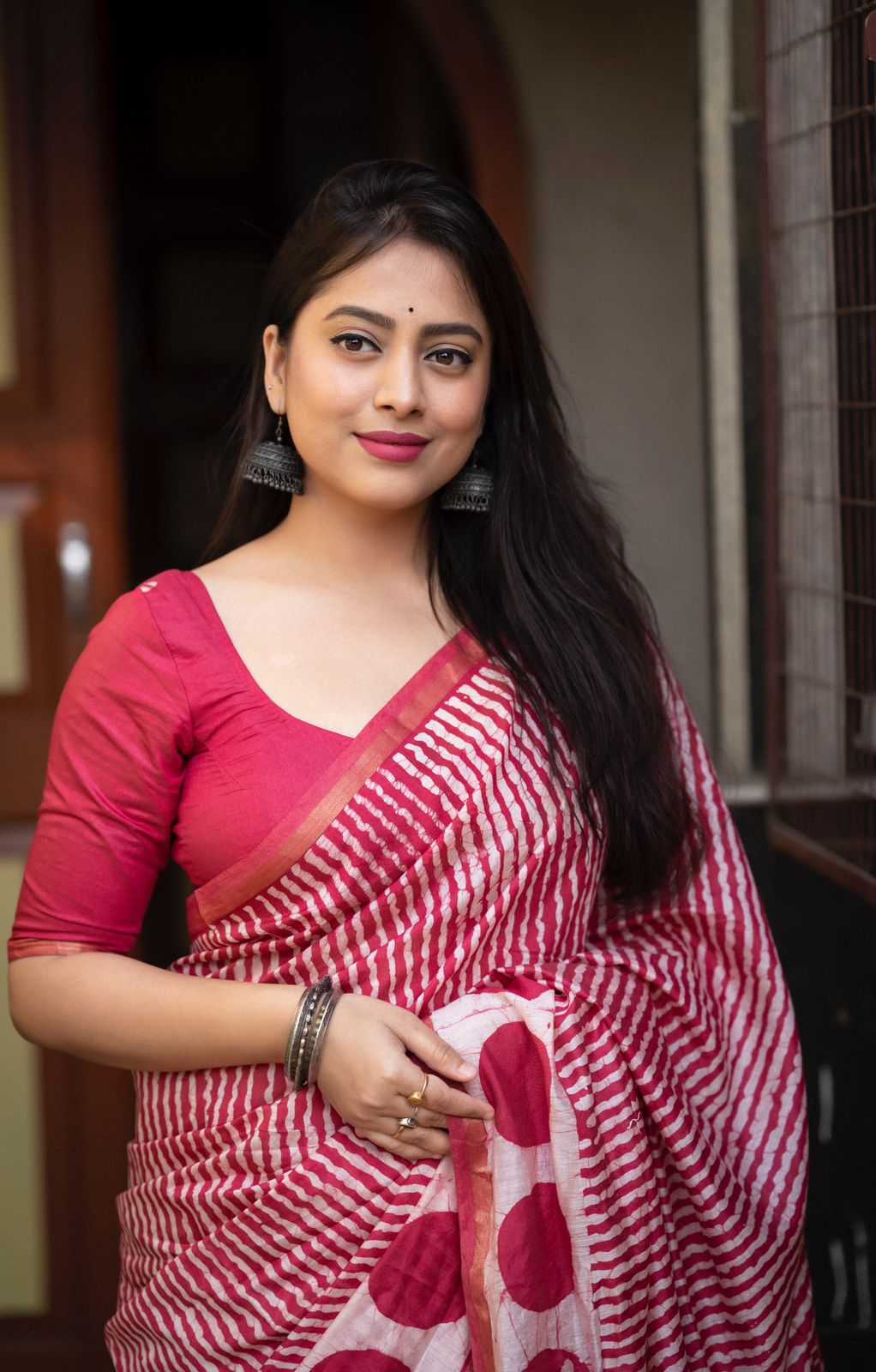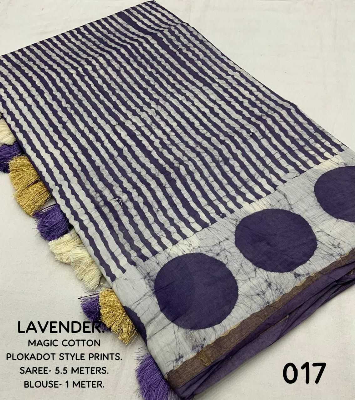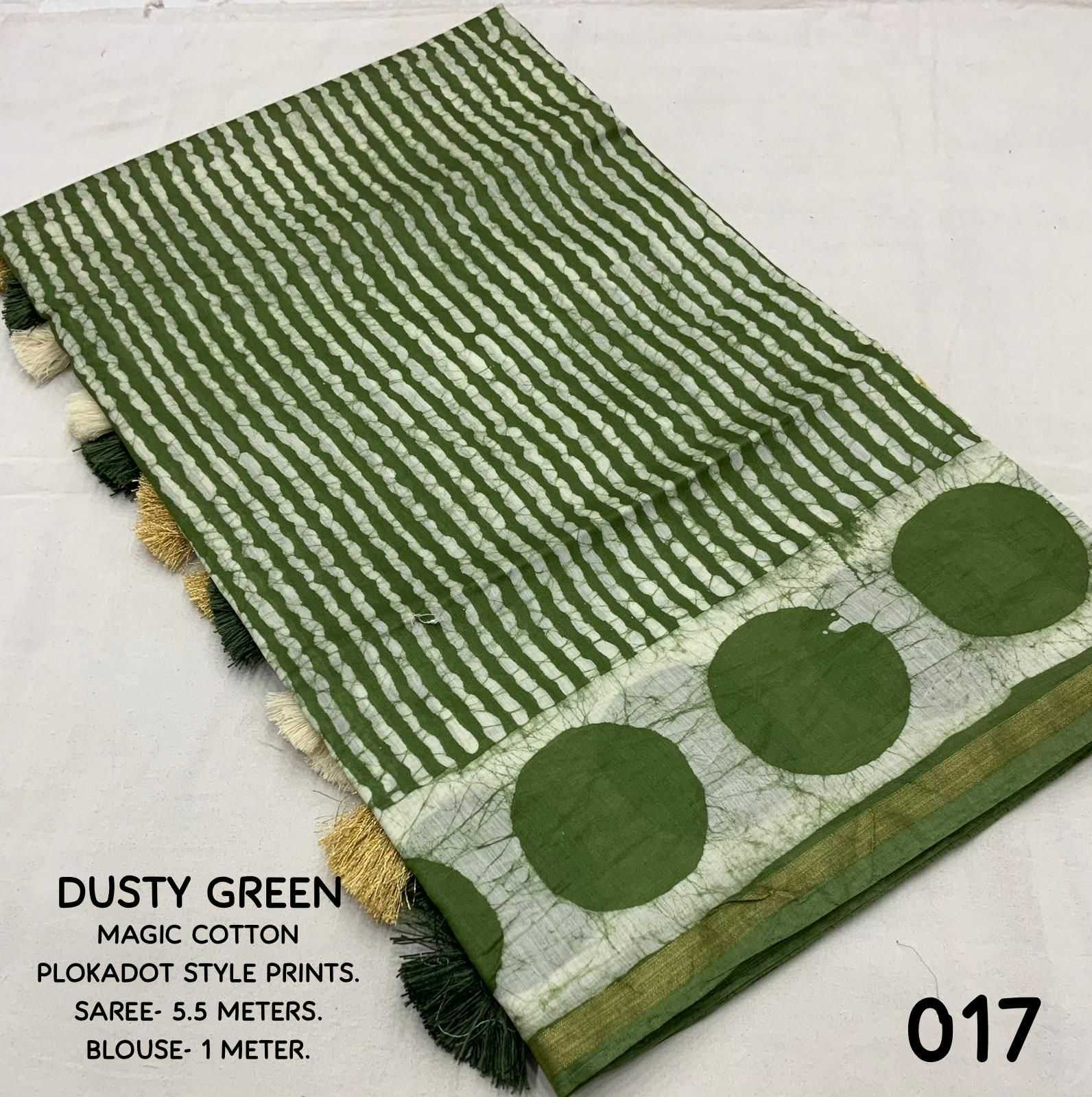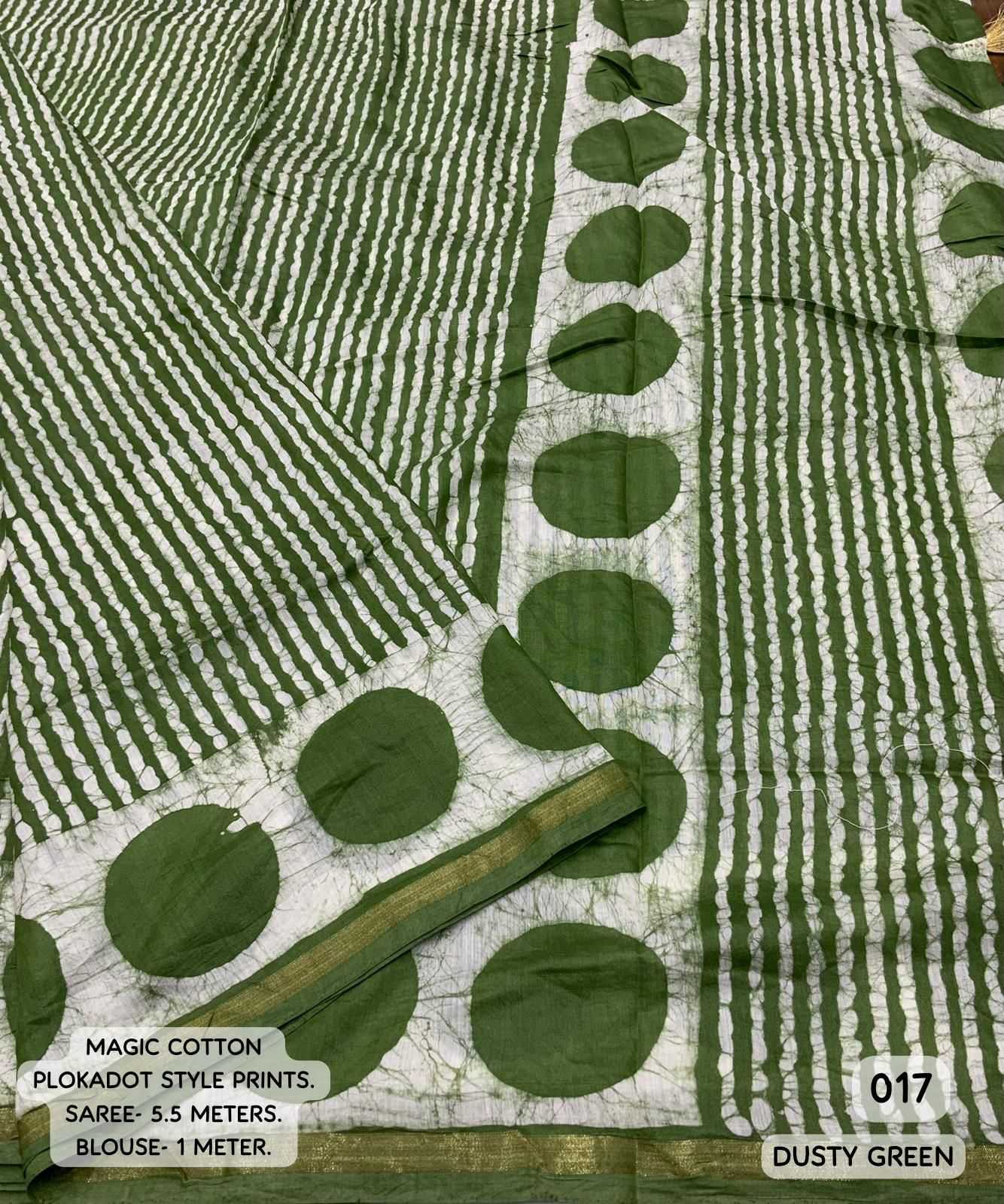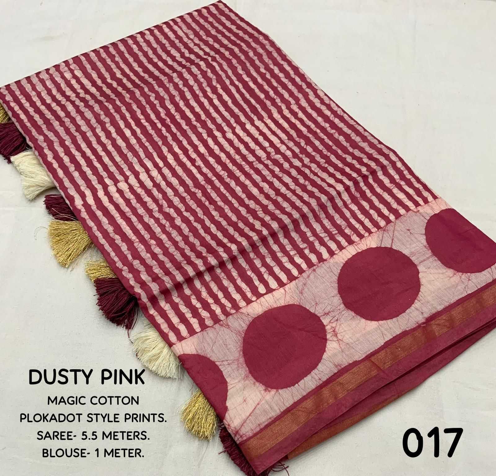 BEST SELLER BACK IN STOCK New magic cotton handblock printed saree. kc- 017 kc - magic cotton (polkadot style) Quality- soft pure cotton saree with handblock printed saree. Zari woven border. Speciality- uneven printing design which give premium look of hand printed saree. Cotton tassels on pallu. Blouse- running pure cotton printed blouse (separate printed design) Rate- 945/- +ship Top premium quality |