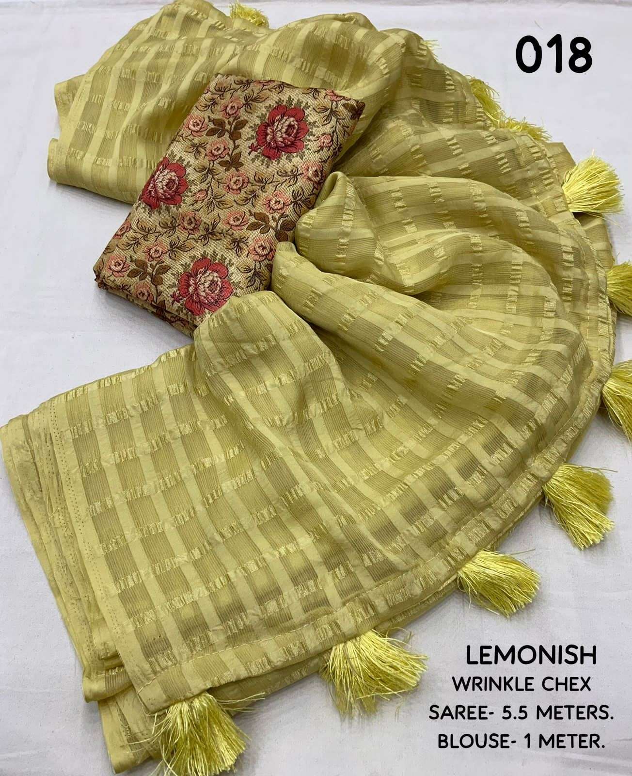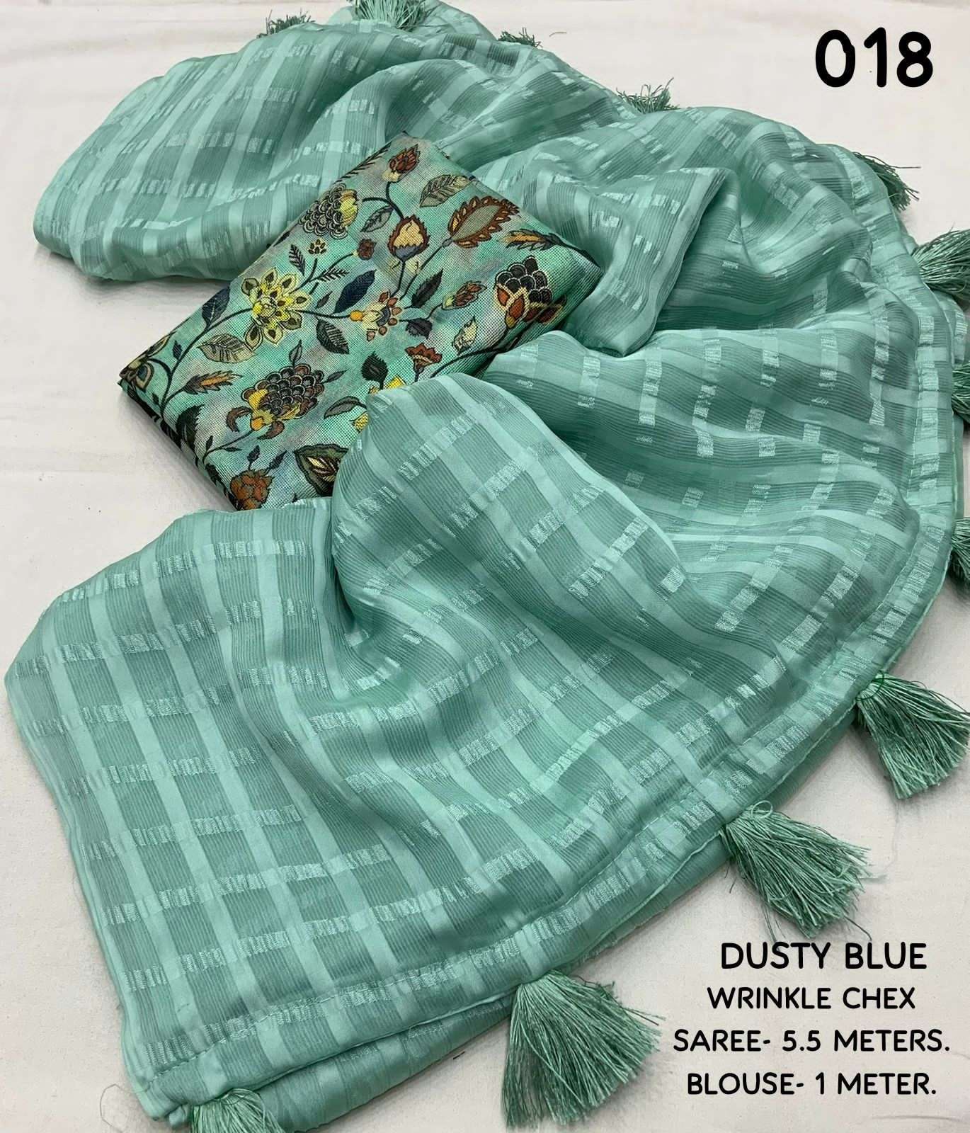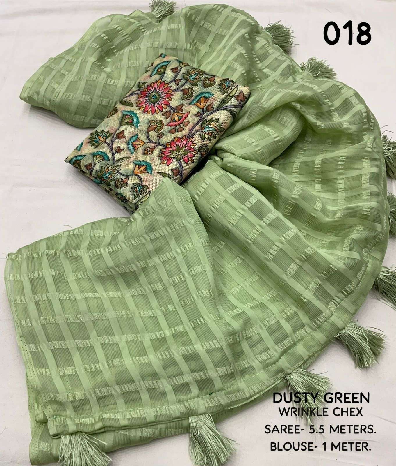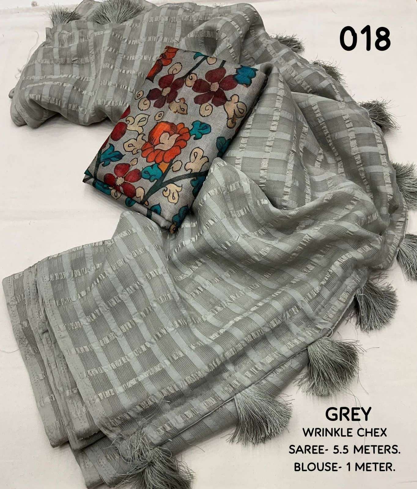 best seller back in stock New chiffon chex saree KC- 18 KC- wringle chex Quality- soft georgette with wrinkle style woven chex. Tassels on pallu. Blouse- perfectly matched jute printed blouse. Rate- 549+ship Top trusted quality |