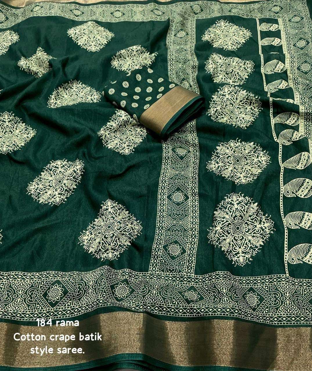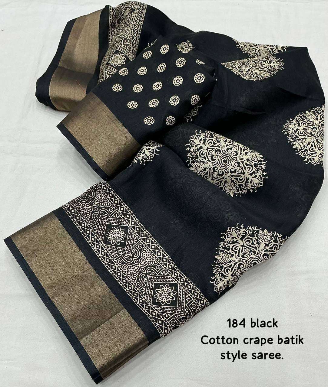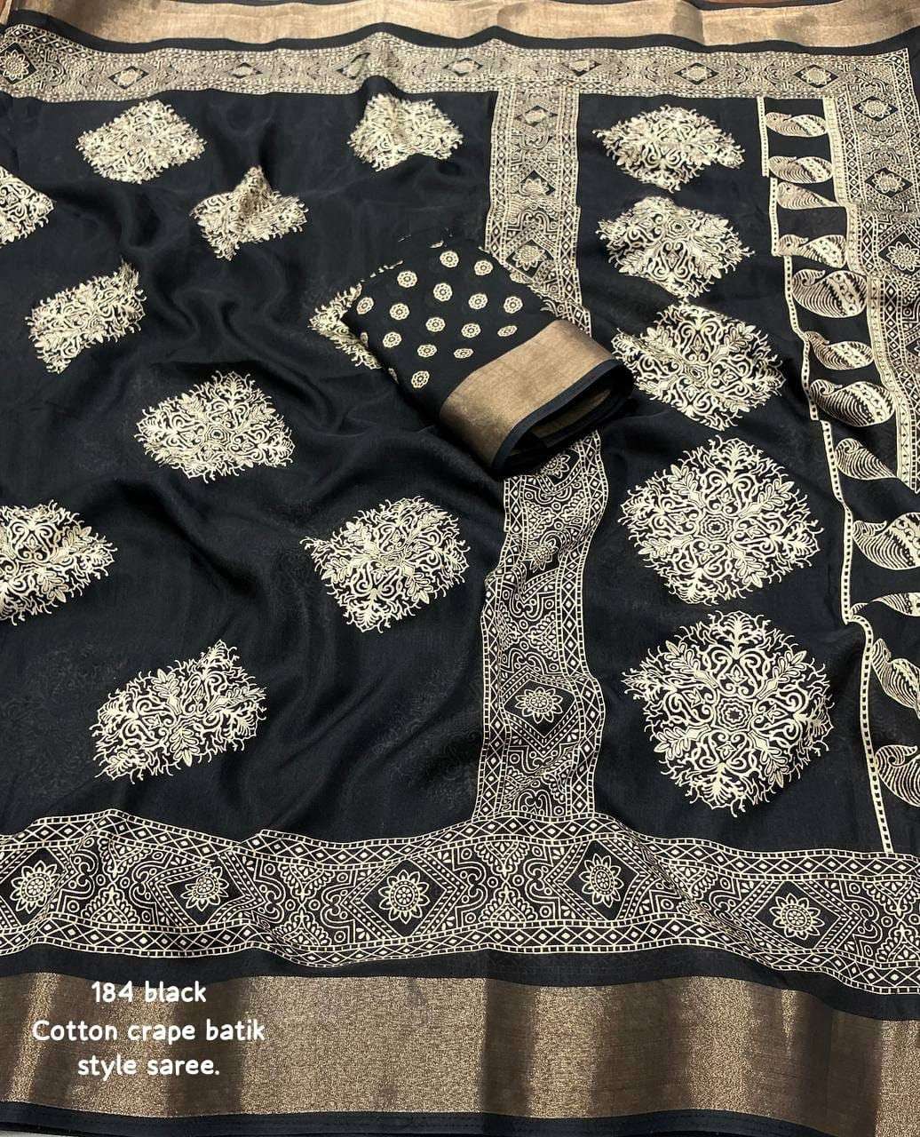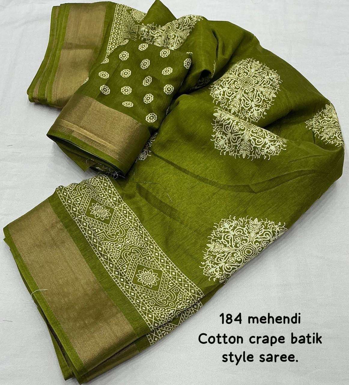 new arrivals New batik printed cotton crape saree KC- 184 KC- batik beauty. Quality- soft cotton crape saree zari woven pattu border. Batik style prints. Blouse- running cotton crape blouse. Rate - 450+ship Top trusted quality |