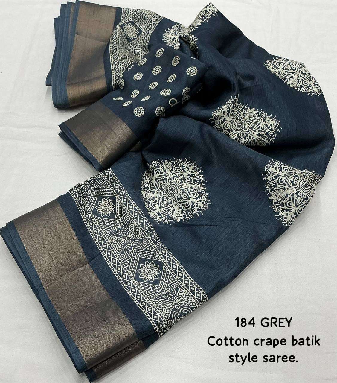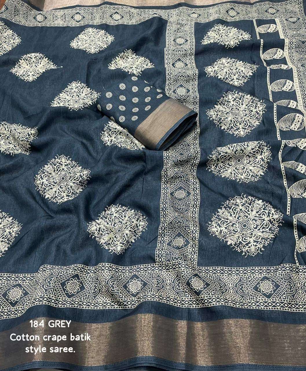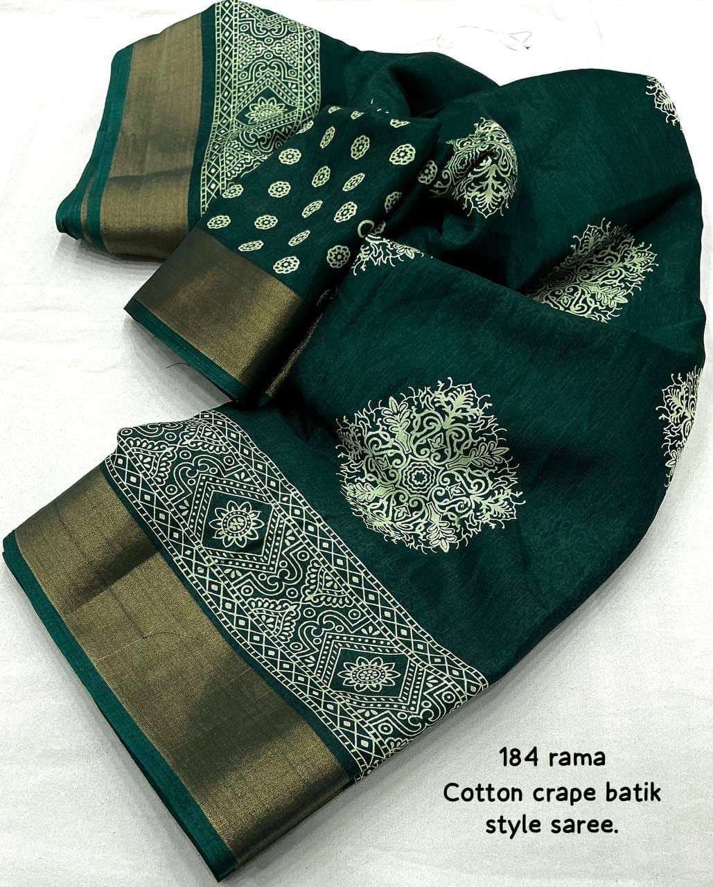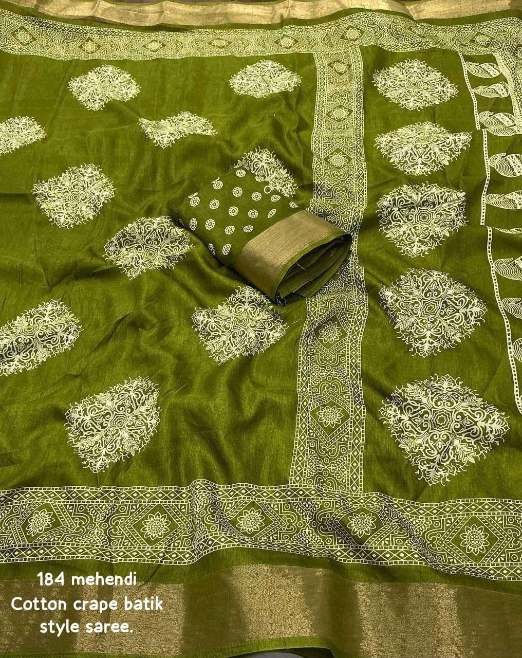 new arrivals New batik printed cotton crape saree KC- 184 KC- batik beauty. Quality- soft cotton crape saree zari woven pattu border. Batik style prints. Blouse- running cotton crape blouse. Rate - 450+ship Top trusted quality |